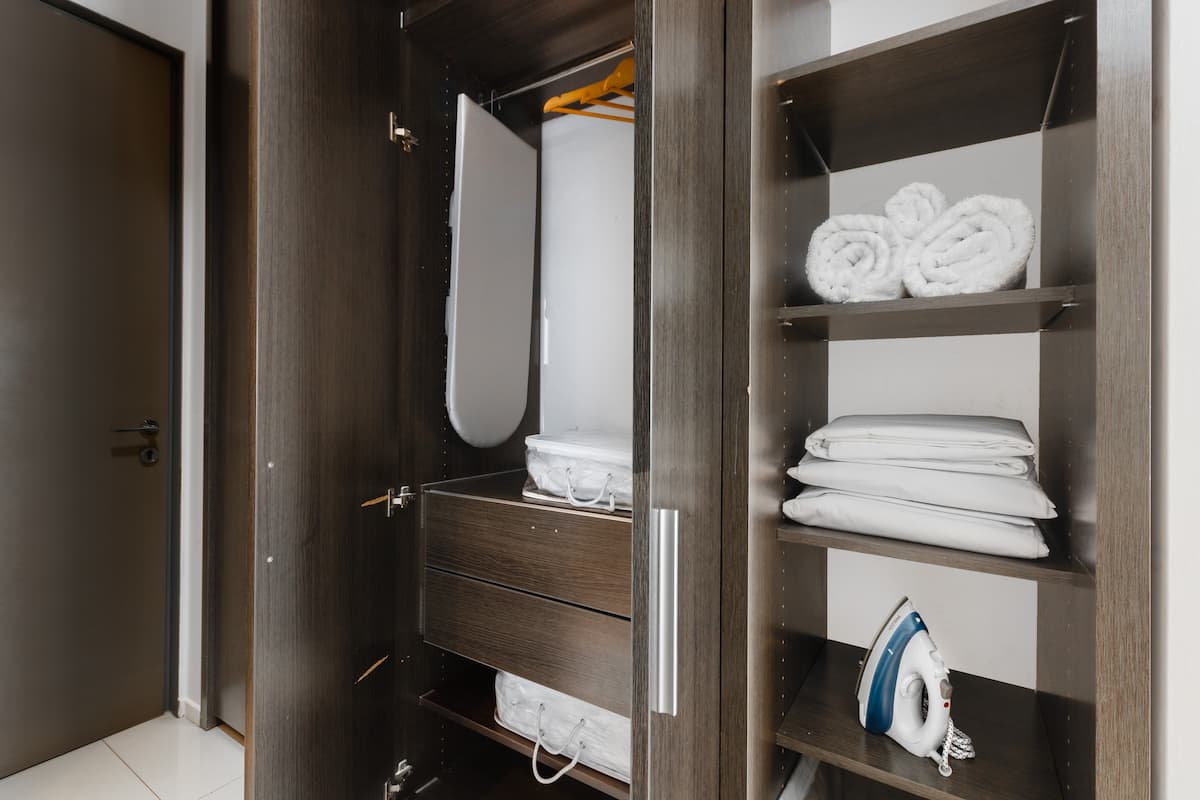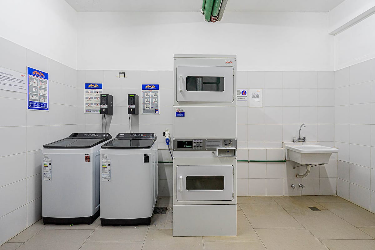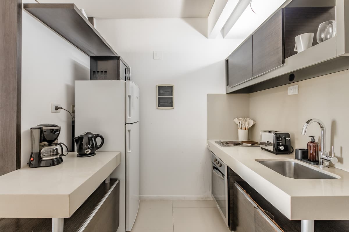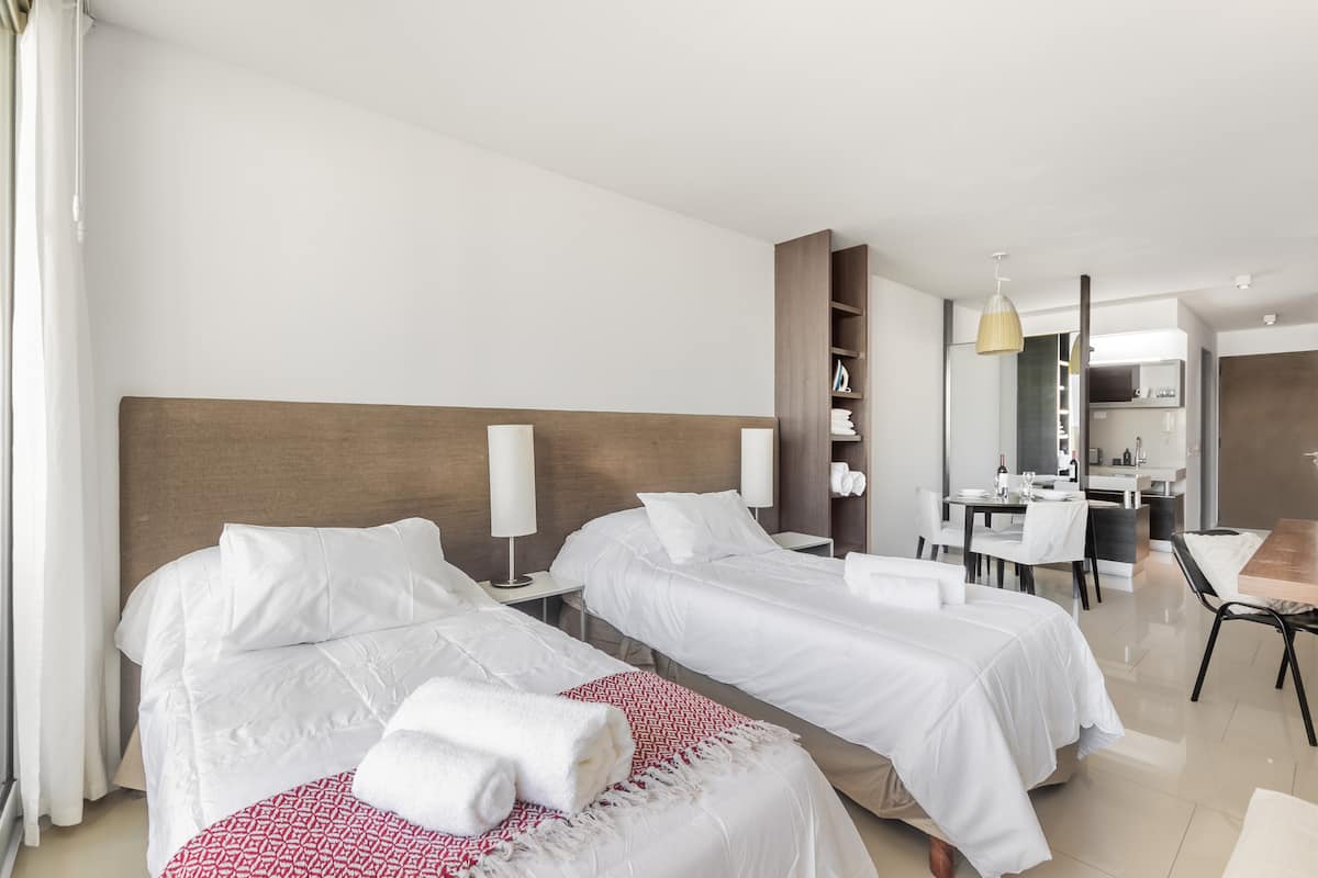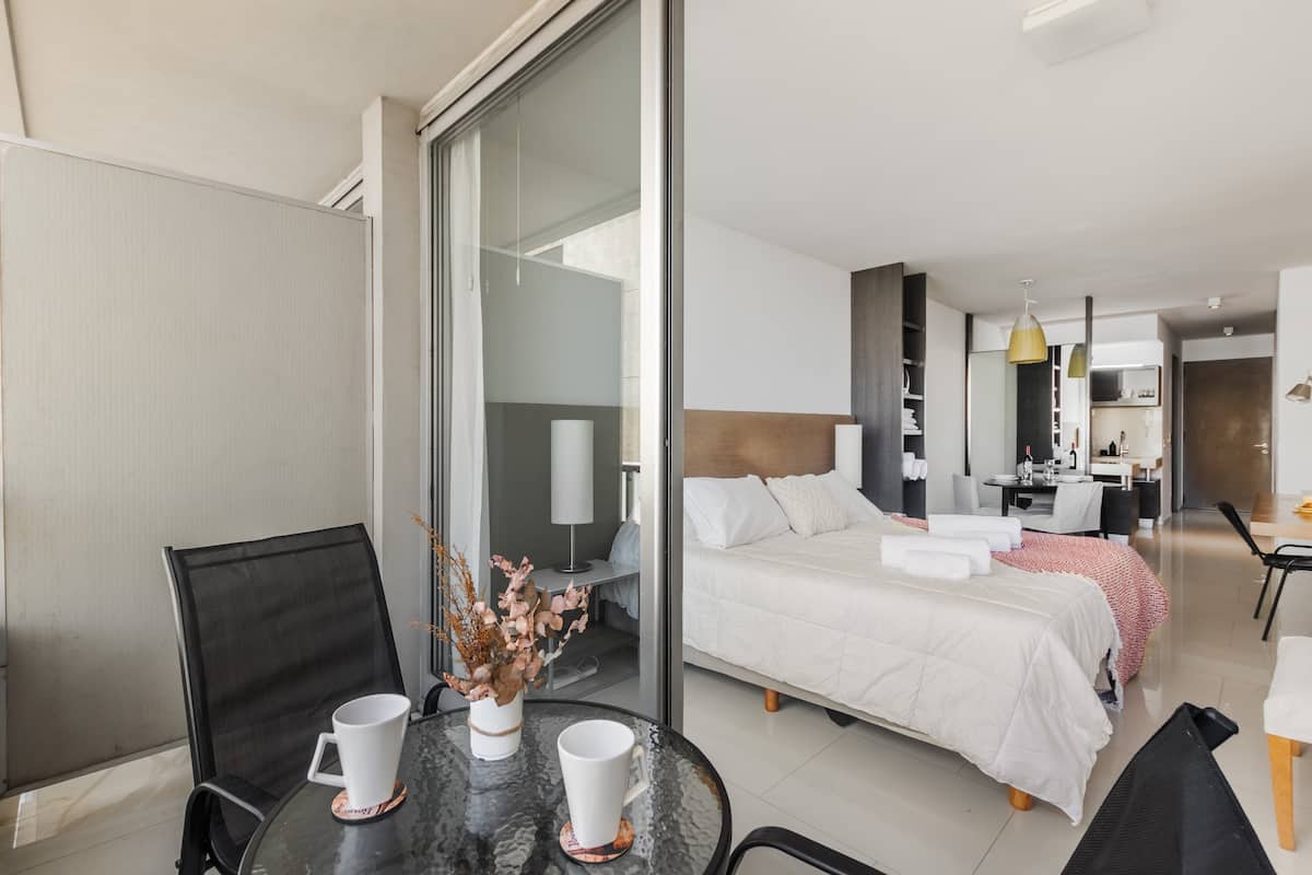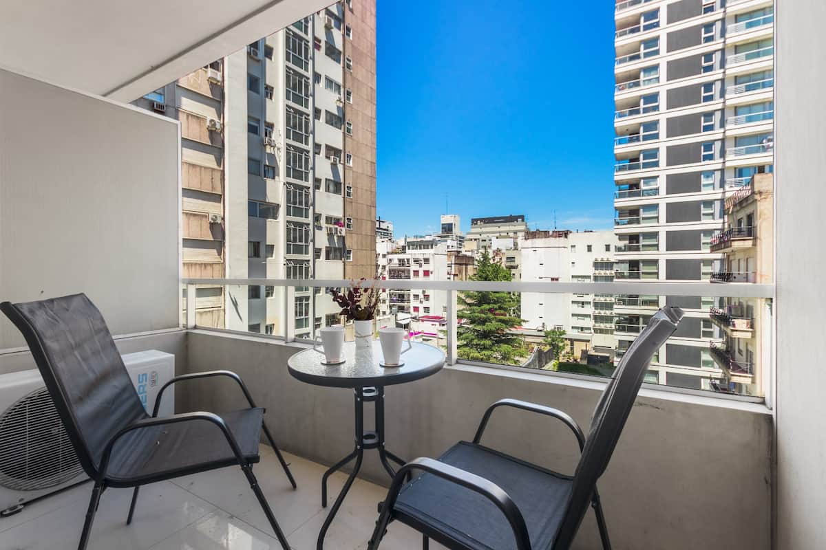 Studio no 7º andar, na parte dos fundos do prédio, entre as ruas Güemes e Thames, com cozinha semi-integrada. O apartamento tem banheiro completo com banheira e secador de cabelo, além de ar-condicionado split com aquecimento e opção de resfriamento. Há varanda com mesa e cadeiras e vista aberta. O imóvel dispõe de Wi-Fi de 300 MB, TV com decodificador FLOW, cortinas blackout, mesa de jantar para 3 pessoas e cama em box spring twin (80 cm x 1,90 m) para 2 unidades ou opção de king (1,80 m x 1,90