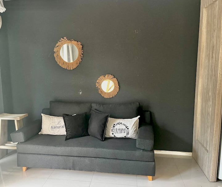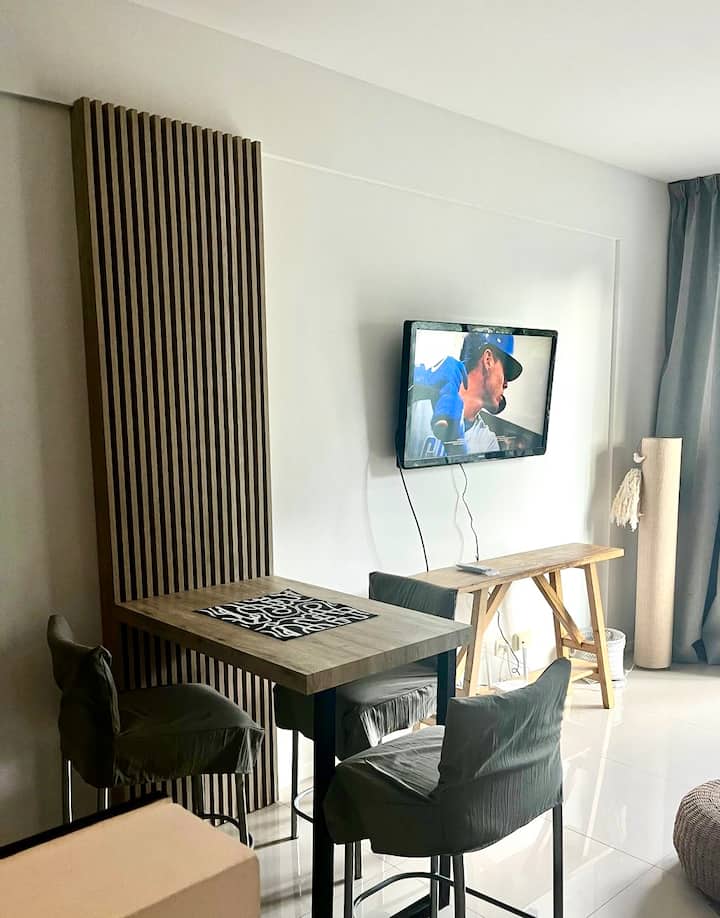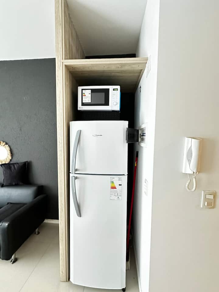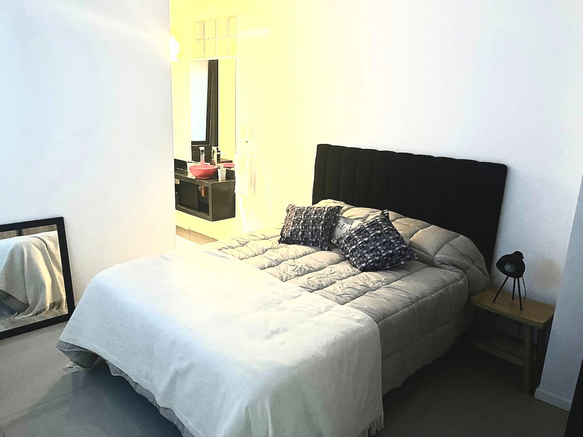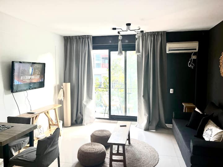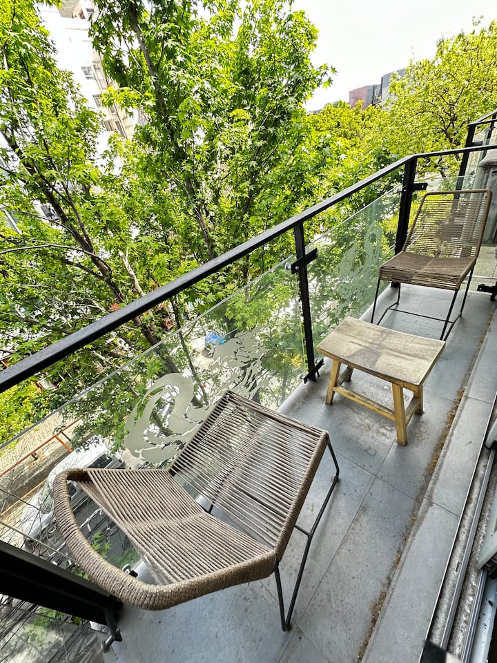 Apartamento em Palermo com sacada voltada para a rua e muita incidência de luz. Área de estar com sofá-cama, mesa de centro e saída para a sacada, com cadeiras e mesa. Ar-condicionado com função frio e quente; cozinha com bancada para refeições, fogão elétrico, geladeira com freezer, micro-ondas, chaleira elétrica e torradeira, além de utensílios. Quarto com cama de casal, armário e criado-mudo, com Smart TV. Banheiro completo.