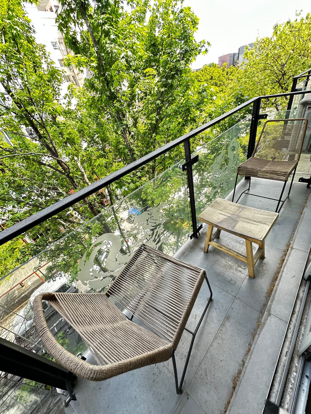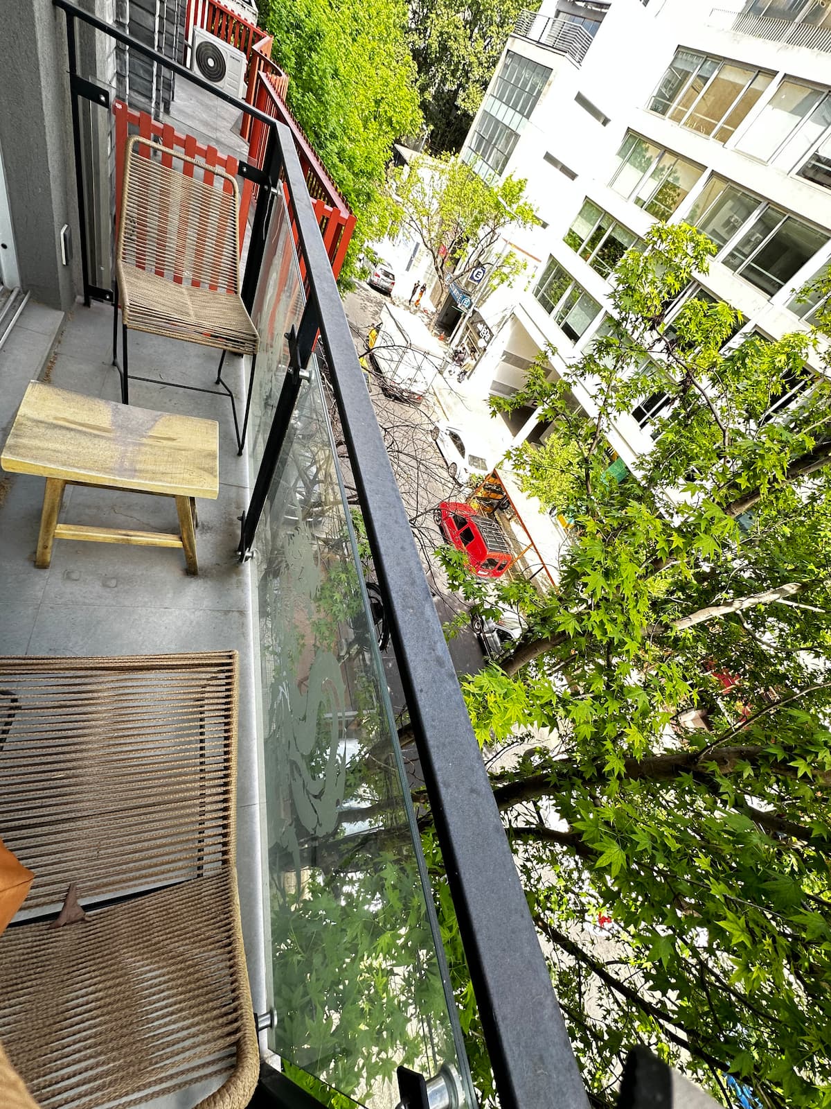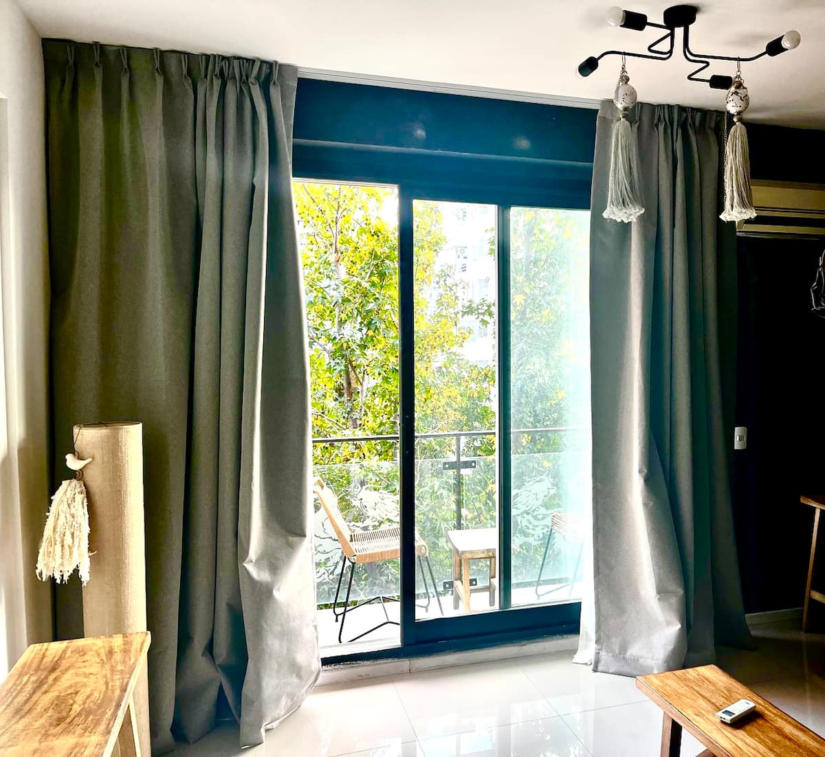 Apartamento em Palermo com sacada voltada para a rua e muita incidência de luz. Área de estar com sofá-cama, mesa de centro e saída para a sacada, com cadeiras e mesa. Ar-condicionado com função frio e quente; cozinha com bancada para refeições, fogão elétrico, geladeira com freezer, micro-ondas, chaleira elétrica e torradeira, além de utensílios. Quarto com cama de casal, armário e criado-mudo, com Smart TV. Banheiro completo.