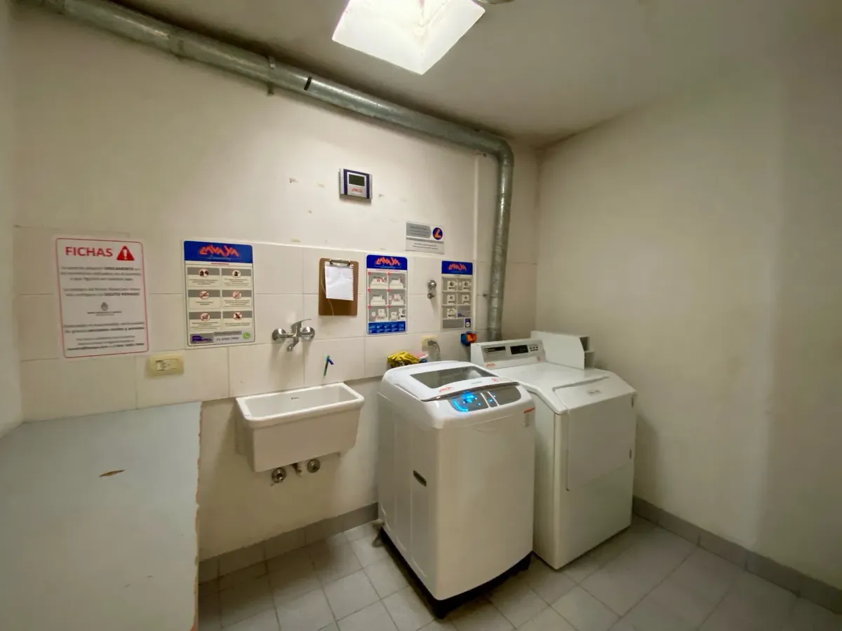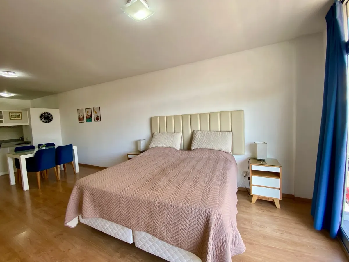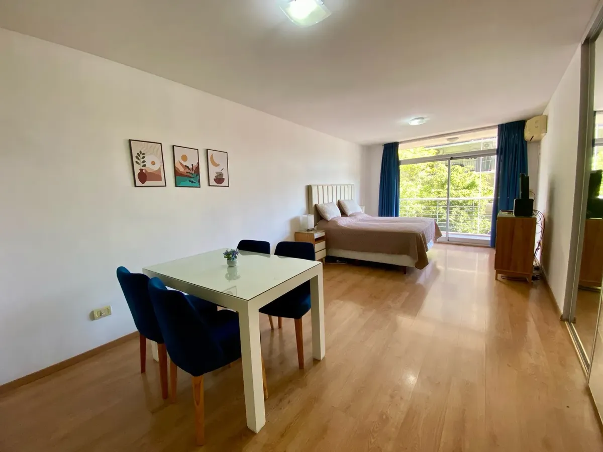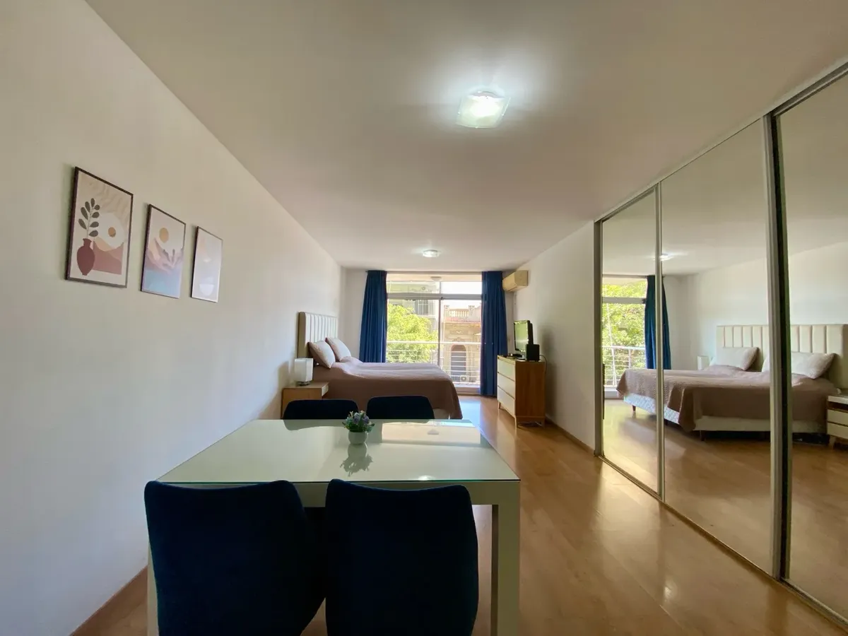 Kitnet mobiliada, de frente para a rua, com cozinha semi integrada e área principal equipada com mesa para 4 pessoas, cama de casal, mesas laterais e rack com TV. Possui armário com portas espelhadas e balcão de frente. Inclui banheiro completo, além de terraço com piscina, área de churrasco e lavanderia (laundry). Contrato de 2 anos, com 1 mês de adiantamento e 2 meses de depósito; é exigida fiança de aluguel ou garantia de CABA, mediante comprovação de renda.