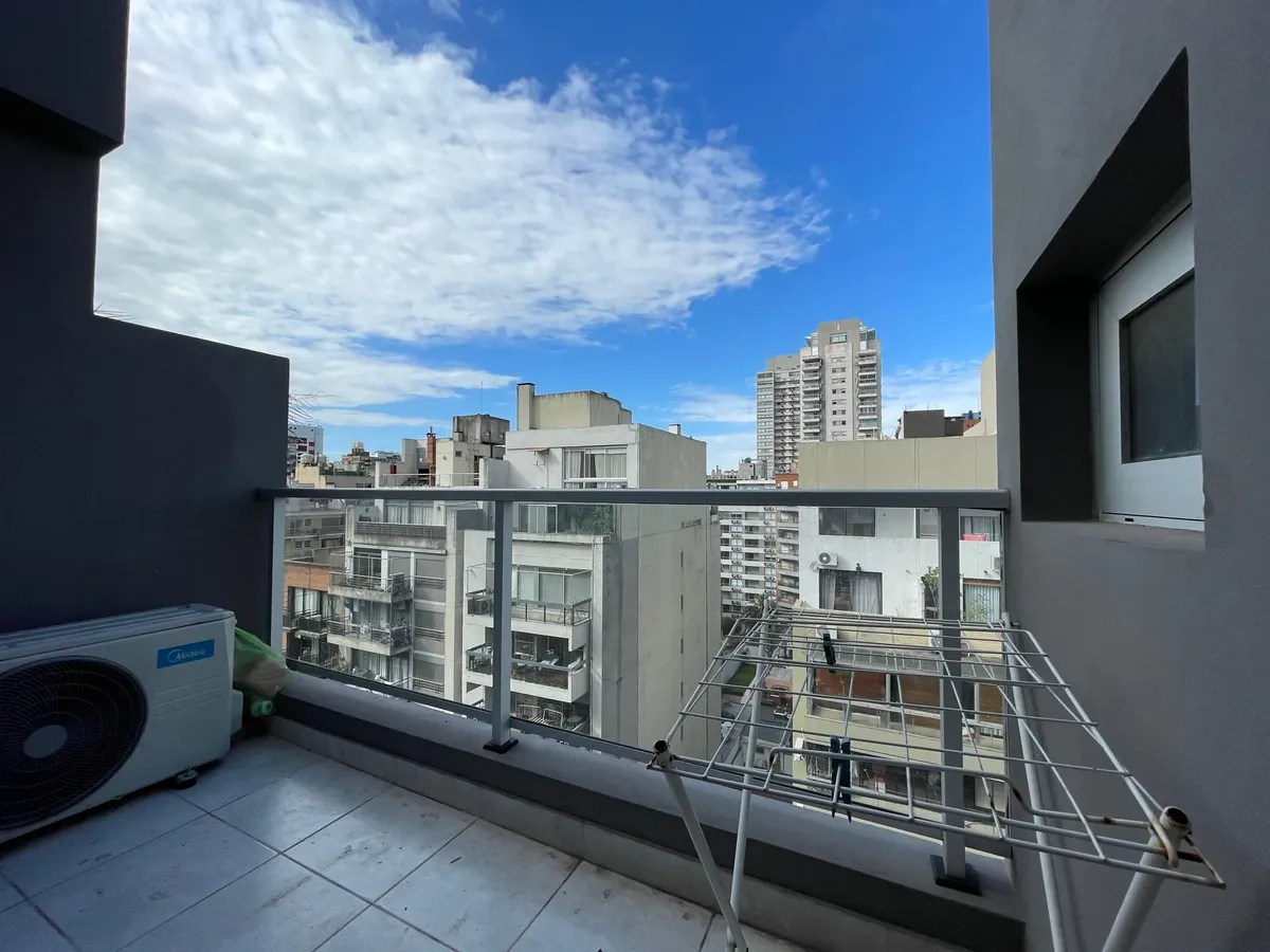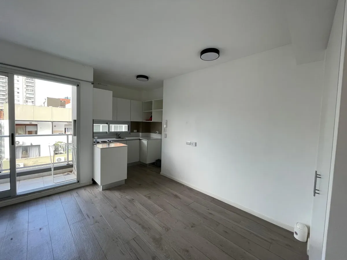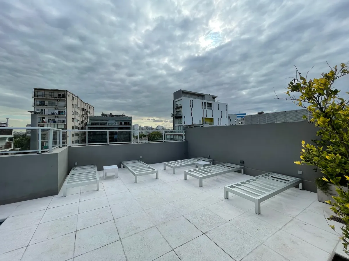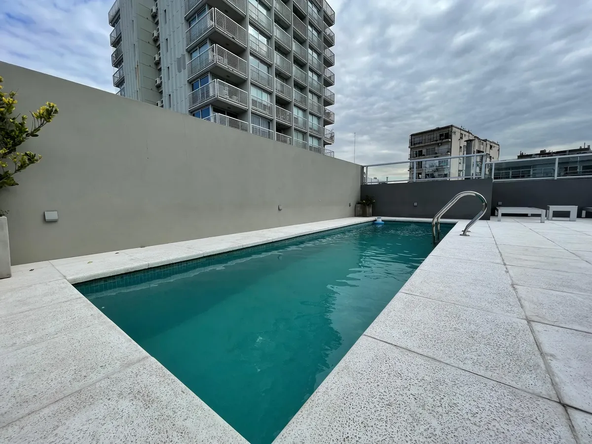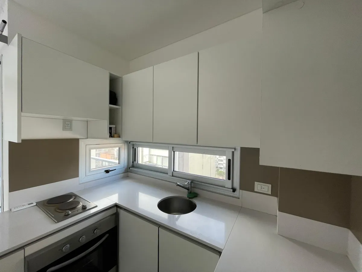 Apartamento de 1 ambiente (kitnet), sem mobília, com varanda, em Palermo. O imóvel tem ar-condicionado (frio/calor) e cozinha integrada com espaço de armazenamento, fogão elétrico (anafe) e forno. O banheiro tem box com ducha. O prédio oferece SUM, terraço com áreas de churrasco, solarium e piscina. Aluguel temporário: US$ 600 + despesas; condomínio aproximado de US$ 129.000. Disponível em 1/05.