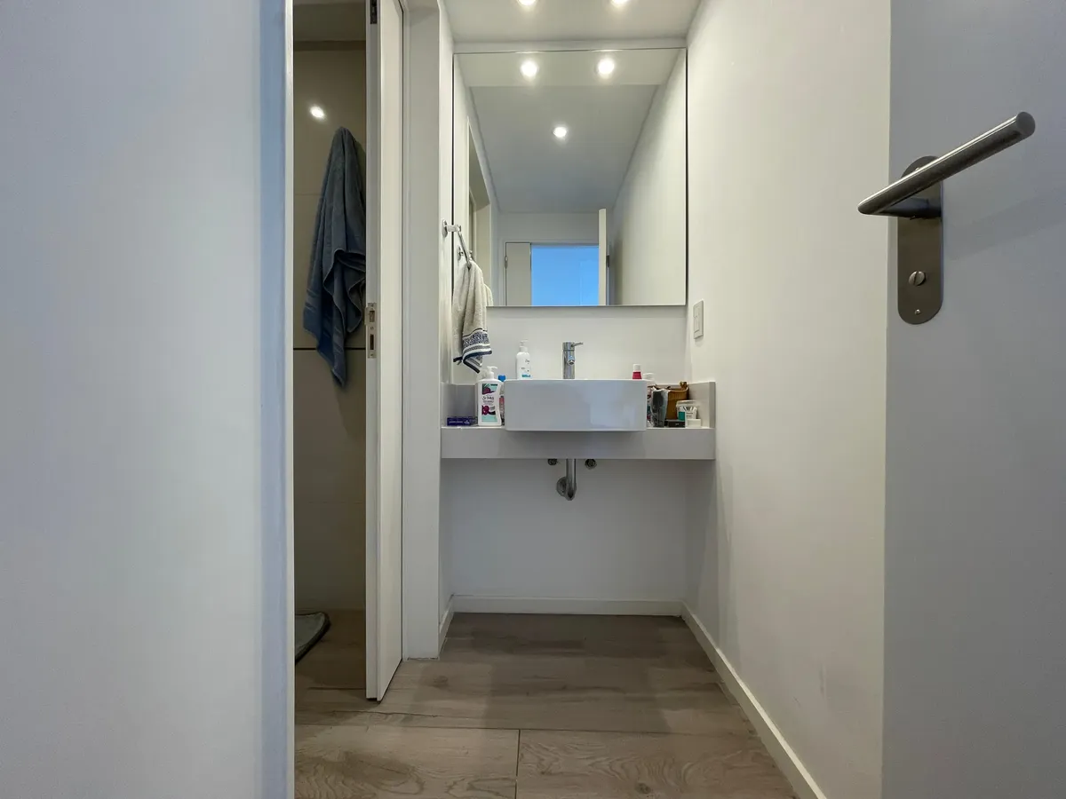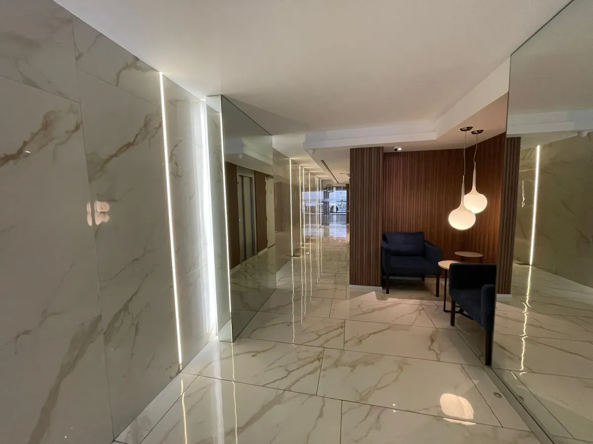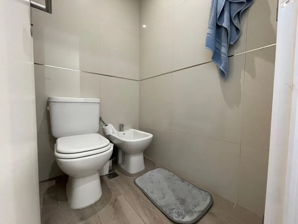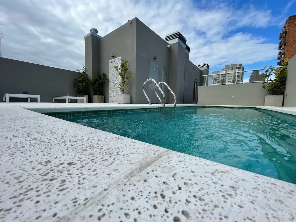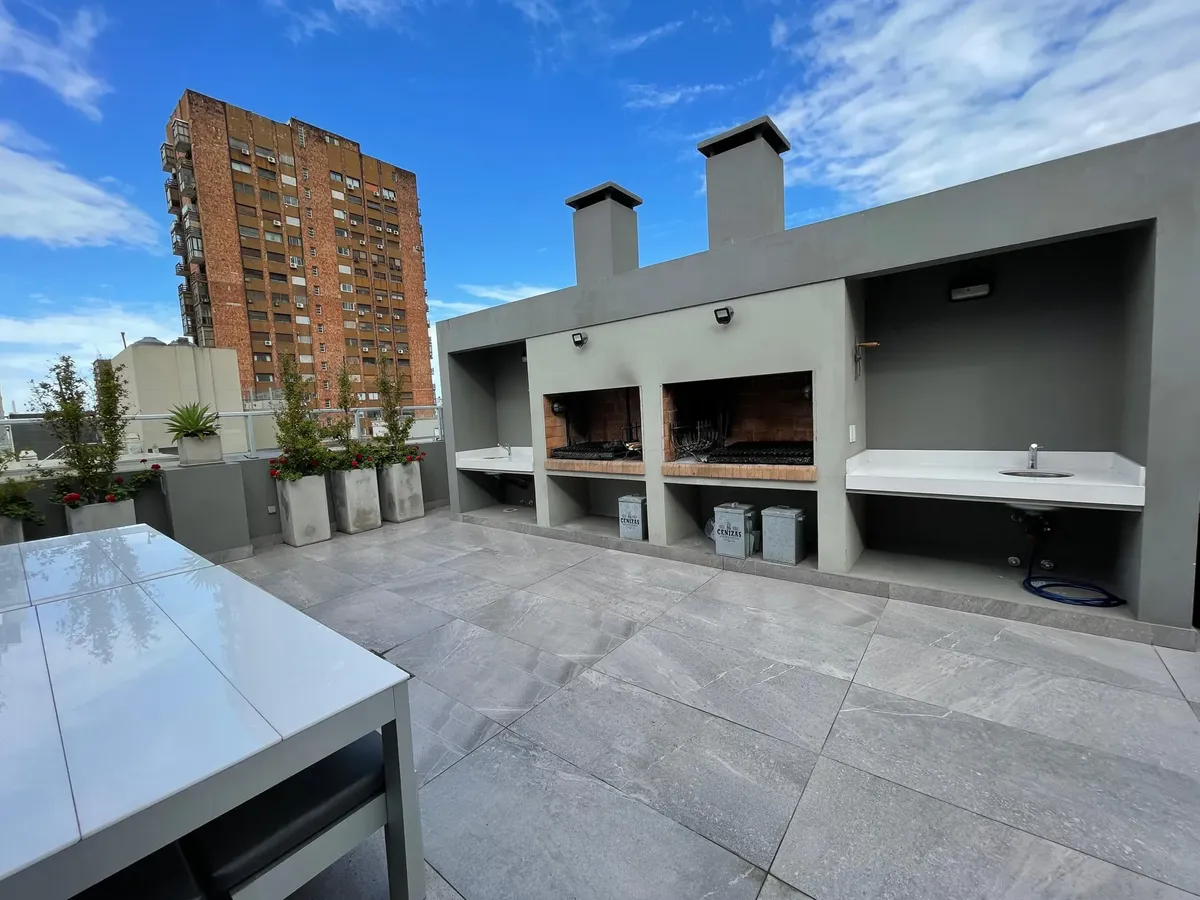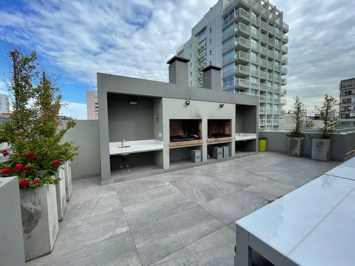 Apartamento de 1 ambiente (kitnet), sem mobília, com varanda, em Palermo. O imóvel tem ar-condicionado (frio/calor) e cozinha integrada com espaço de armazenamento, fogão elétrico (anafe) e forno. O banheiro tem box com ducha. O prédio oferece SUM, terraço com áreas de churrasco, solarium e piscina. Aluguel temporário: US$ 600 + despesas; condomínio aproximado de US$ 129.000. Disponível em 1/05.