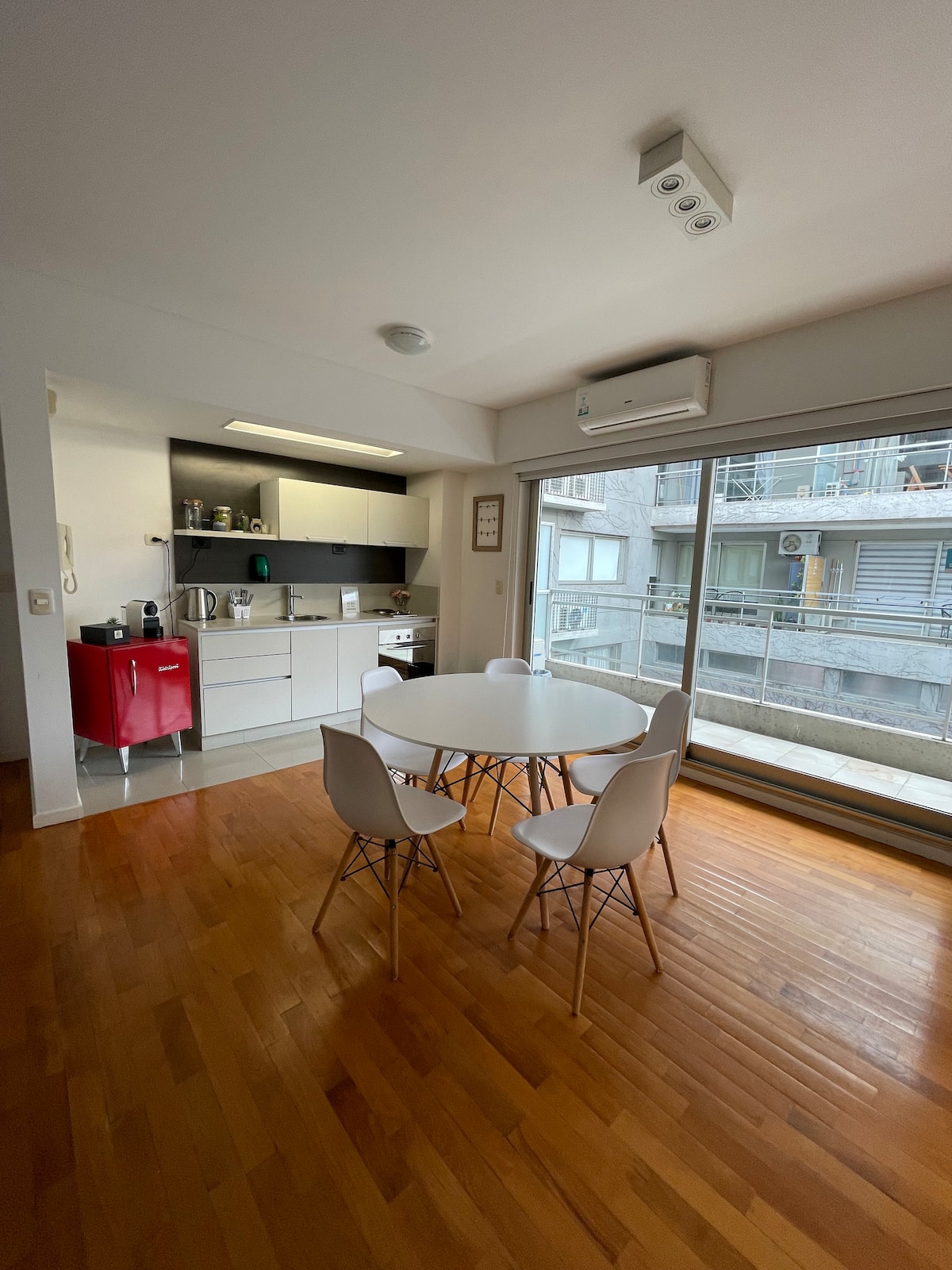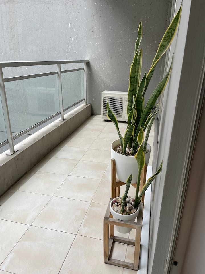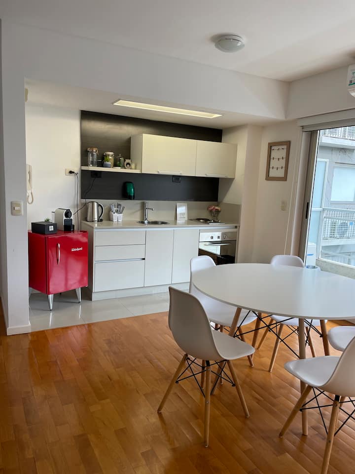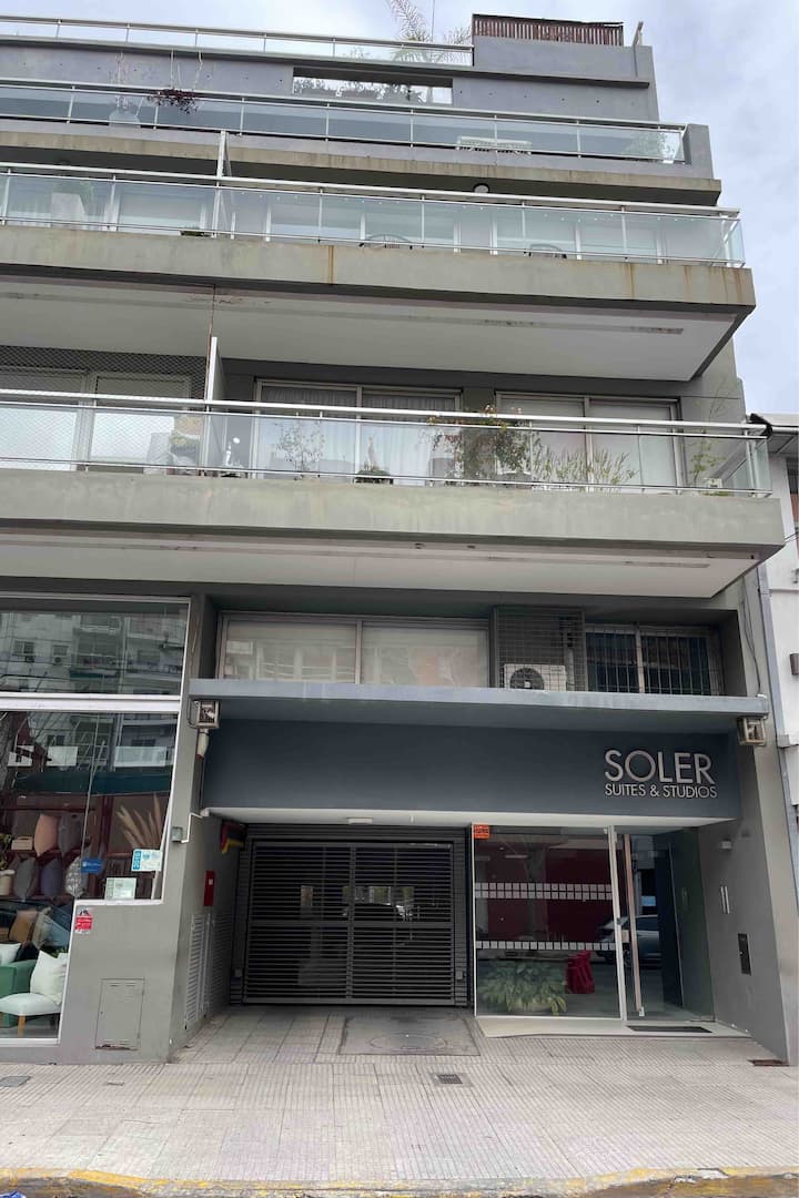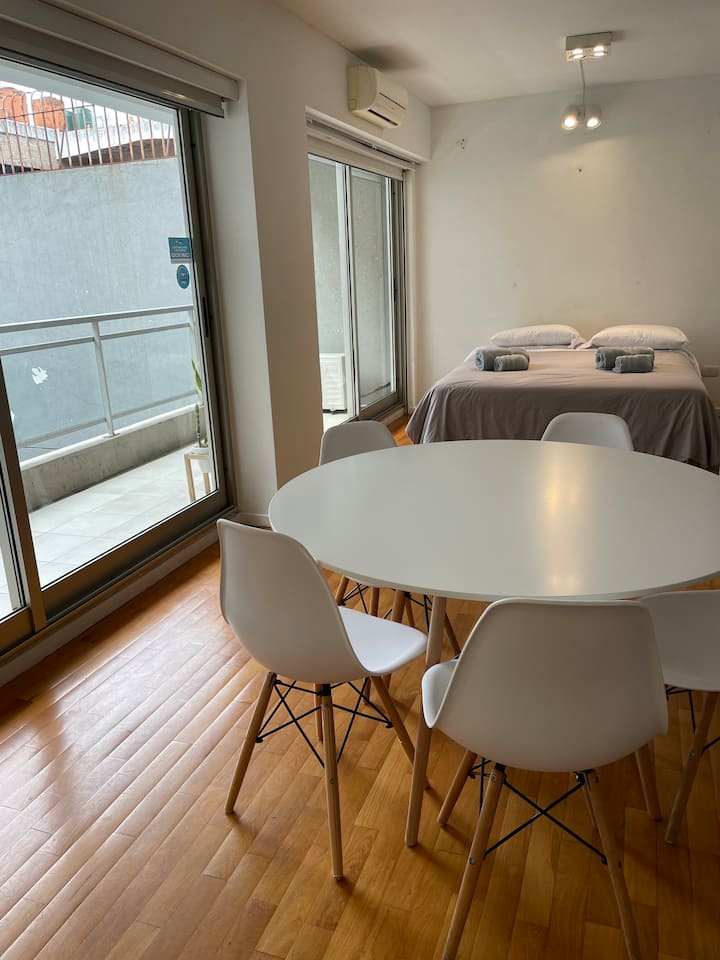 Kitnet em Palermo Soho, mobiliada, com varanda ampla. A unidade fica em área residencial silenciosa e dispõe de boa conexão à internet. O prédio tem piscina e academia, com acesso entre 8:00 e 20:00.