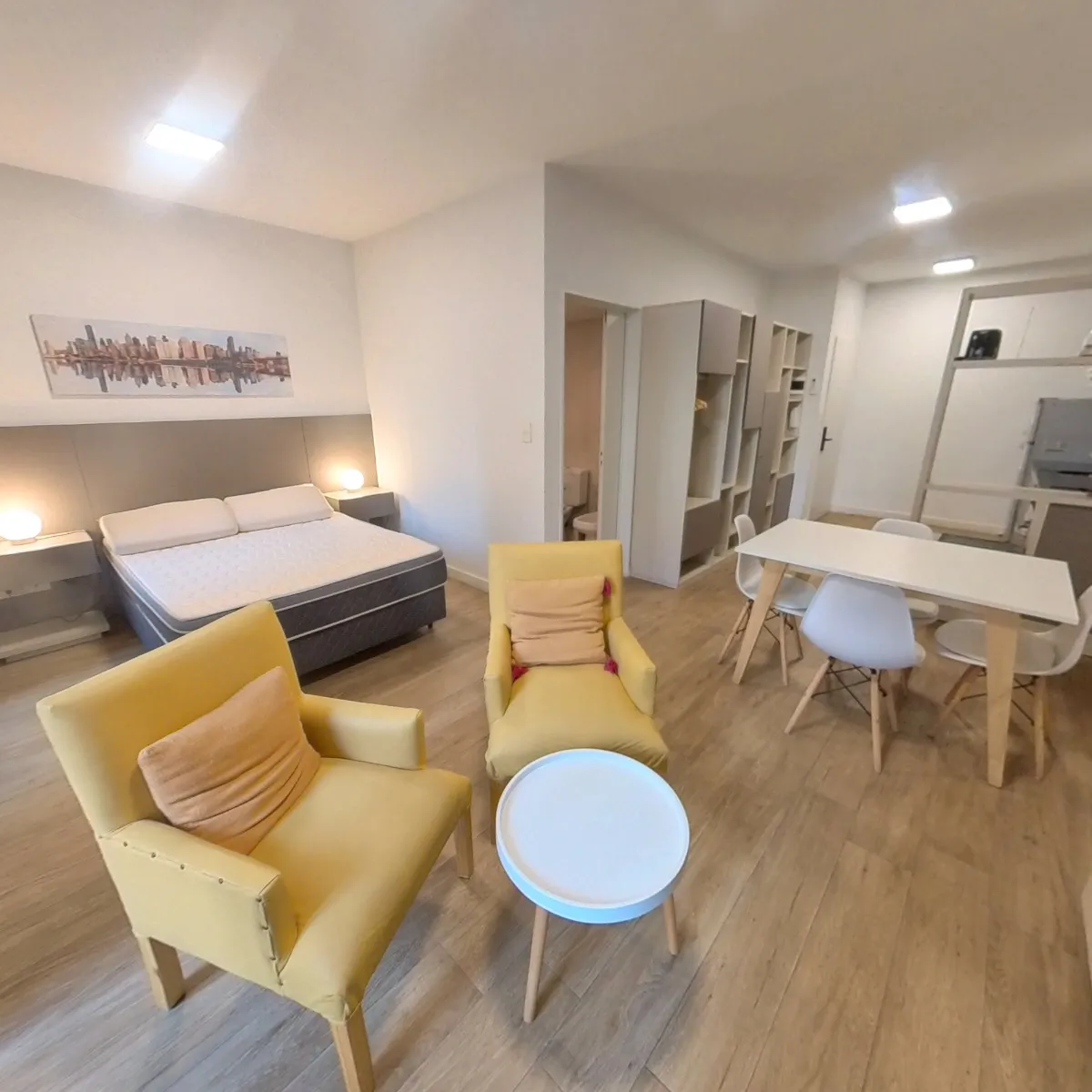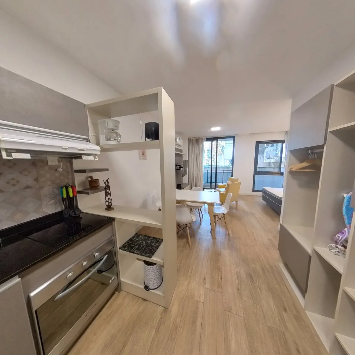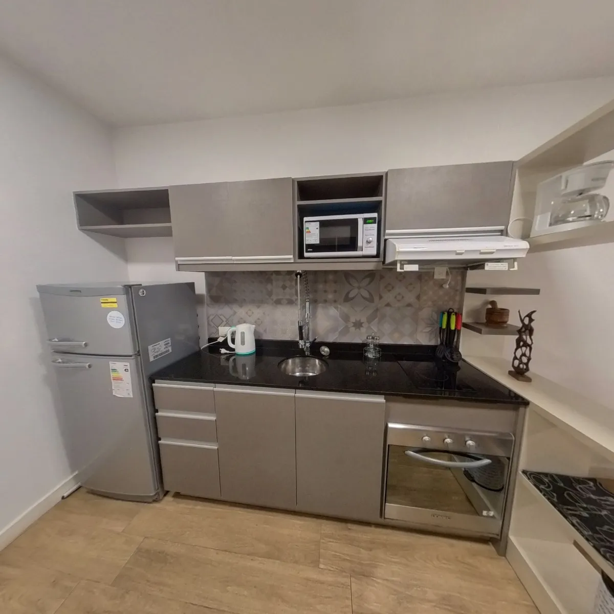 Kitnet em Palermo, com cozinha elétrica com forno, geladeira com freezer, ar-condicionado e Smart TV. Fica no contrafrente com varanda. O prédio tem laundry, solarium e terraço com área de churrasco, além de entrada com fechadura inteligente por código QR e fechadura eletrônica no acesso ao apartamento. O valor inclui condomínio, ABL, água, luz e WiFi; não inclui roupa de cama e toalhas. Exige 1 mês de aluguel e depósito, além de honorários.
