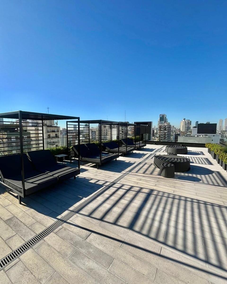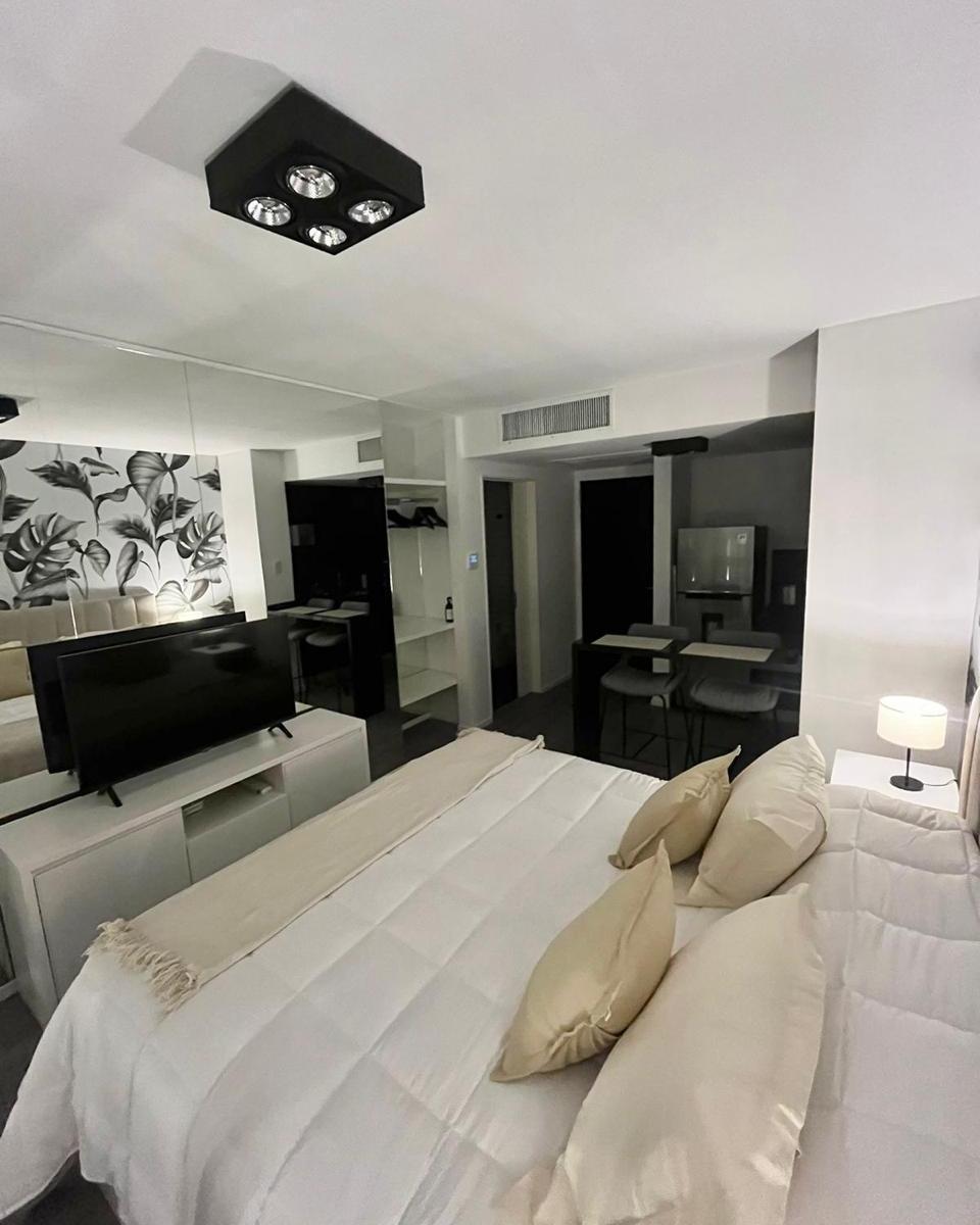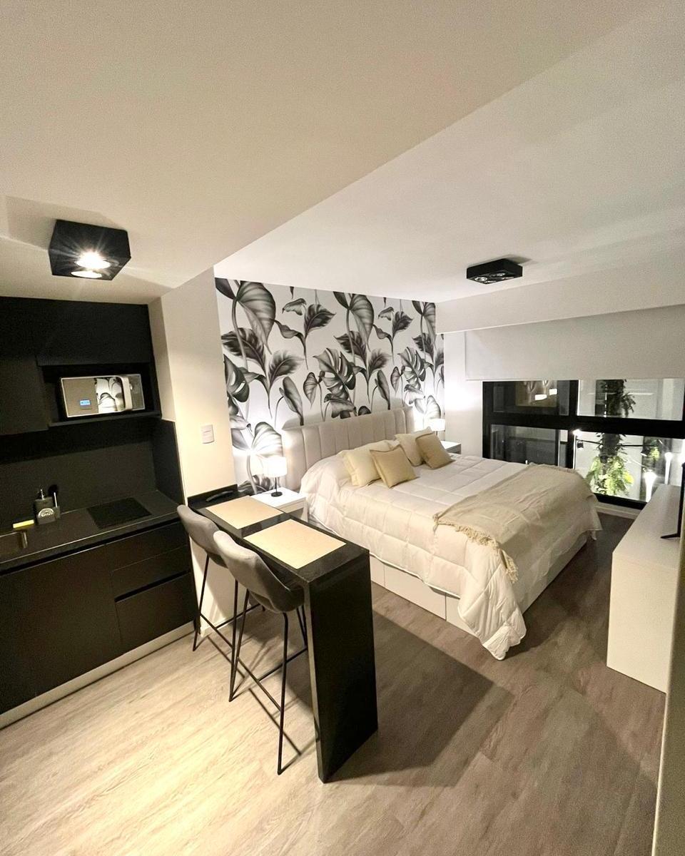 Kitnet mobiliada em edifício no eixo Belgrano/Colegiales, na Av. Cabildo, com cama Queen, banheiro completo e mesa com 2 cadeiras. Inclui Smart TV e ar-condicionado frio/calor. O prédio tem piscina na cobertura com vista da cidade, piscina aquecida com nado contracorrente, salão, sala de meditação, academia, segurança 24 horas e área de churrasco para reuniões pequenas.