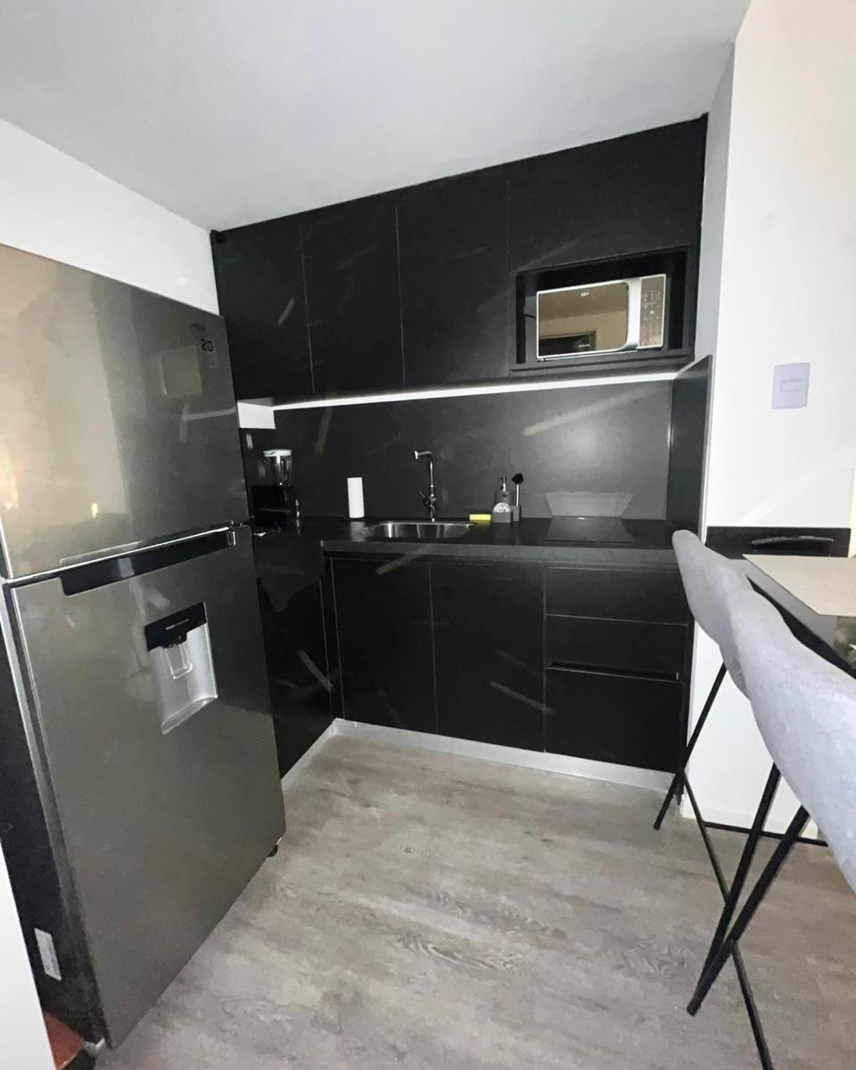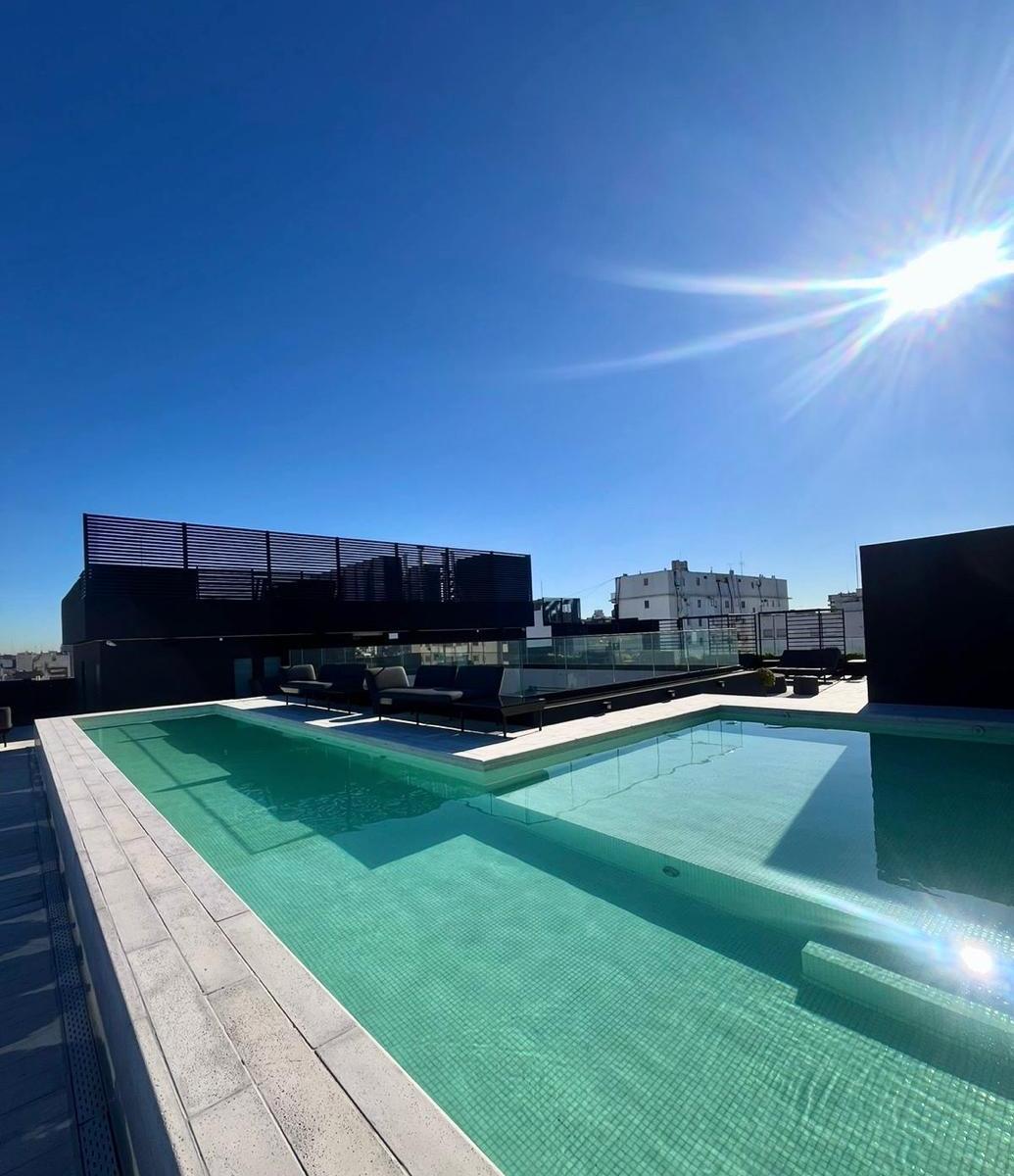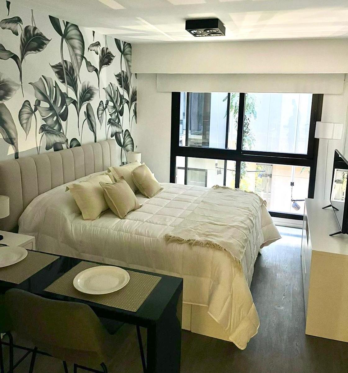 Kitnet mobiliada em edifício no eixo Belgrano/Colegiales, na Av. Cabildo, com cama Queen, banheiro completo e mesa com 2 cadeiras. Inclui Smart TV e ar-condicionado frio/calor. O prédio tem piscina na cobertura com vista da cidade, piscina aquecida com nado contracorrente, salão, sala de meditação, academia, segurança 24 horas e área de churrasco para reuniões pequenas.