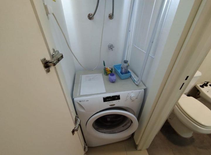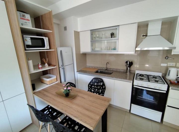 Kitnet mobiliada para alugar com 34 m² totais (31 m² cobertos e 3 m² semicobertos) no 2º andar, em edifício de 2011 com elevador. Varanda e banheiro completo. Entrega com geladeira, lava-roupas, fogão a gás com forno e micro-ondas, além de mesa de jantar com cadeiras e Smart TV. Cozinha e área de estar com espaço de armazenamento.