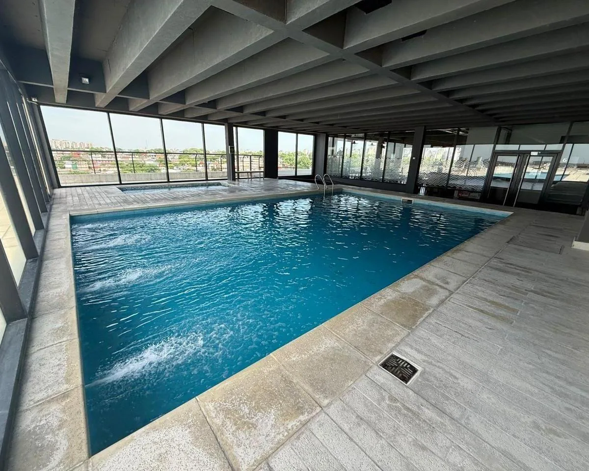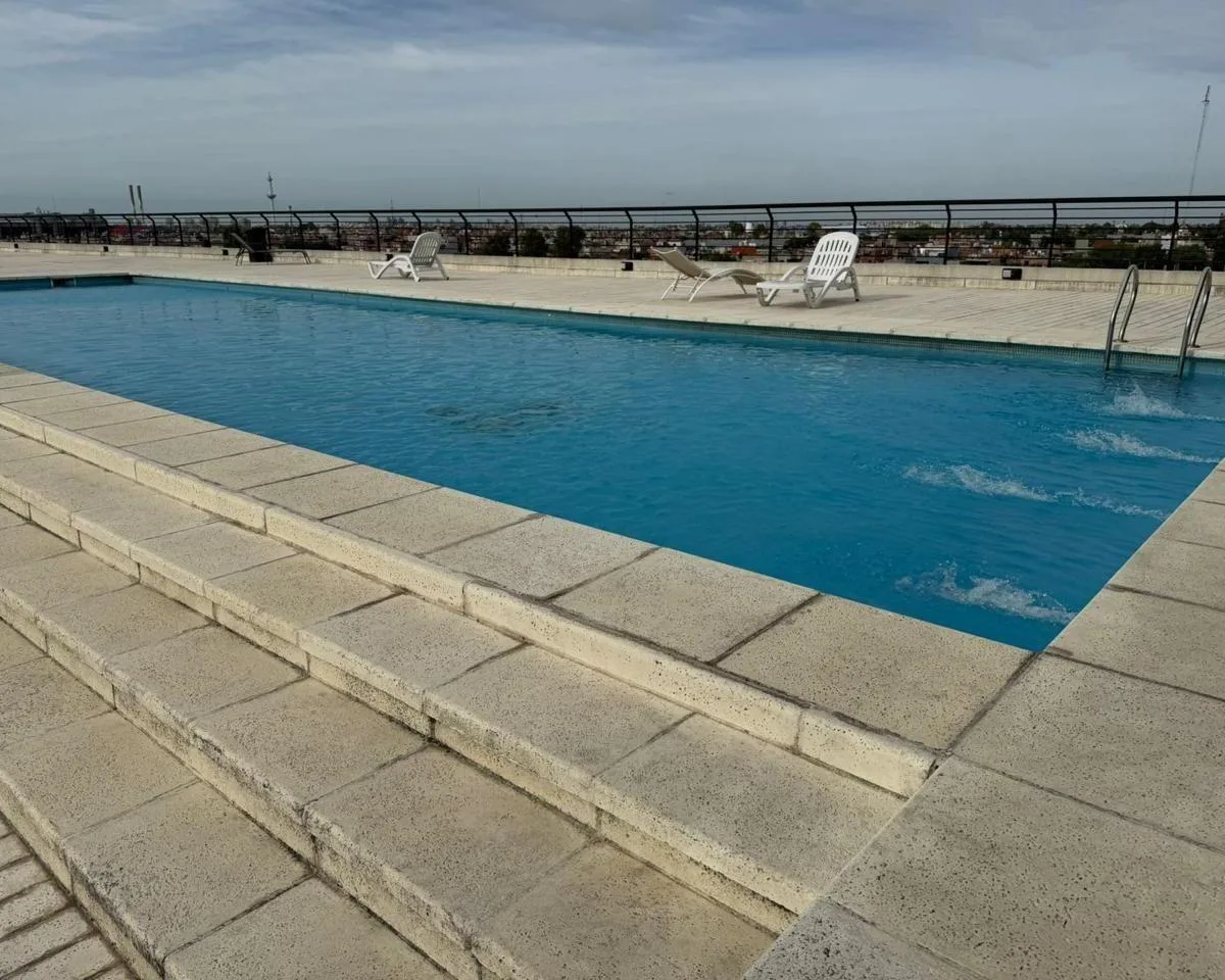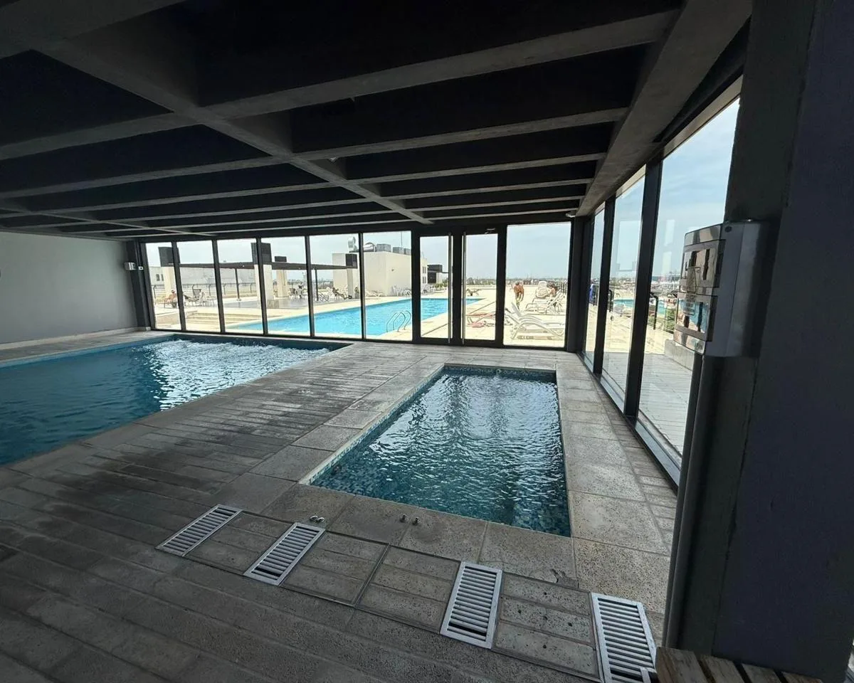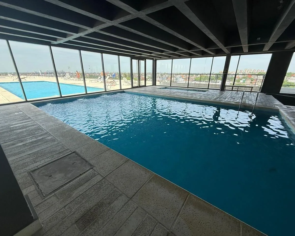 Kitnet (1 ambiente) com vista aberta e pé-direito alto, recém-pintada, com blackouts. O desnível separa o ambiente; a cozinha integrada tem armários sob a bancada e fogão elétrico com 2 bocas. Banheiro completo e amplo. O edifício Terrazas de Volcan tem 4 piscinas (2 climatizadas e 2 externas), área de churrasco e solário, pista de running, academia com vestiários, saunas (masculina e feminina) com vestiários, laundry em 3 pisos e SUM com internet própria em 4 pisos, além de salão de festas (até