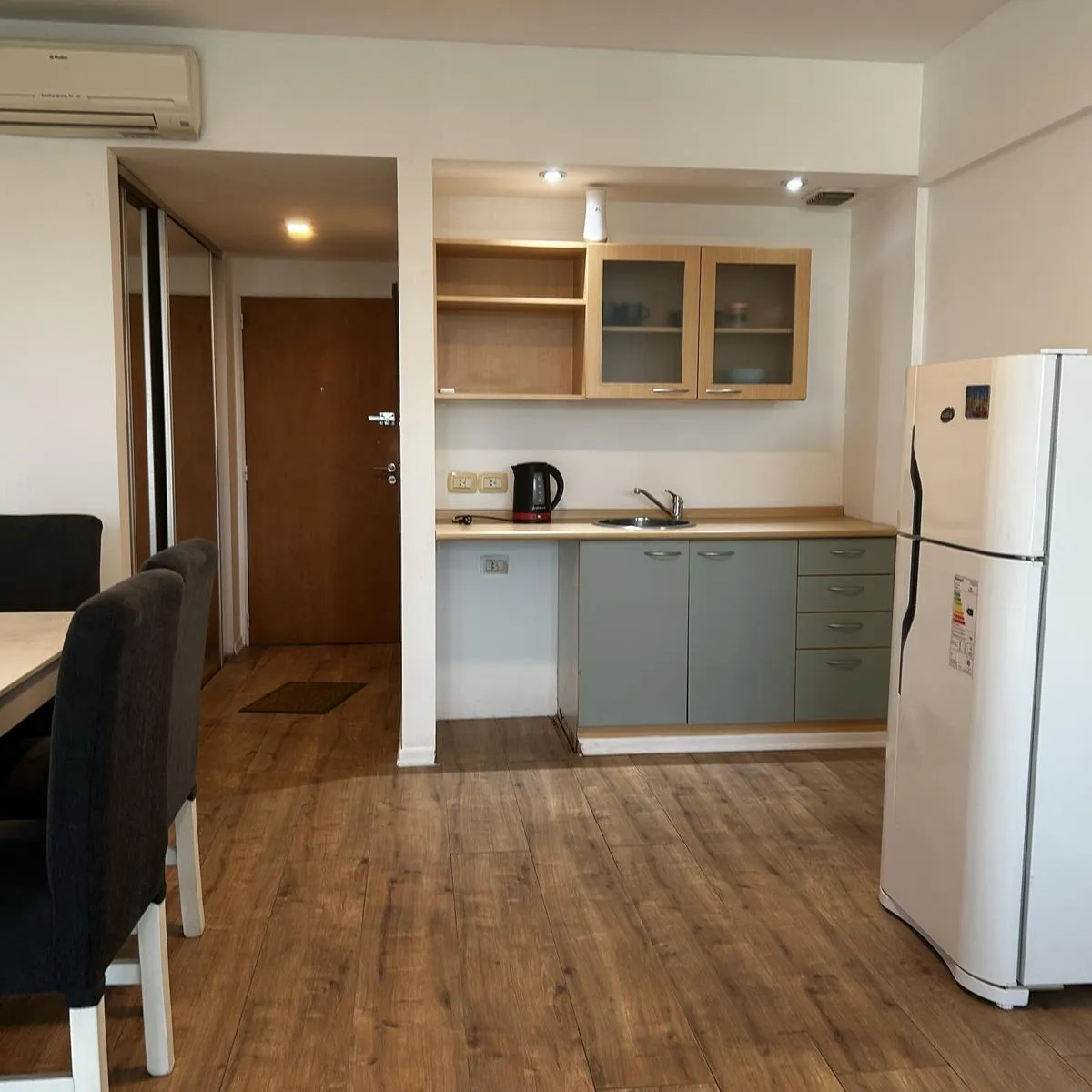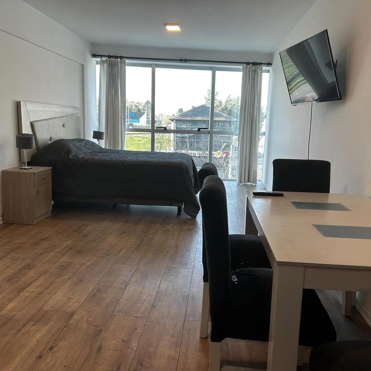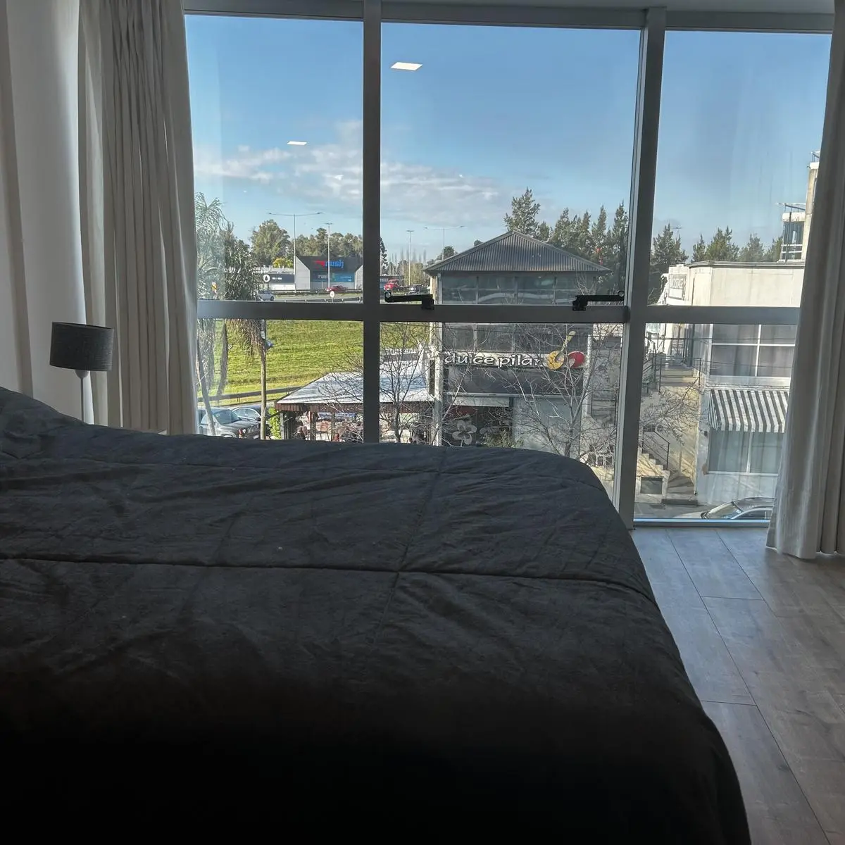 Apartamento tipo studio mobiliado para aluguel anual ou temporário em Pilar. Fica no 1º andar do Edificio Concord Pilar, com vista para Dulce Pilar e a Panamericana. Inclui geladeira grande, TV e Wi-fi; é todo elétrico, com ar-condicionado frio e quente, armário e banheiro completo, além de aquecimento por split. O prédio permite uso residencial ou profissional e tem piscina, ginásio, lavanderia, área de churrasco nas coberturas e segurança 24 horas. Disponível a partir de 3 de julho de 2026. O