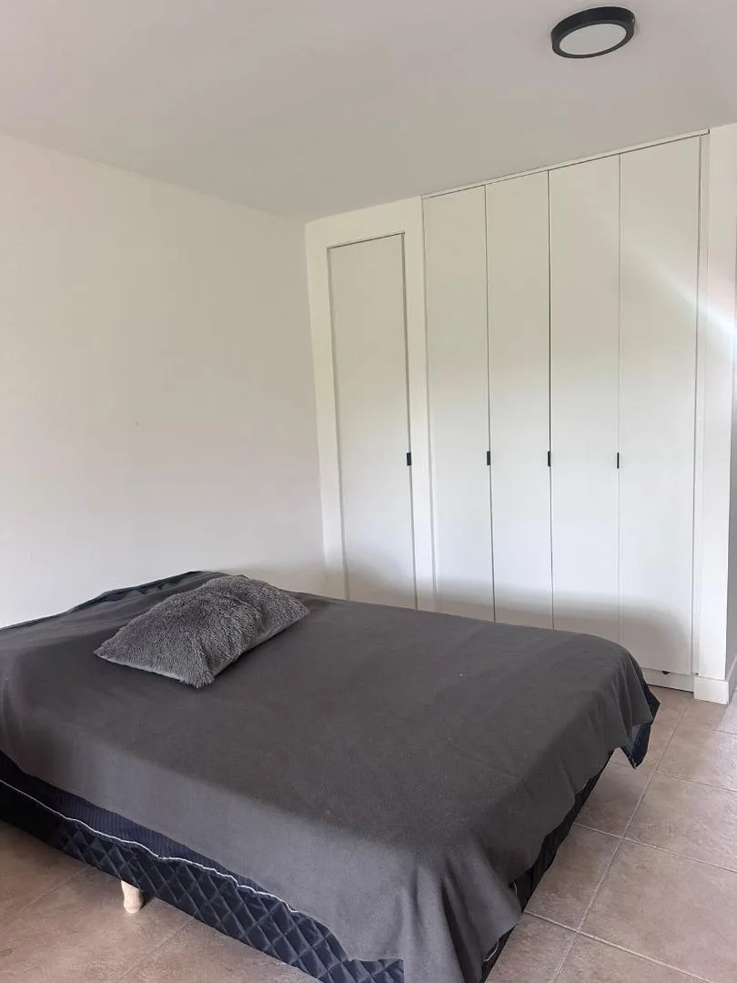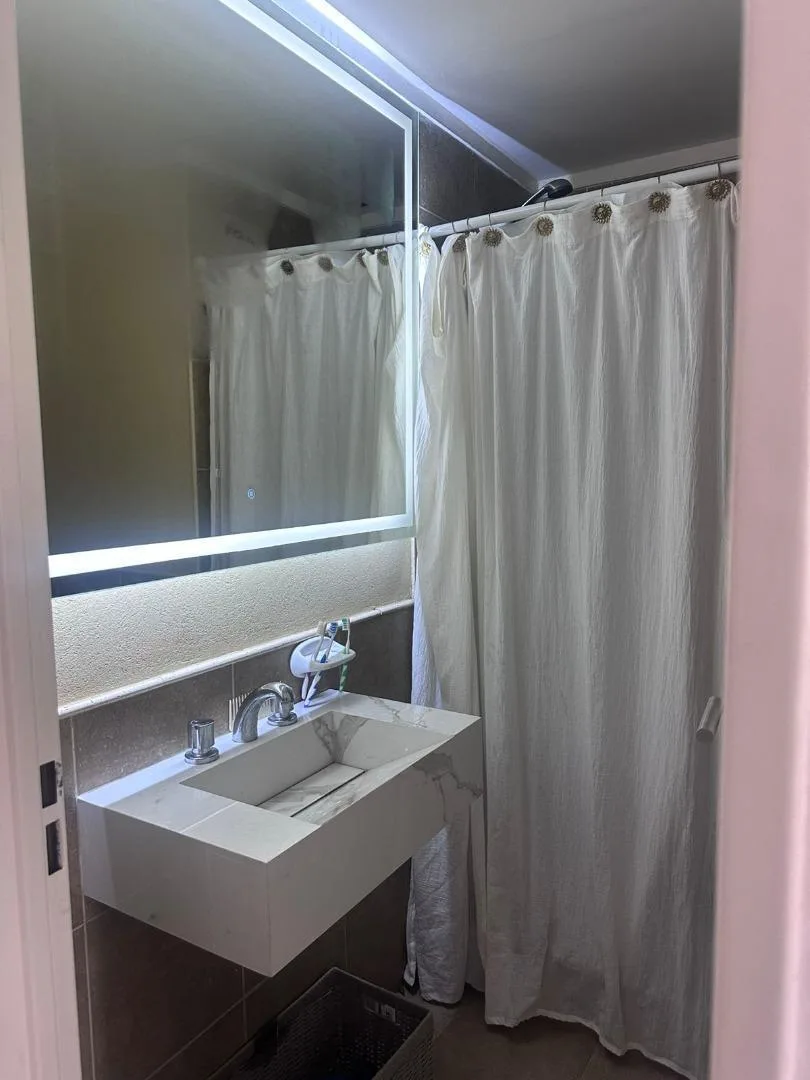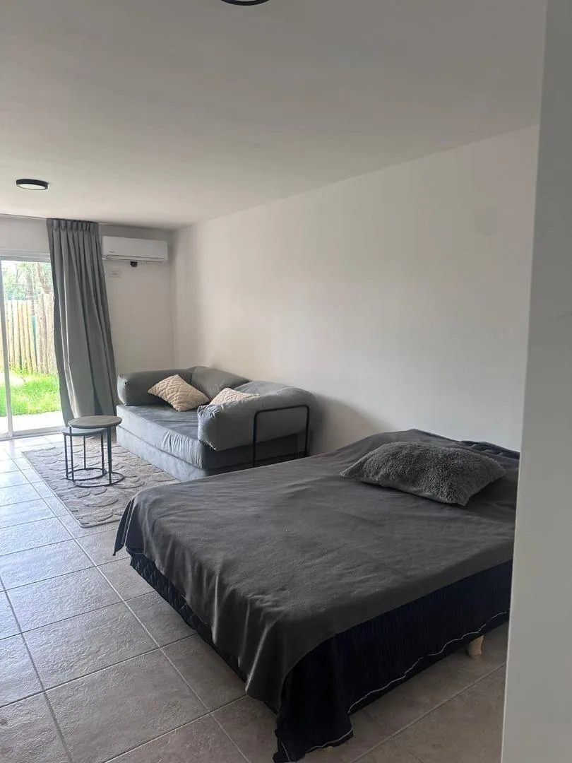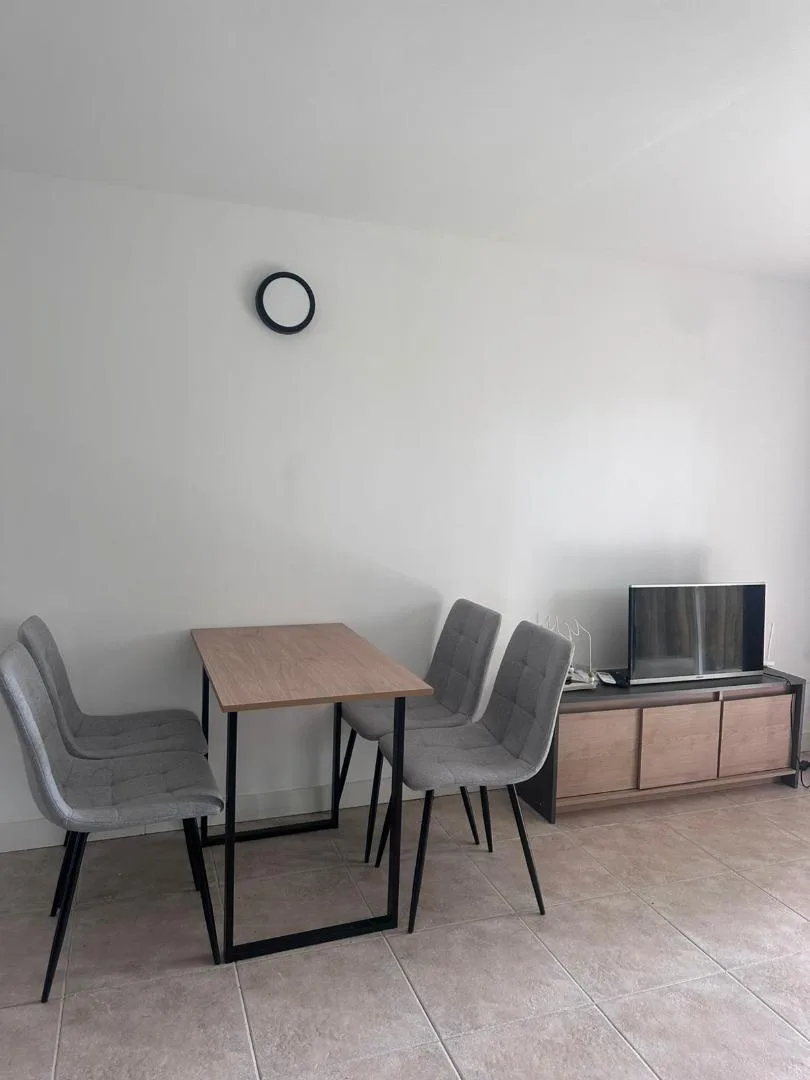 Kitnet em planta baixa, mobiliada, com jardim. Cozinha separada na frente, ambiente com armário e saída para o jardim, e banheiro. Está equipada para duas pessoas. O condomínio Petrel Village oferece salão de festas (SUM), piscina, praça e área de jogos infantis, além de estacionamento de cortesia, câmeras perimetrais e acesso por reconhecimento facial via aplicativo de celular. A publicidade informa que medidas e valores de condomínio, impostos e serviços são aproximados.