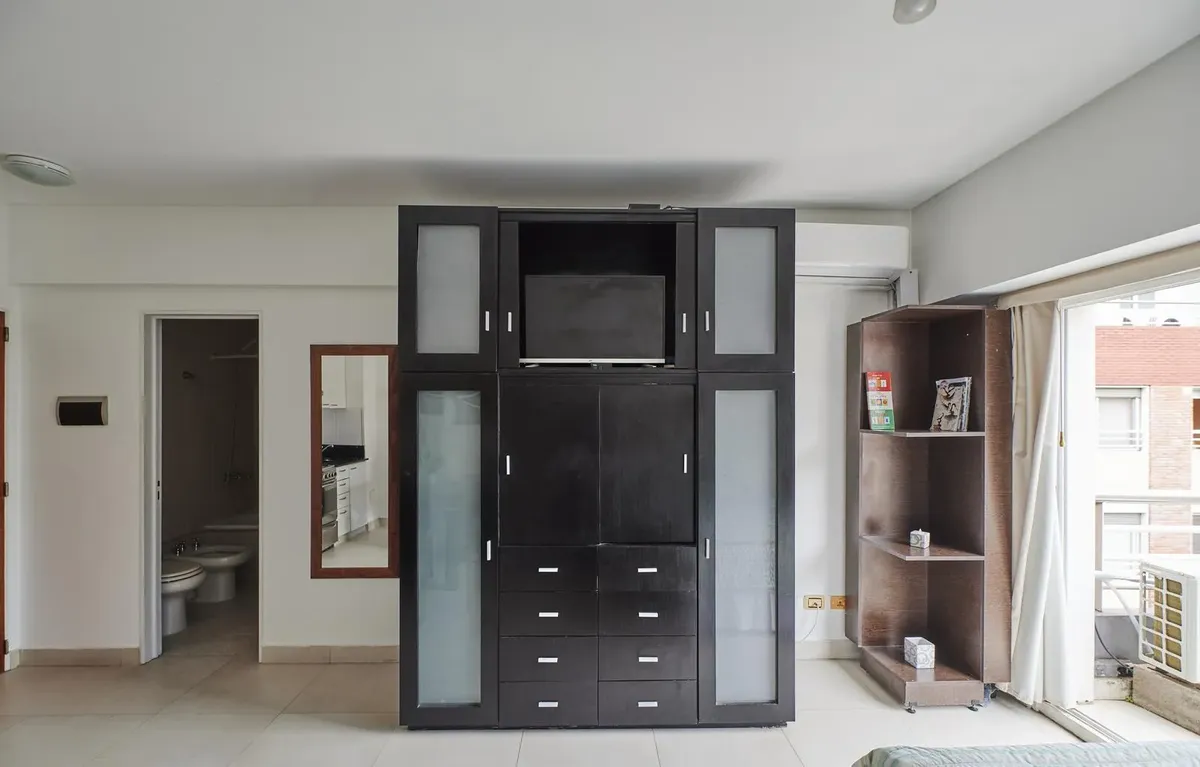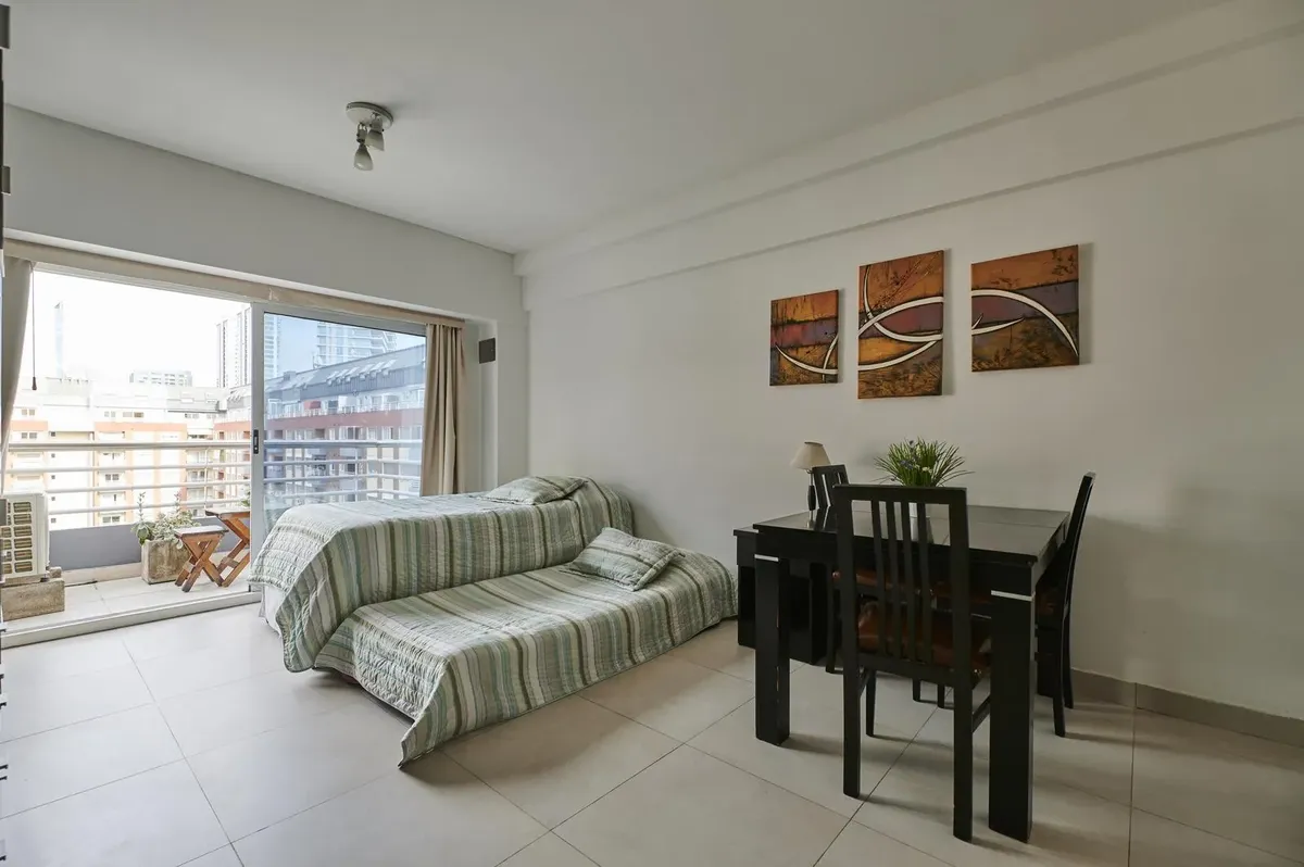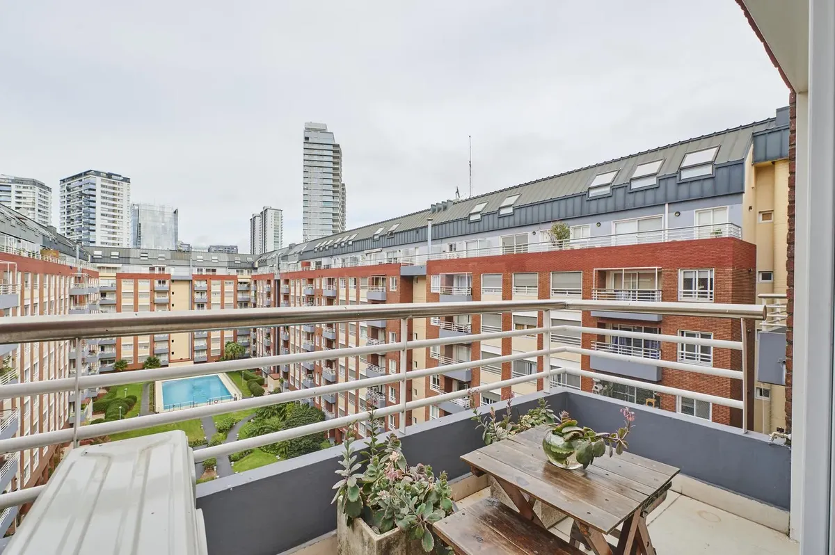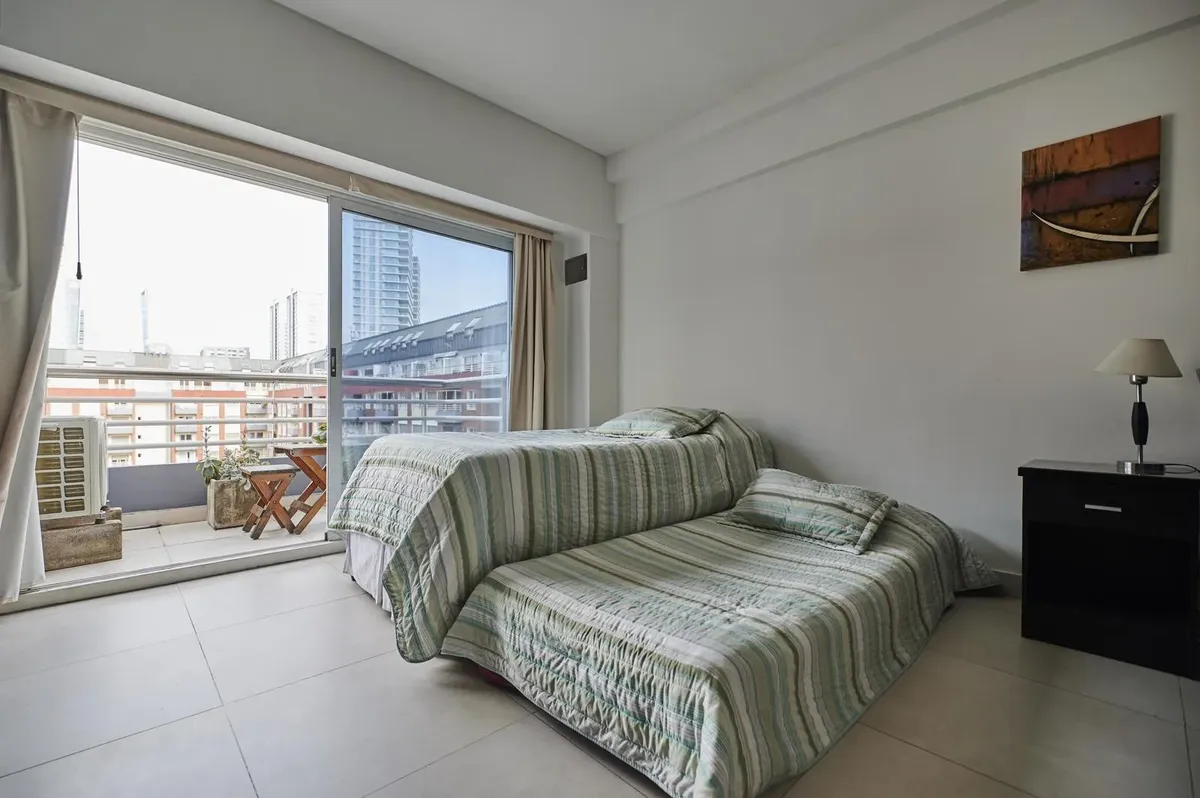 Kitnet de 1 ambiente no edifício Terrazas de Puerto Madero, acesso Acacias. Unidade mobiliada e totalmente equipada, com cama de casal. Varanda de fundos com vista para o parque e para a piscina do complexo; ar-condicionado com função frio/calor. O prédio tem duas piscinas, academia, sauna, lavanderia e salão de festas, além de segurança presencial 24 horas e acesso controlado por câmeras. Condomínio de ARS 179.000, com AYSA incluída. Disponível a partir de 1º de abril.