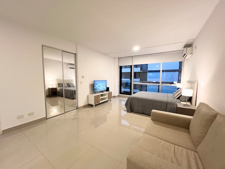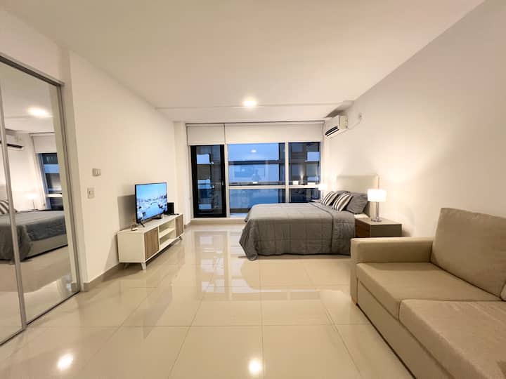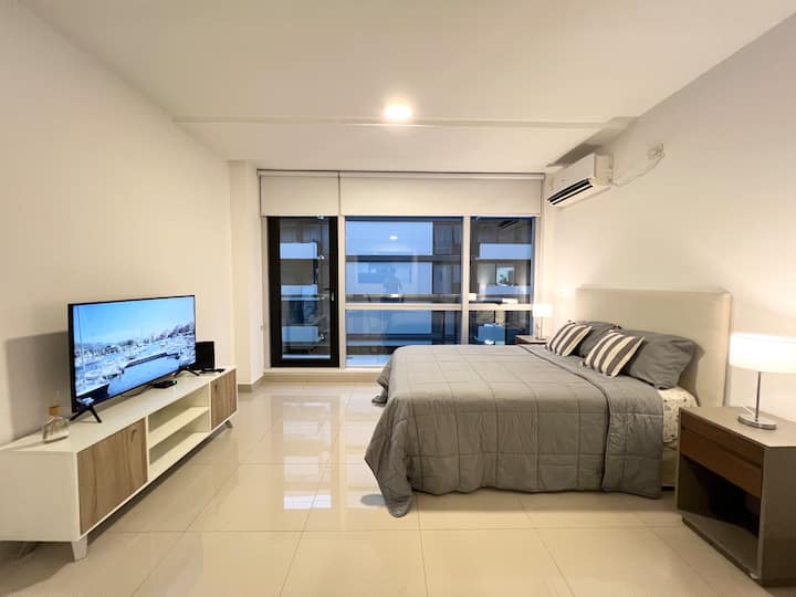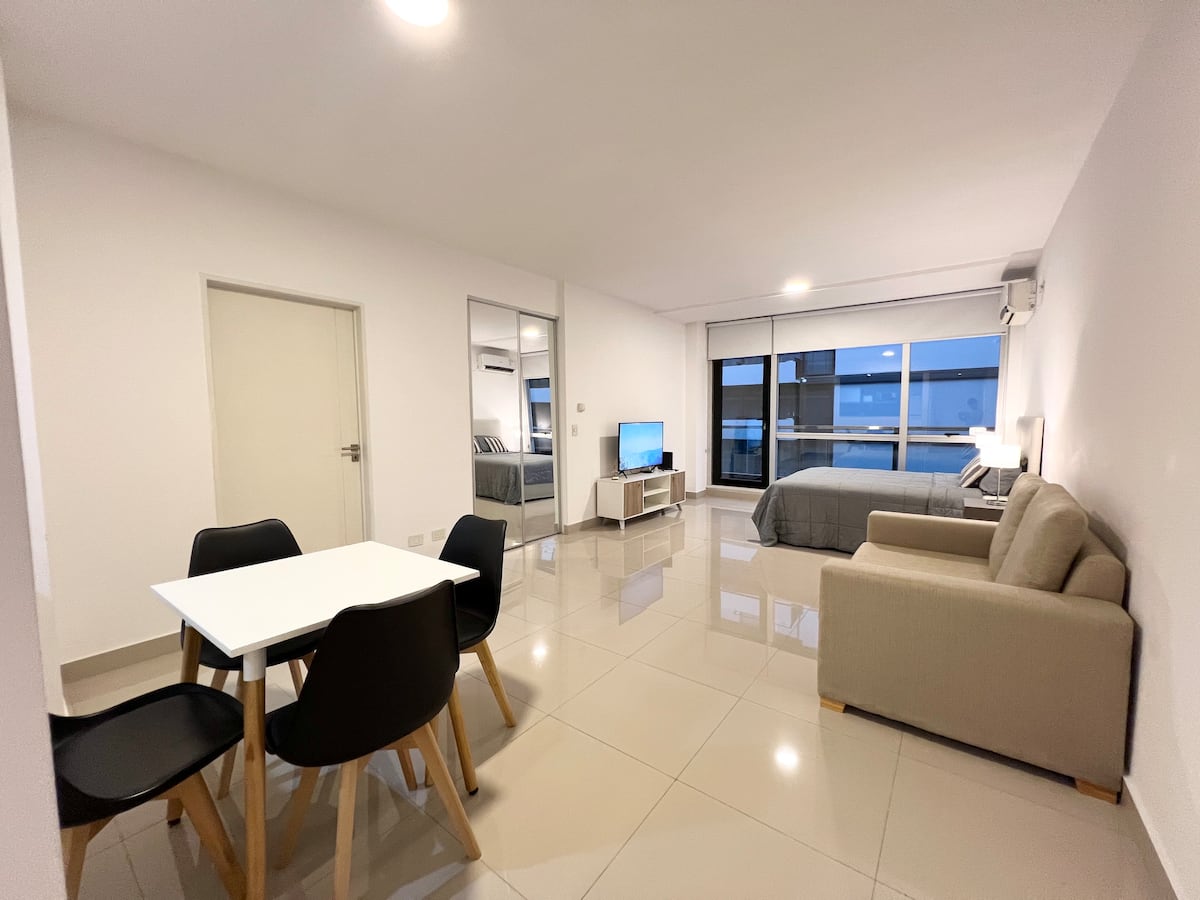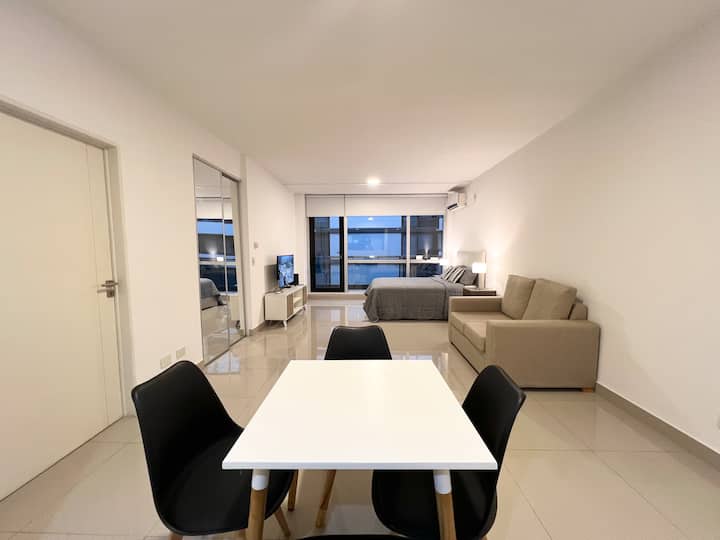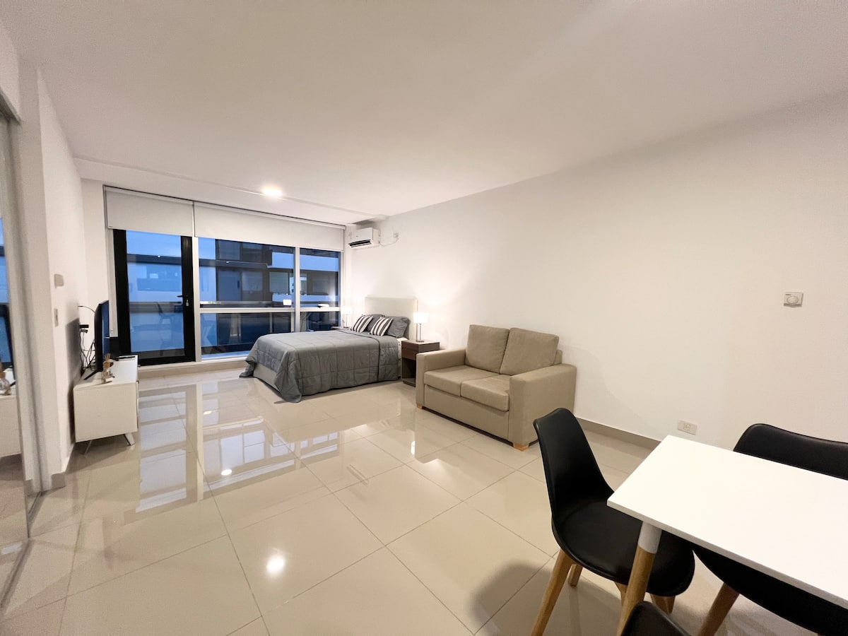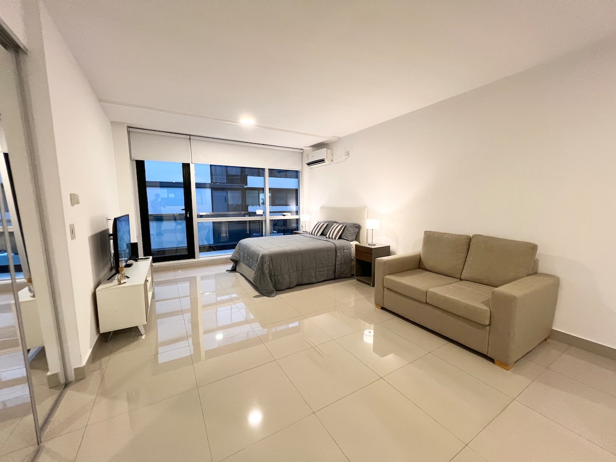 Apartamento em Puerto Madero, estúdio mobiliado e equipado. Possui cozinha completa com utensílios, TV e internet de alta velocidade, aquecimento e ar-condicionado, além de água quente. Equipamento 100% elétrico.