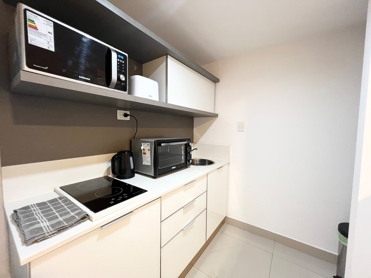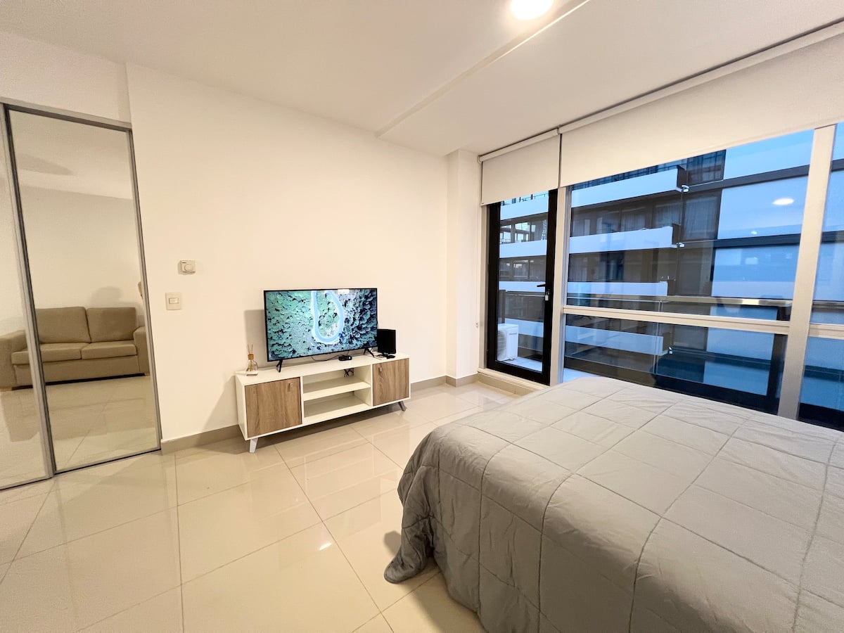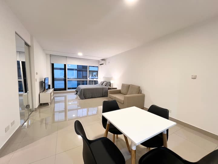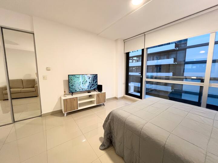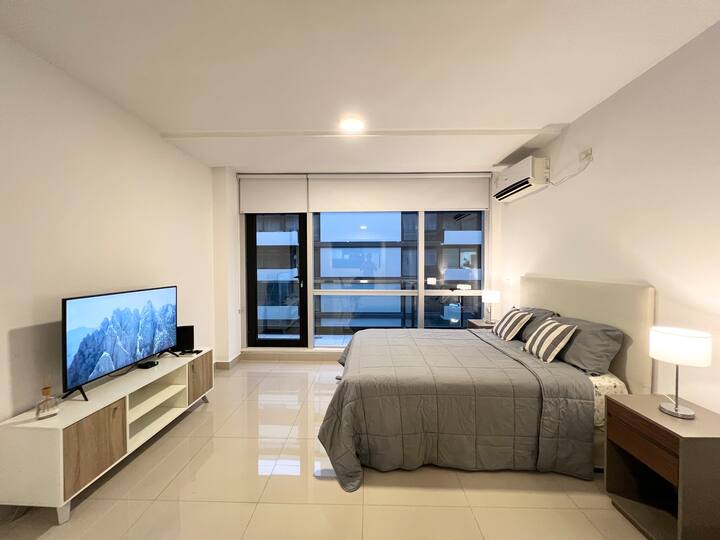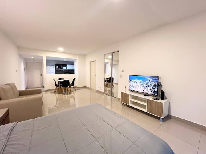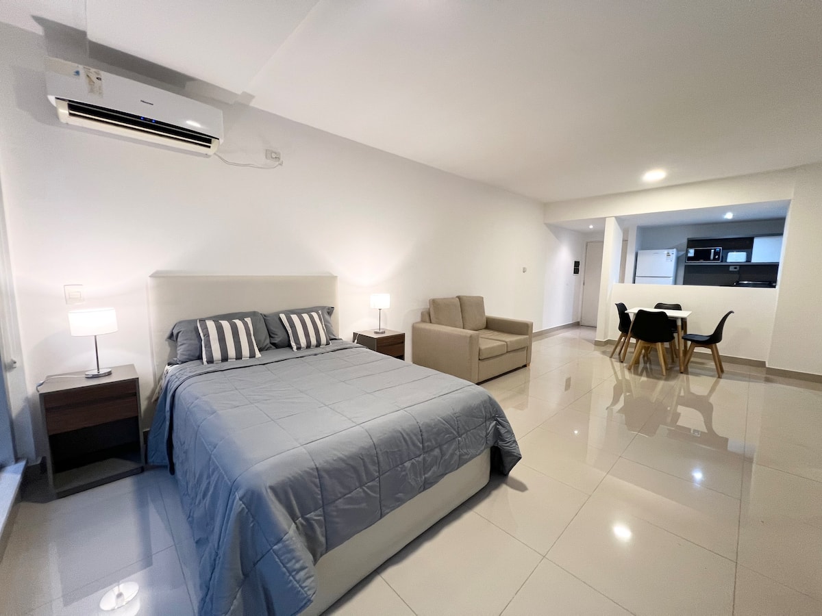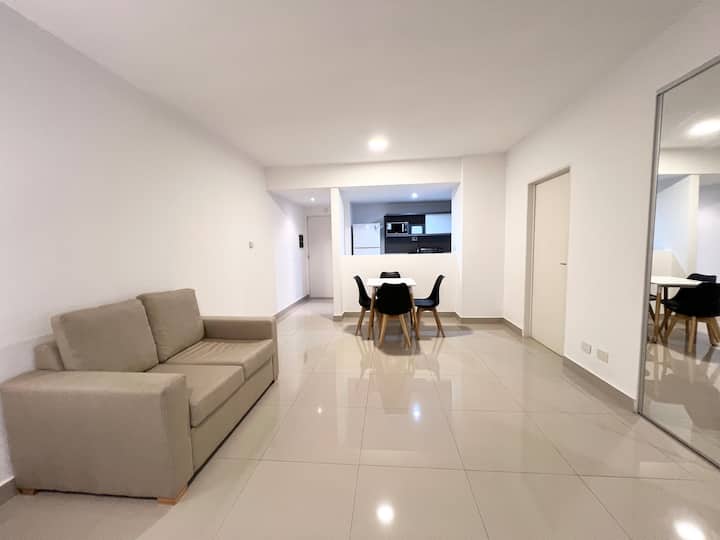 Apartamento em Puerto Madero, estúdio mobiliado e equipado. Possui cozinha completa com utensílios, TV e internet de alta velocidade, aquecimento e ar-condicionado, além de água quente. Equipamento 100% elétrico.