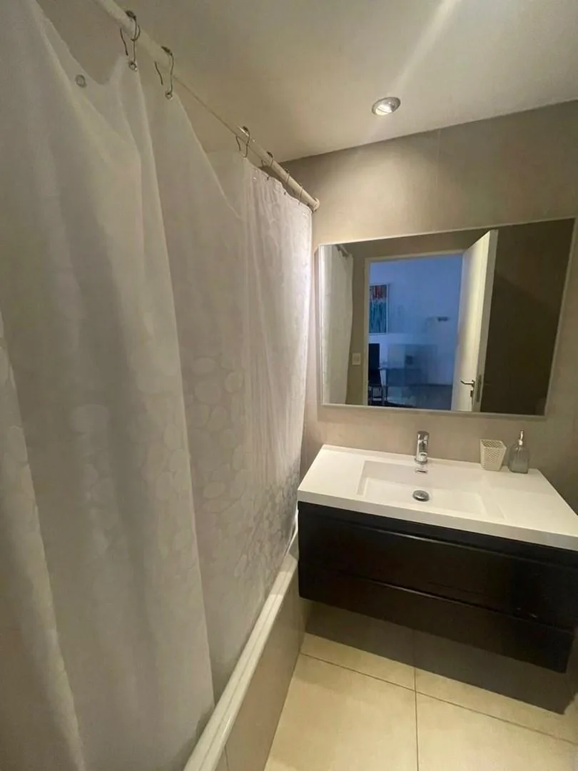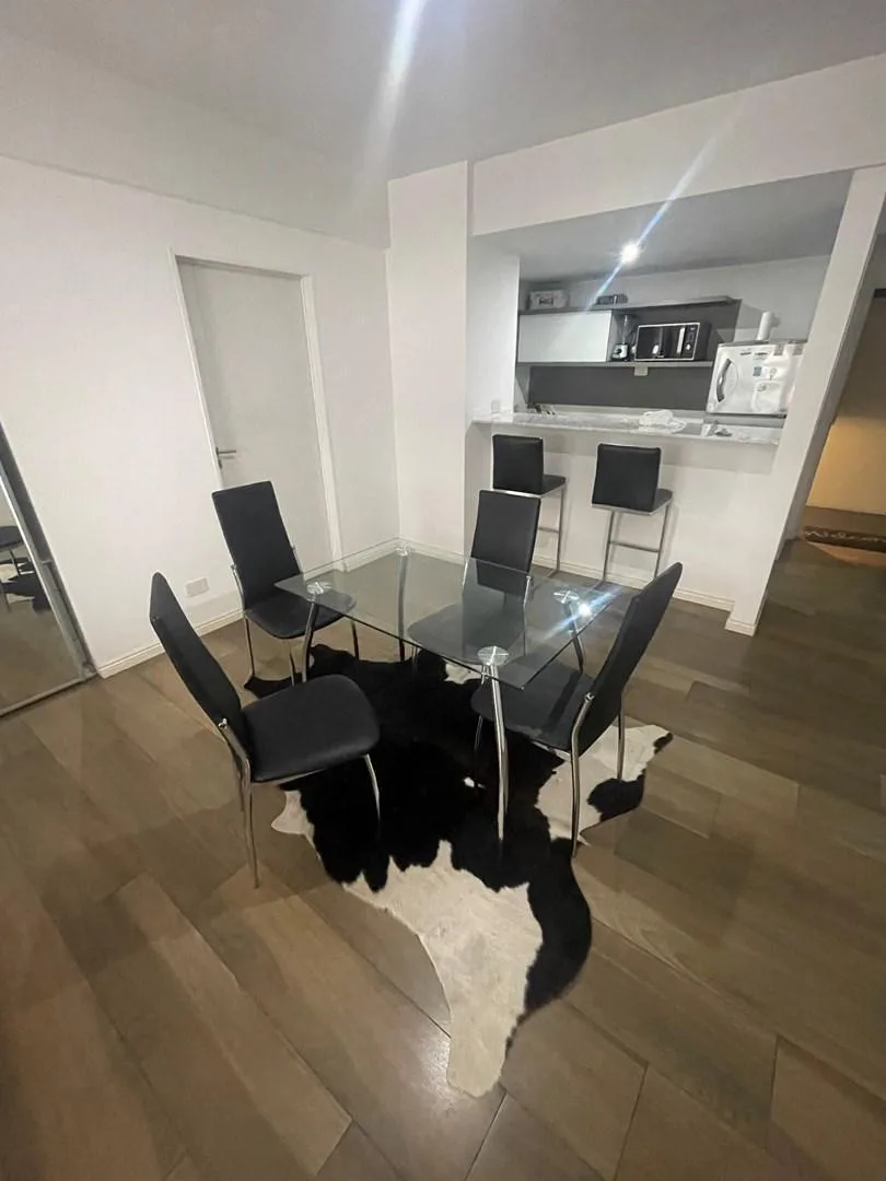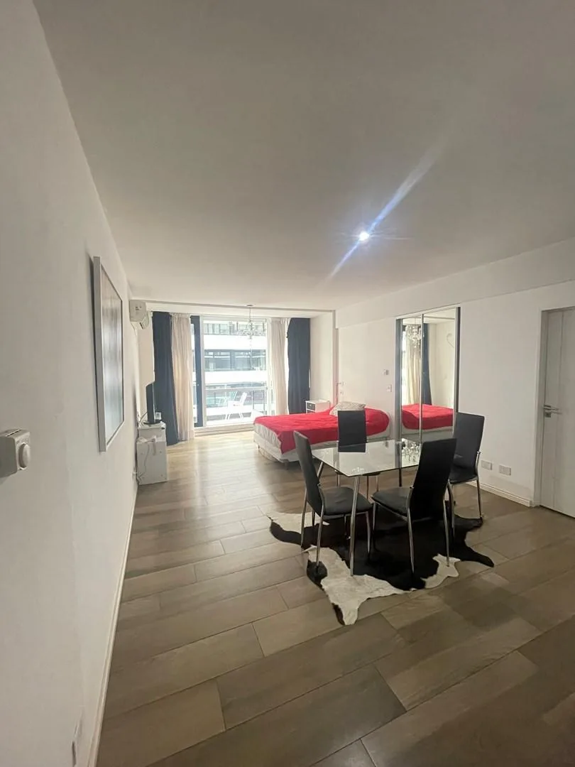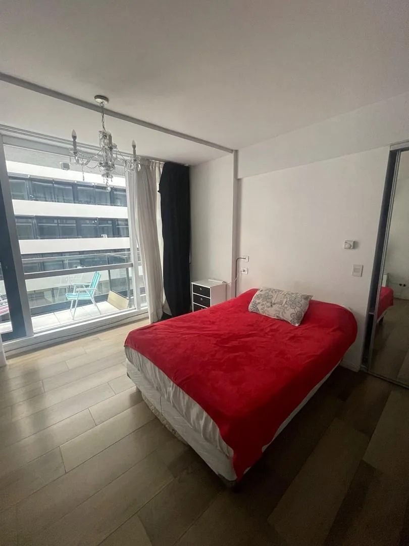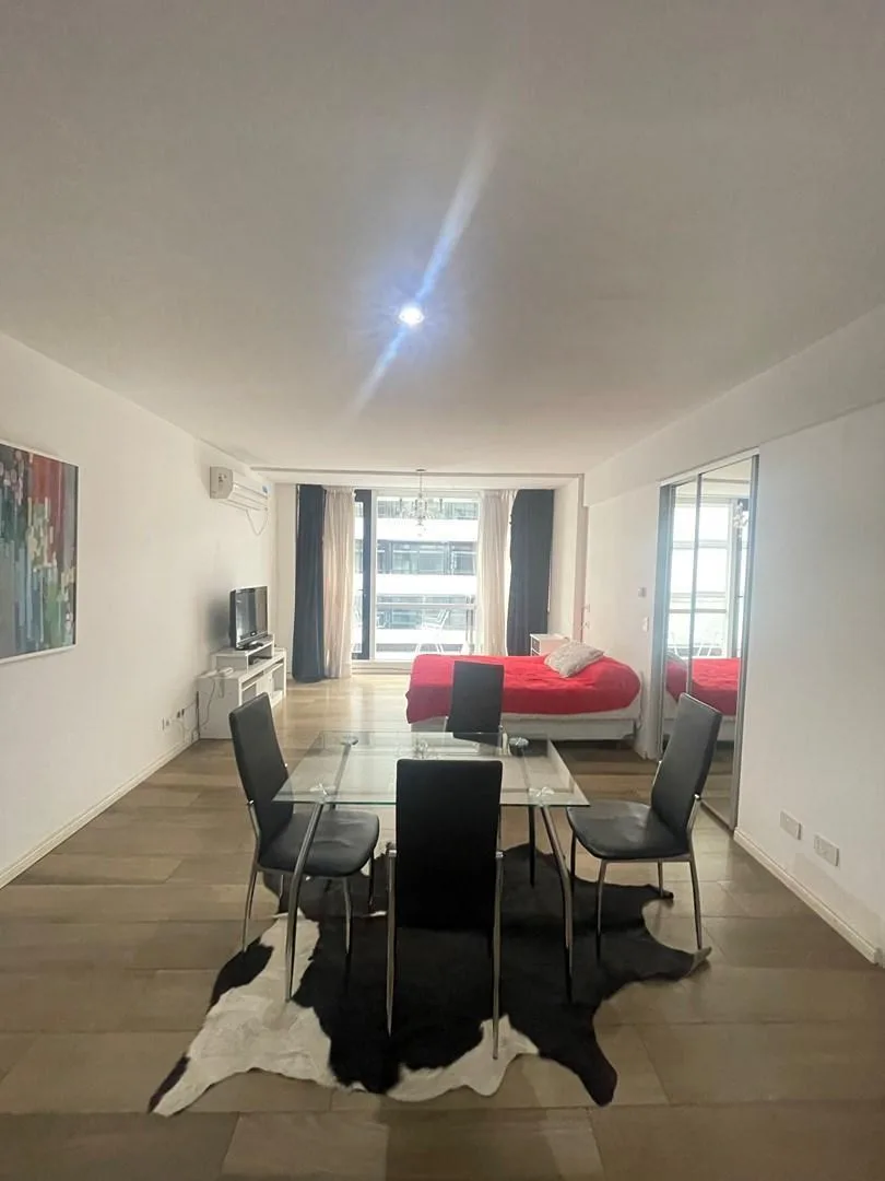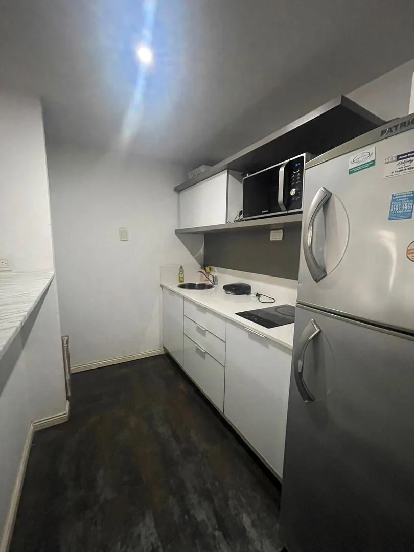 Kitnet mobiliada com varanda corrida, voltada para os fundos (contrafrente). Possui 1 banheiro completo com banheira e cozinha semi-integrada. Inclui vaga de garagem fixa (coberta) e vigilância 24 horas no prédio.