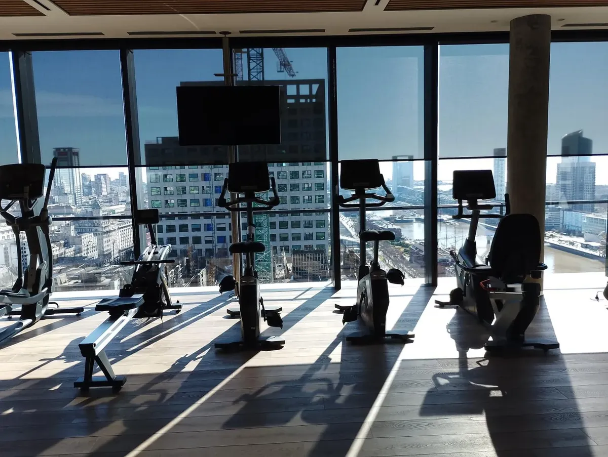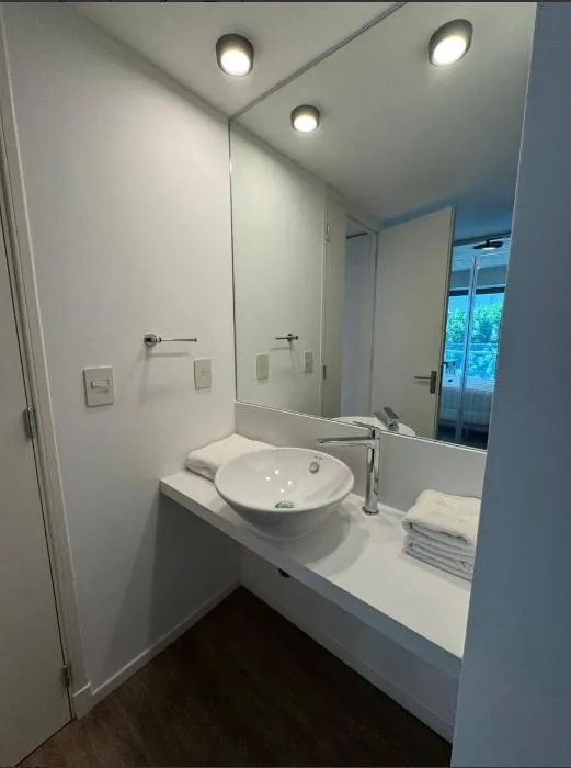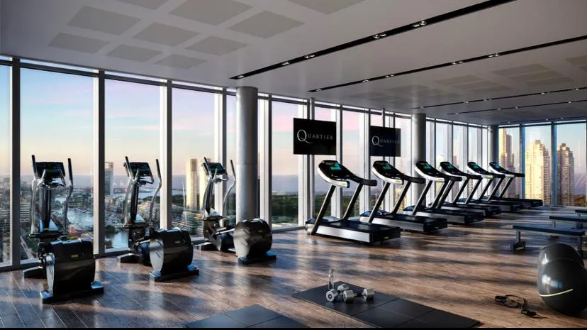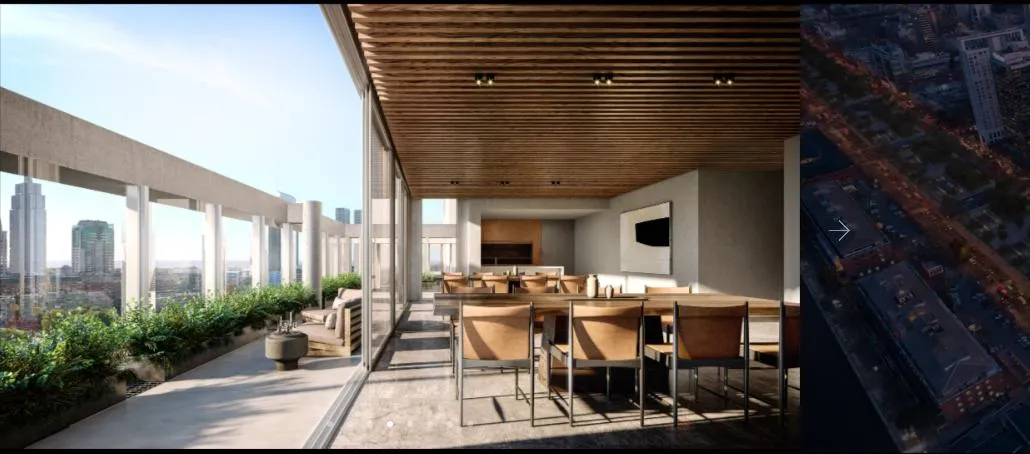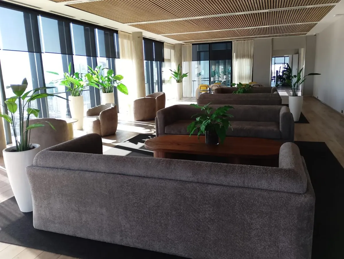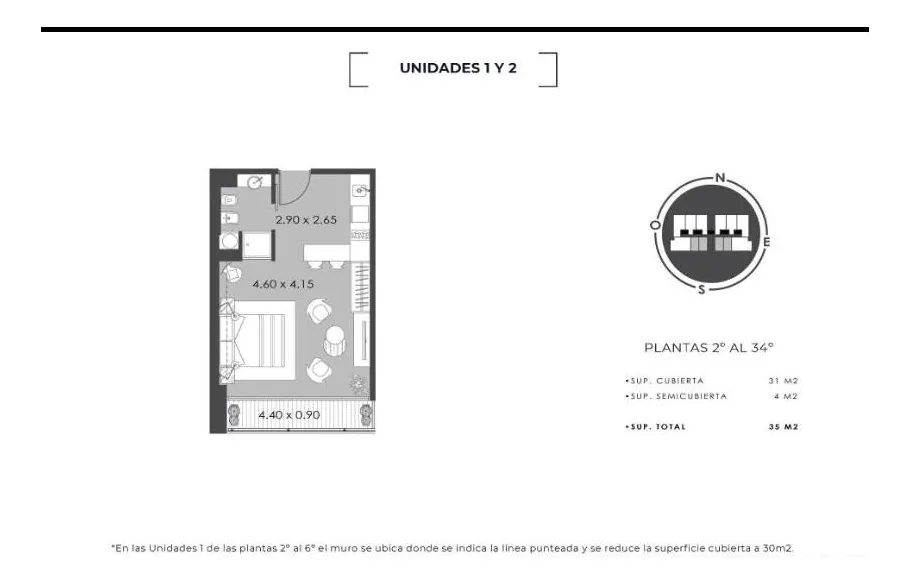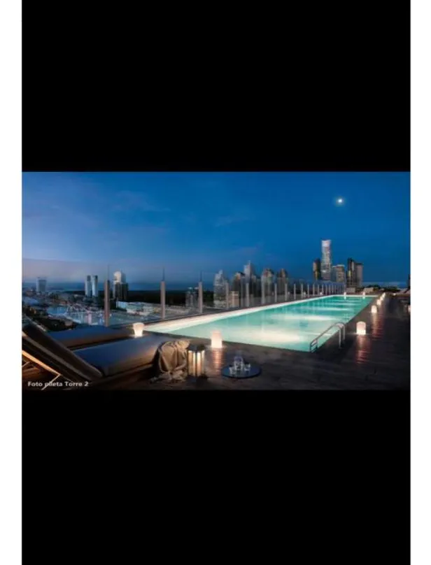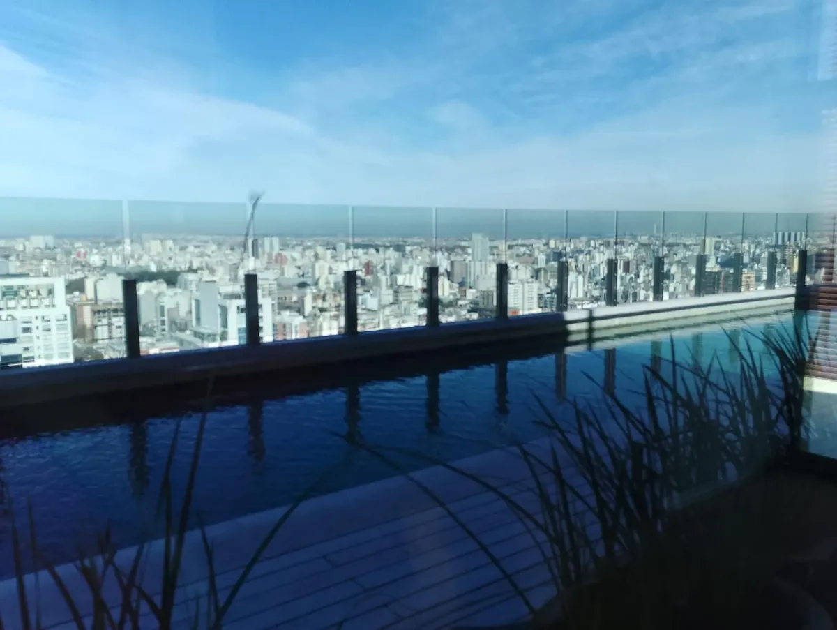 Kitnet mobiliada e equipada no Quartier del Bajo, com 1 banheiro completo, kitchenette e balcão. Inclui lavarropas e vista para México. O condomínio descreve amenities nos 35º e 36º andares, com salas de estar, academia, vestiário e spa com hidromassagens, sauna e banho finlandês, além de piscina descoberta com solário e área de churrasco com parrilla. Há aluguel temporário com contratos semestrais.