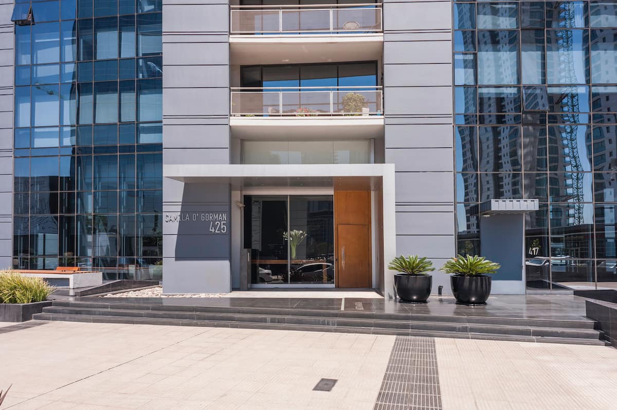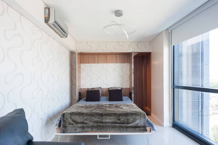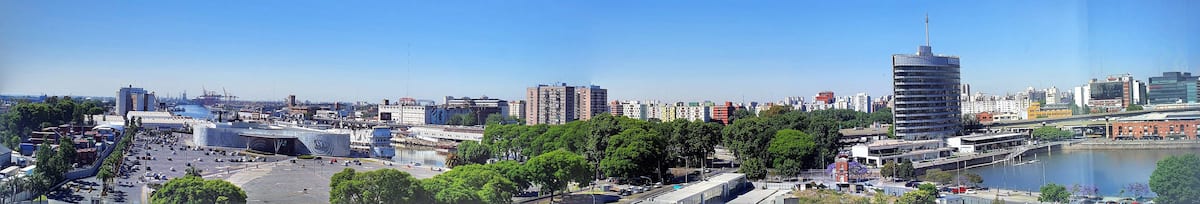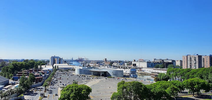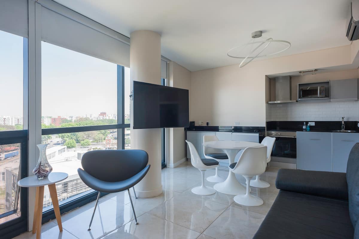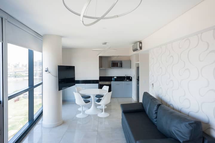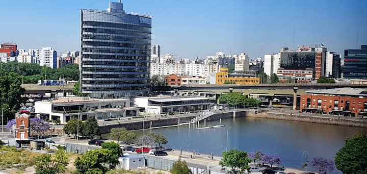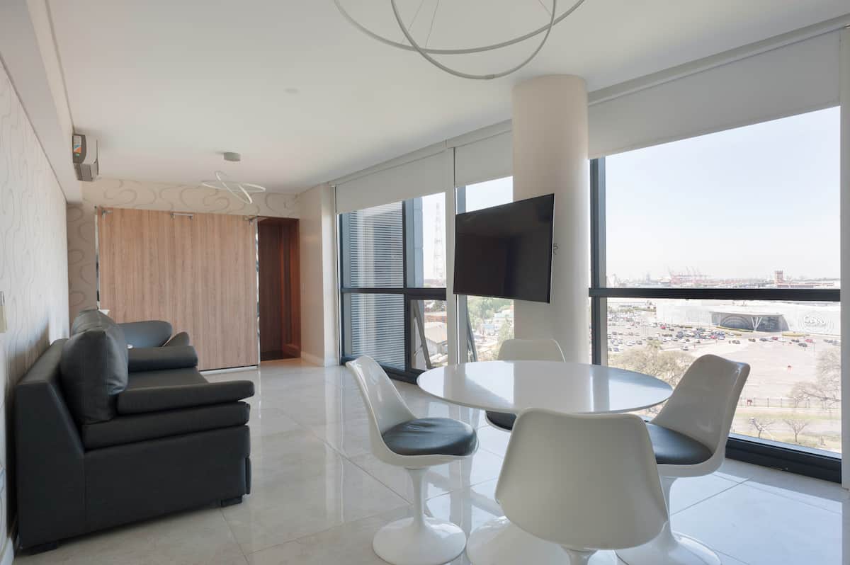 Kitnet em Puerto Madero, no 8º andar, com 38 m². Tem janelas do piso ao teto com vidro acústico duplo, com vista para o porto e para o canal. A unidade é para até 3 pessoas e inclui cama de casal, sofá-cama, TV LED de 50 polegadas, cozinha equipada com forno e fogão elétrico, cafeteira, geladeira com freezer, micro-ondas e torradeira, além de máquina de lavar e banheiro. Há internet de 300 MB por fibra óptica e água filtrada; não há oferta de comida ou café. O prédio tem segurança 24 horas; esta