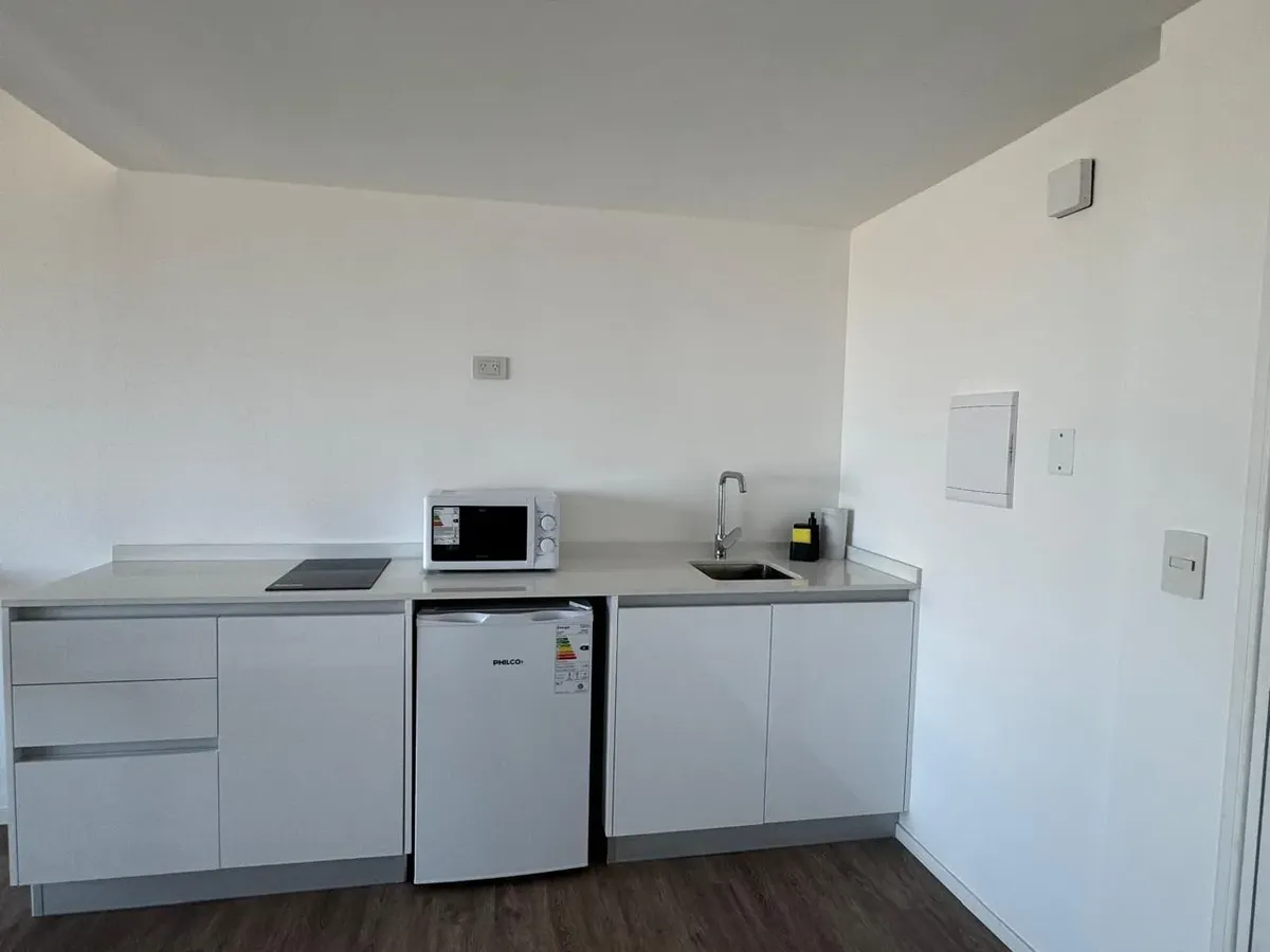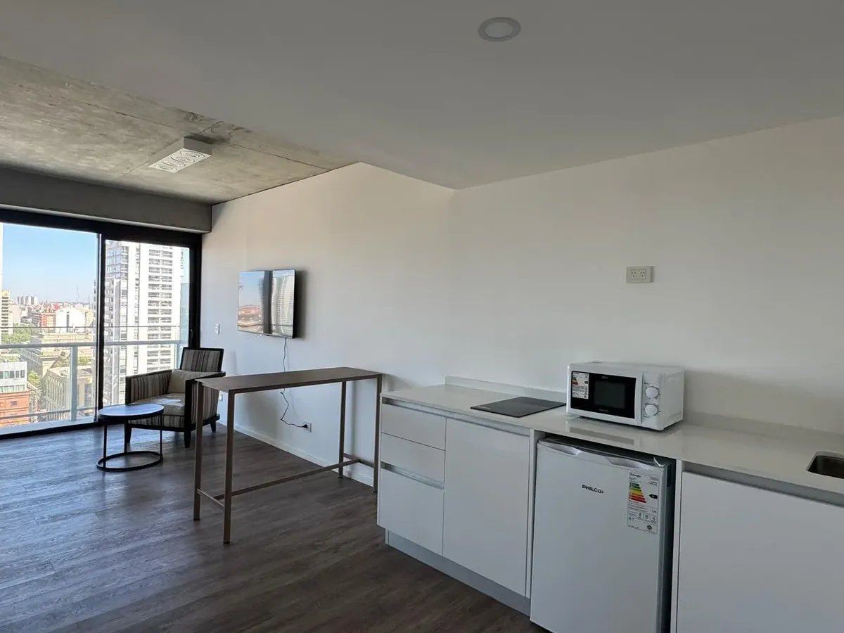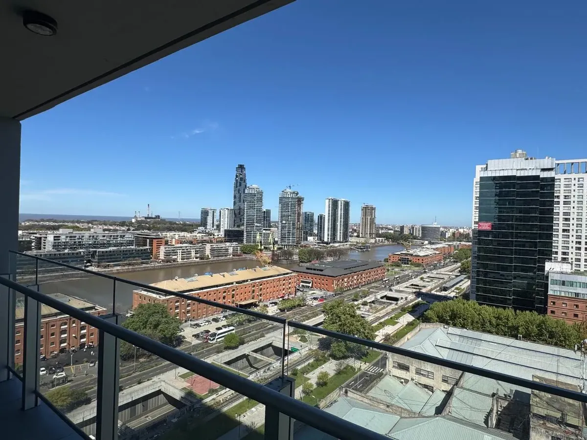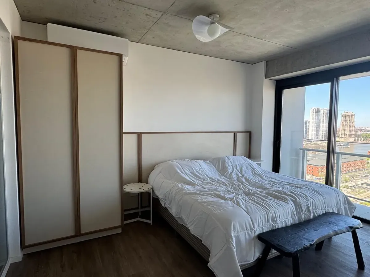 Kitnet (monoambiente) mobiliada para aluguel temporário em Puerto Madero, em andar alto, com vista. Cozinha semi-integrada e banheiro completo. Ar-condicionado frio e quente. O contrato tem aluguel temporário mínimo de 3 meses por USD 1.100, além de despesas.