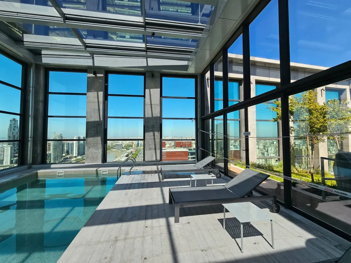 Kitnet de 1 ambiente com 35 m², novo (nunca habitado), com varanda e orientação oeste. Cozinha integrada com alacena, armário sob a pia, fogão (anafe) e forno elétrico, além de exaustor; 1 banheiro completo. Há janelas com vidro duplo (DVH), ar-condicionado frio e quente e água quente central. O prédio Torre Huergo tem 38 andares, 1.500 m² de amenities e 2.800 m² de áreas verdes, além de 3 subsolos de garagem. Entre as áreas comuns, há piscina e rooftop com vistas panorâmicas, academia, sauna, r