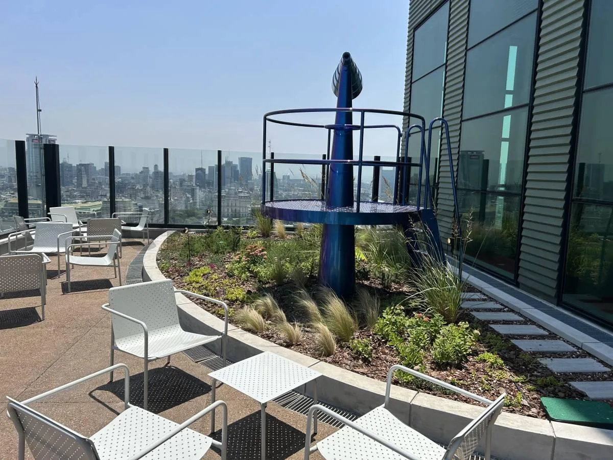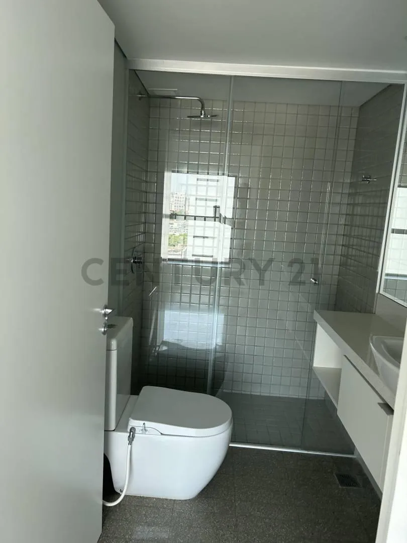 Kitnet para aluguel com vaga de garagem em Puerto Madero. O edifício informa especificações de acabamento: esquadrias de alumínio com janelas de vidro duplo (DVH) e pisos com mosaico granítico pré-polido ou similar. Banheiros com lavatórios e louças do tipo porcelana suspensa, box com revestimento cerâmico e paredes/forros em placas de rocha de gesso, além de espelhos. Cozinha com bancadas e armários superiores em quartzo tipo Silestone branco norte ou similar.