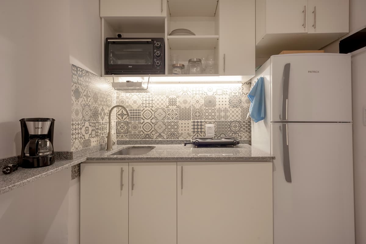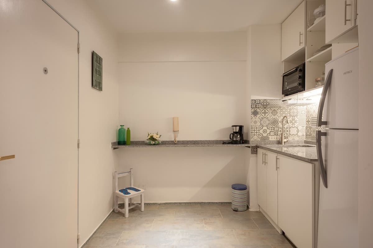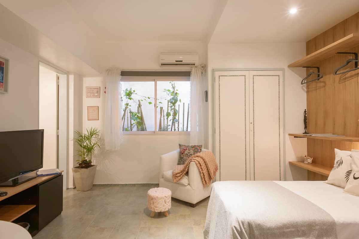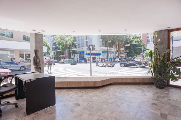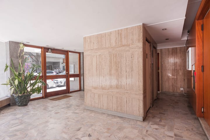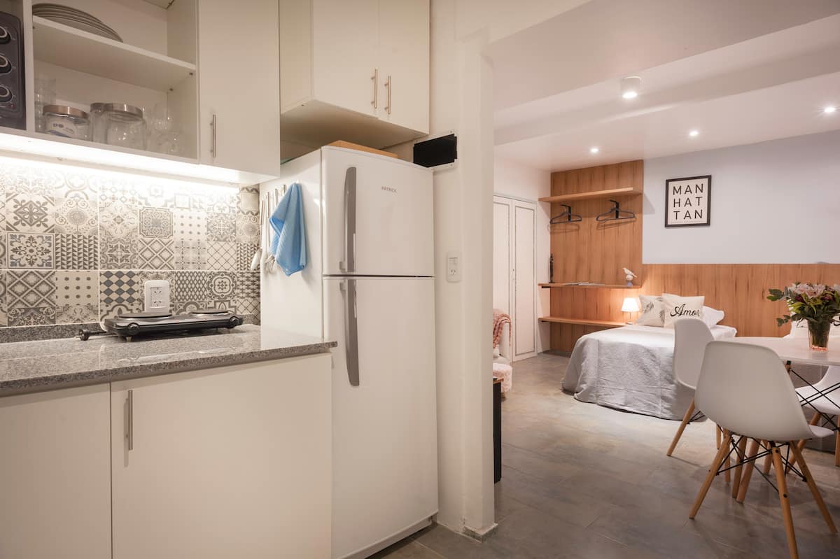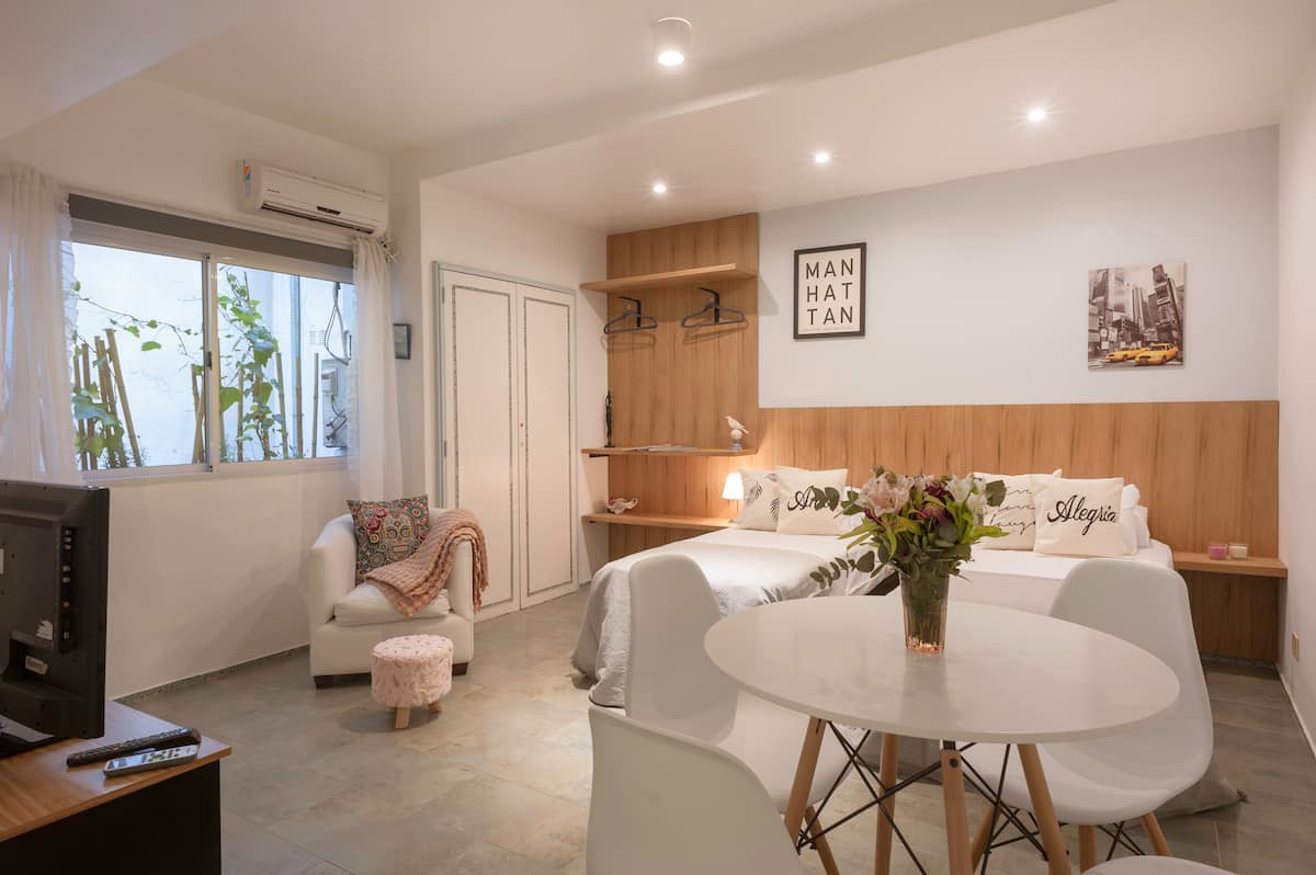 Studio de 30 m² em Recoleta, reformado em novembro de 2022. Possui janela voltada para um pátio interno, com bastante iluminação. O apartamento inclui banheiro e cozinha reformada, com cama e itens de roupa de cama descritos na publicação.