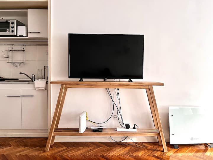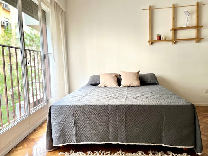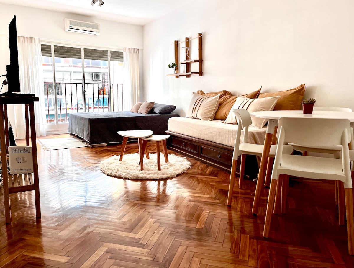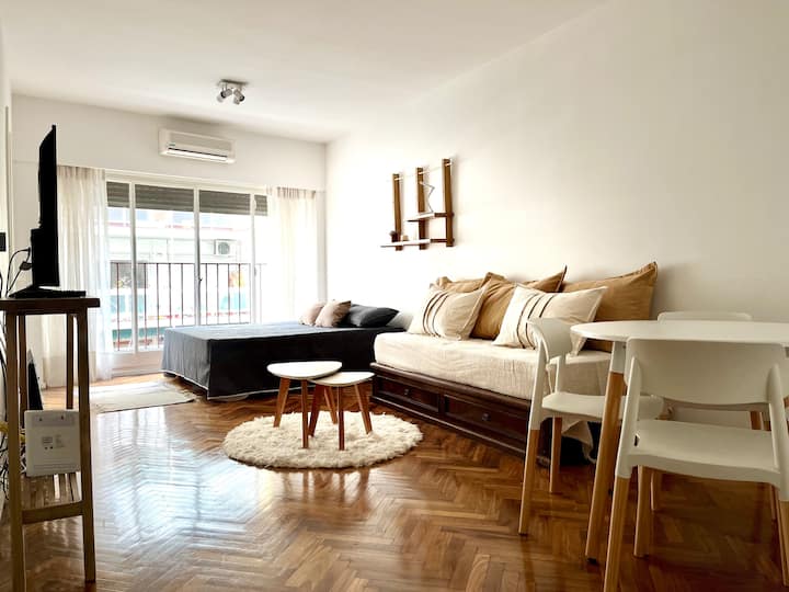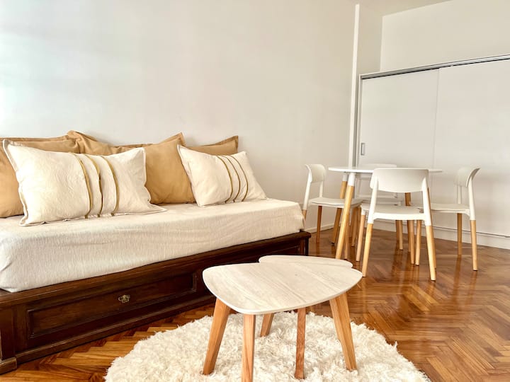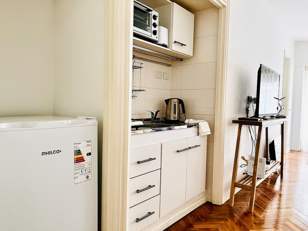 Kitnet em Recoleta, com decoração descrita como agradável. Disponibiliza TV e WiFi, armário grande, além de utensílios como torradeira e chaleira elétrica. A unidade fica na Calle Junín, a uma distância a pé das atrações de Recoleta, da Av. Santa Fe, e de pontos como o Tourist Bus. Para uso de sofá-cama, é necessário solicitar a montagem antes da chegada.