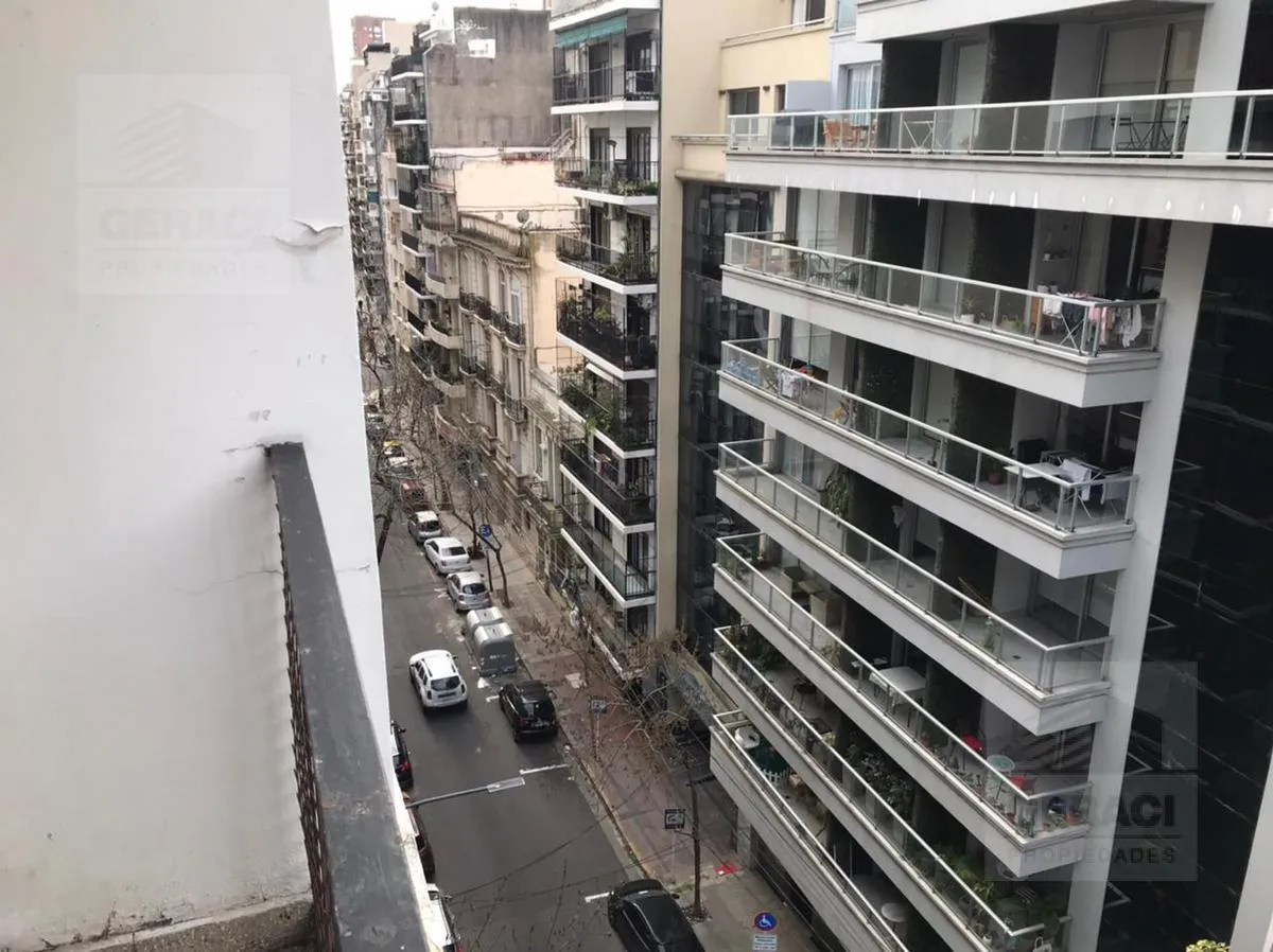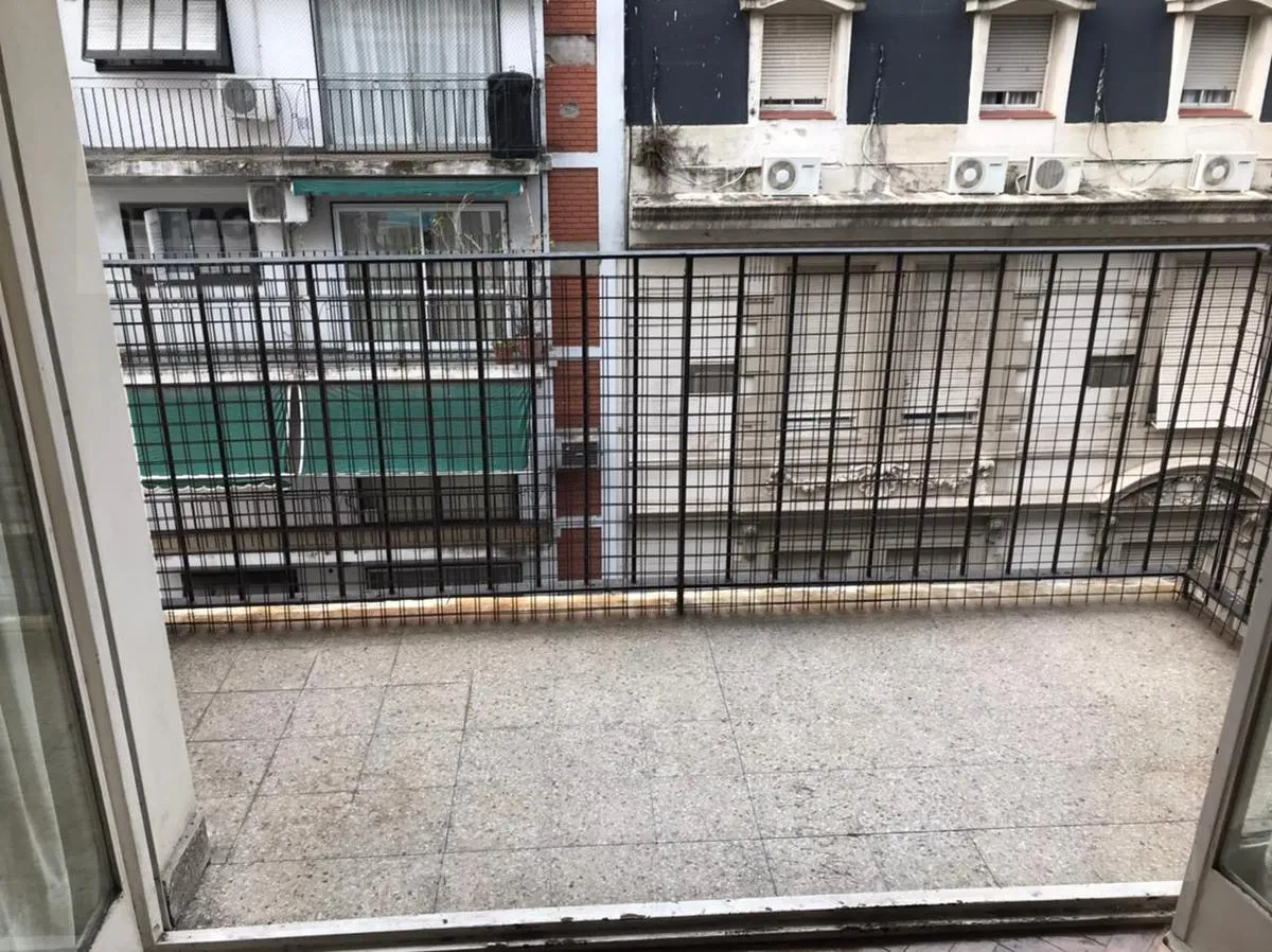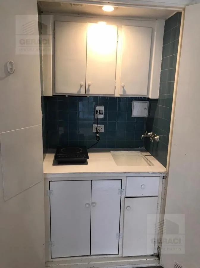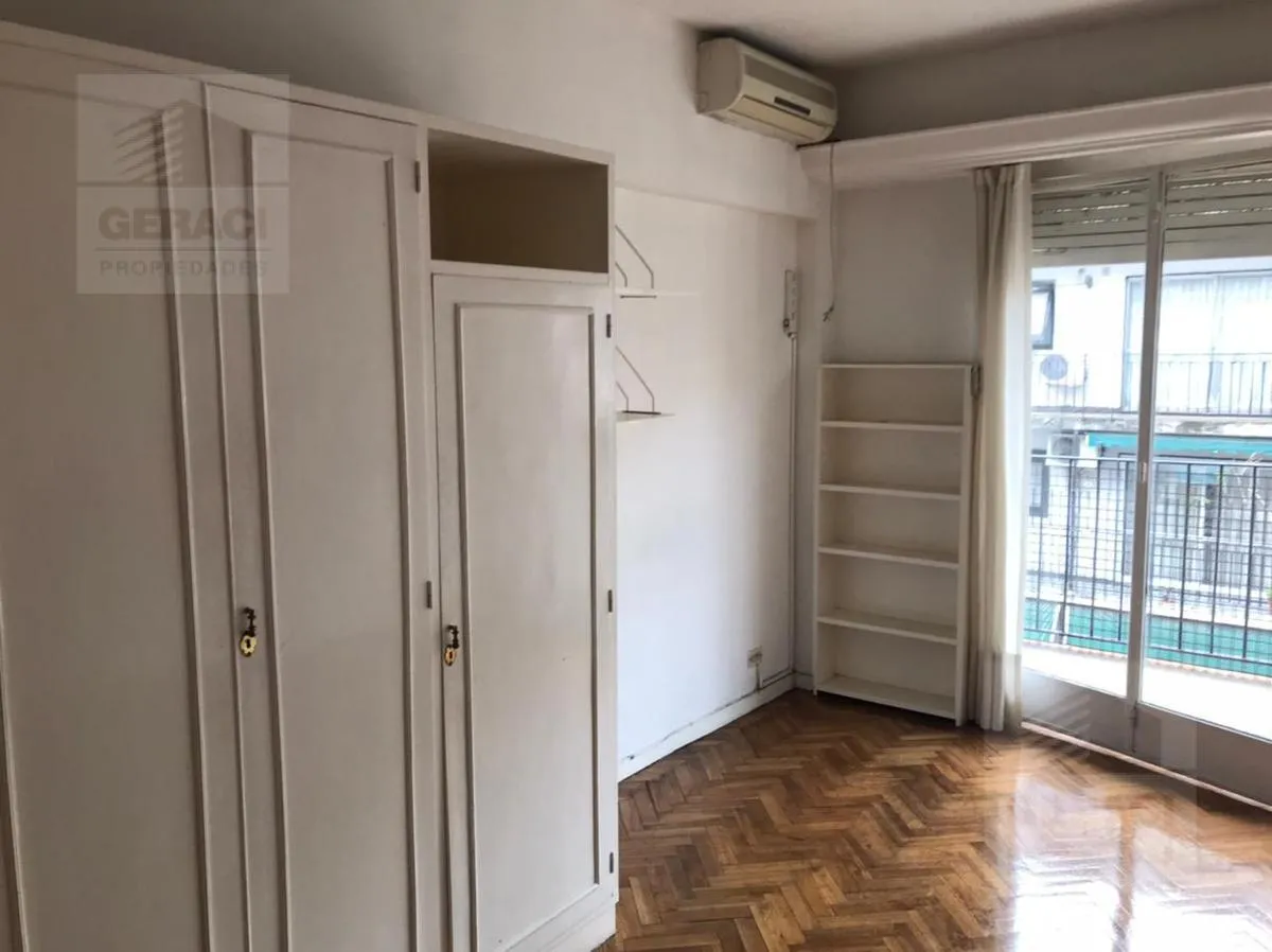 Apartamento de 1 ambiente em Recoleta, com piso de parquet. Tem ar-condicionado frio/calor, cozinha tipo kitchenette com armários e cooktop, e banheiro com box para chuveiro. A publicidade indica condições estimativas e as medidas e encargos devem ser conferidos na documentação do imóvel.