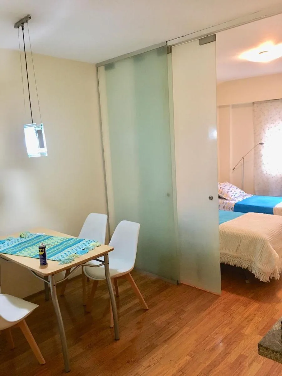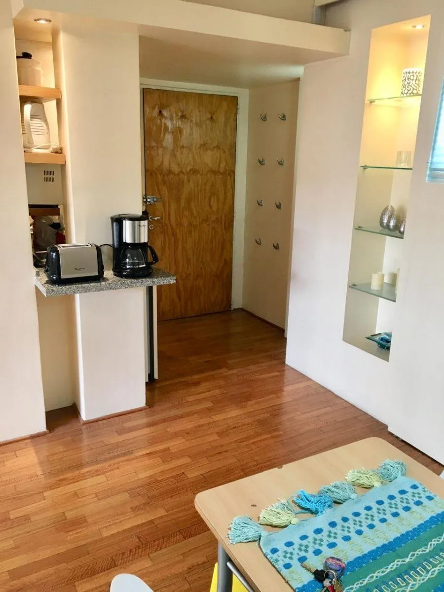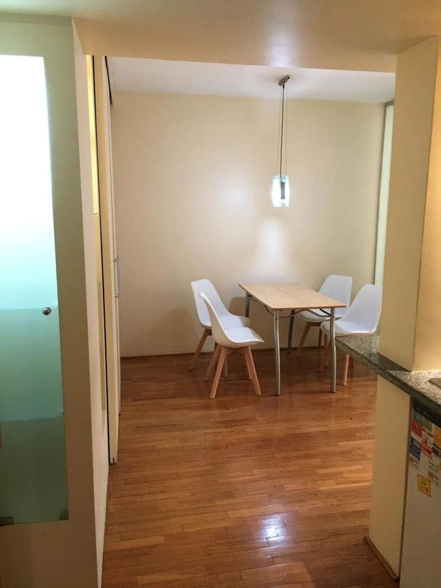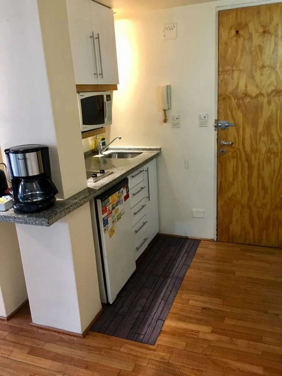 Kitnet (apartamento de um único ambiente) em Recoleta, em Pacheco de Melo 2500 na esquina com Av. Las Heras, com orientação para a frente e para os fundos e janelas amplas. Mobiliada e pronta para morar, com cama/sommier, ar-condicionado frio e quente, TV e cozinha completa com utensílios, micro-ondas e frigobar/geladeira. O valor do aluguel inclui o condomínio (expensas).