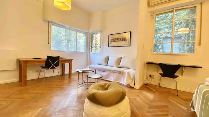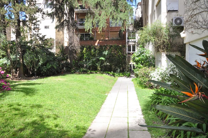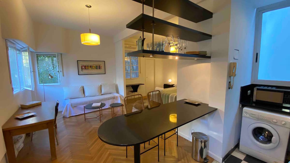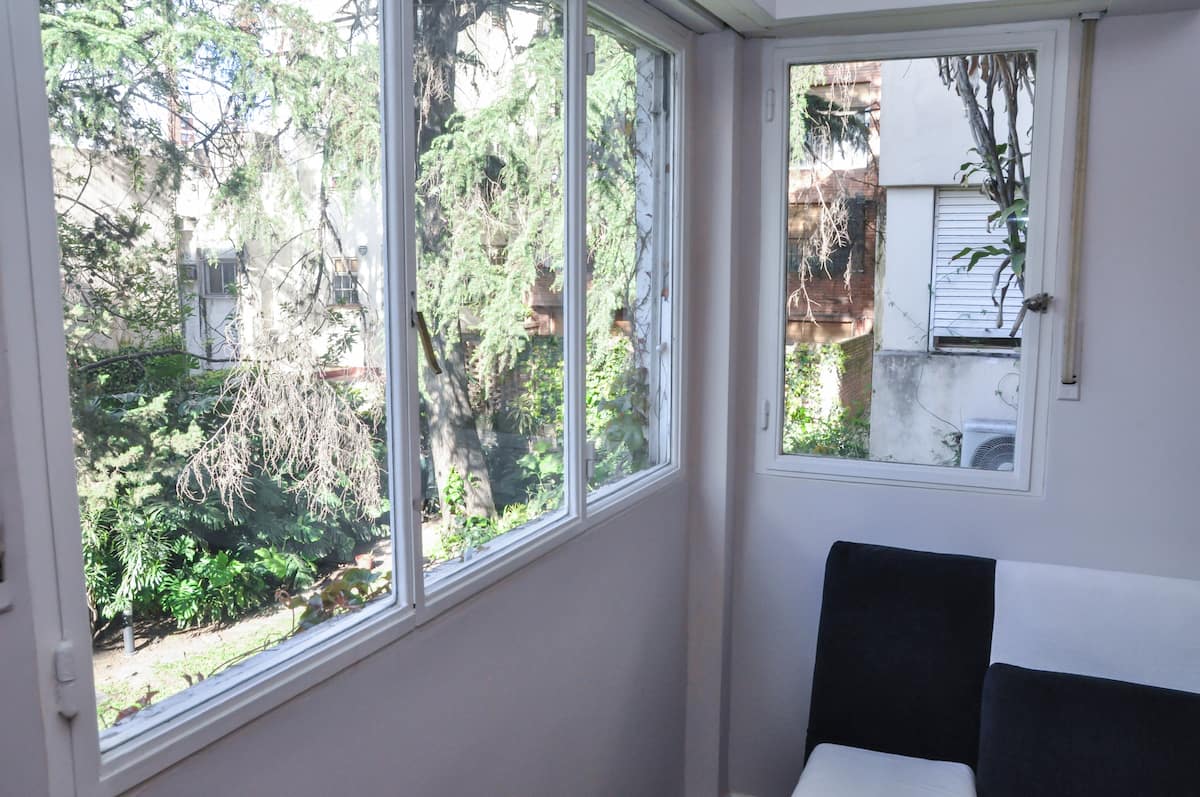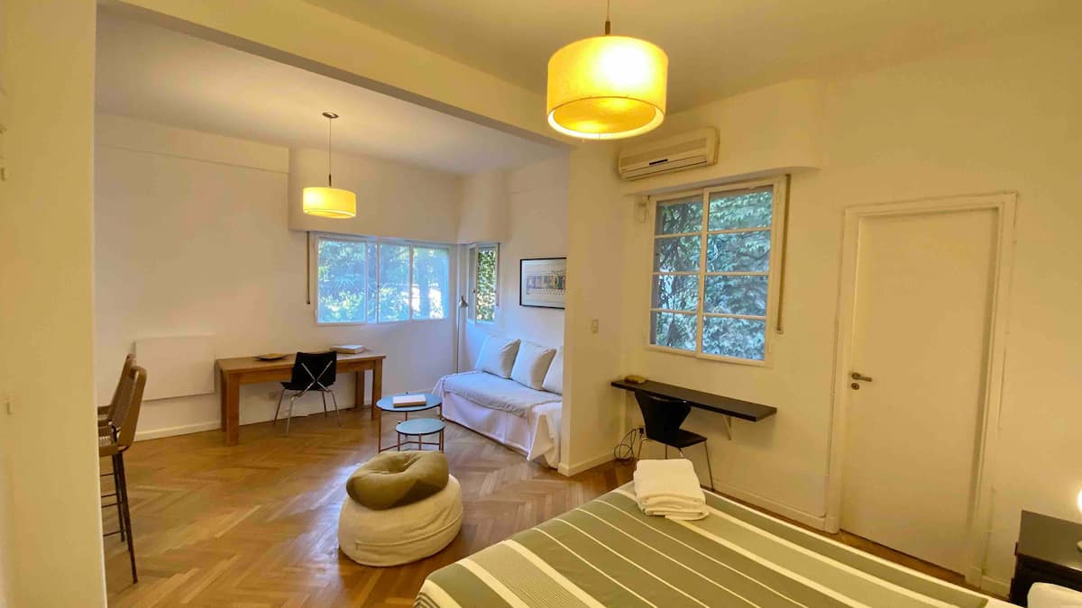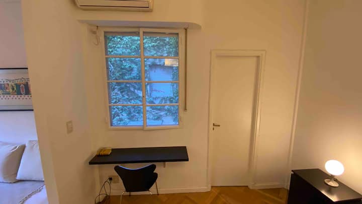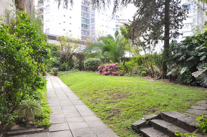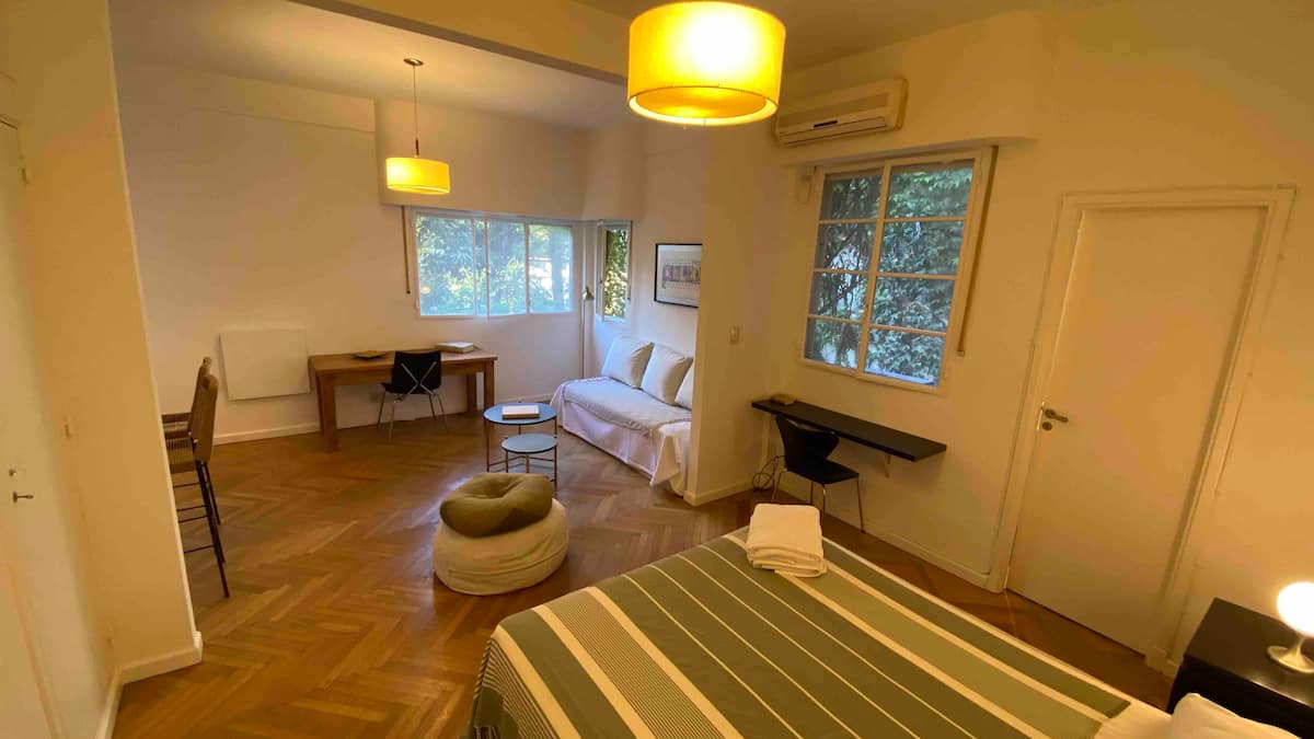 Loft mobiliado em Recoleta, em rua tranquila com árvores, com acesso pela lateral do jardim. Possui área de dormitório com cama queen, guarda-roupa com mesas de cabeceira e abajures, banheiro completo em suíte e ar-condicionado quente/frio. Área de estar com sofá conversível, TV a cabo em tela LCD de 32 polegadas e sistema de som; internet Wi-Fi de alta velocidade e telefone. Cozinha em plano aberto com geladeira com freezer, torradeira elétrica, cafeteira elétrica, micro-ondas e espremedor; máq