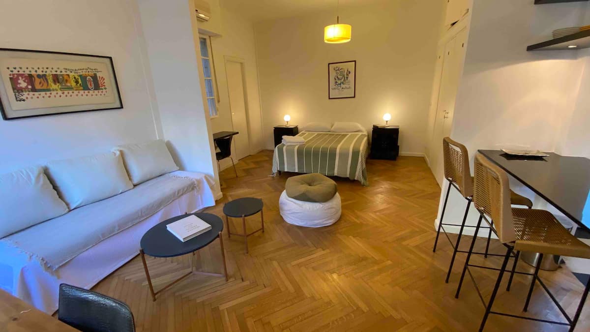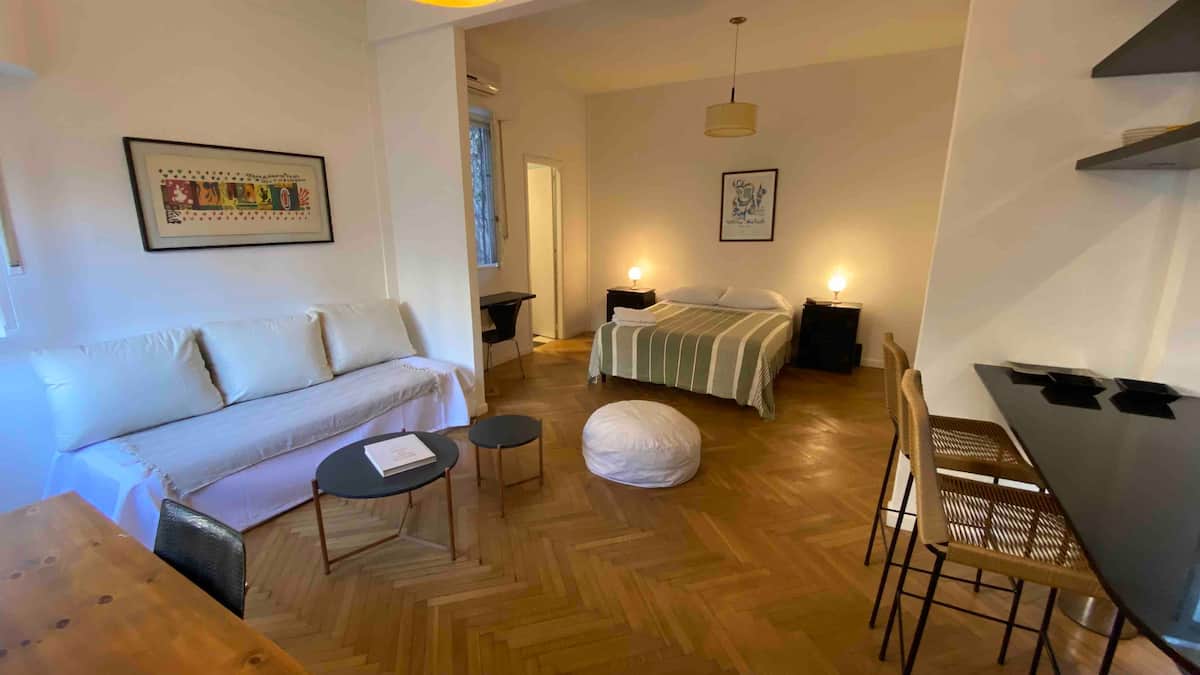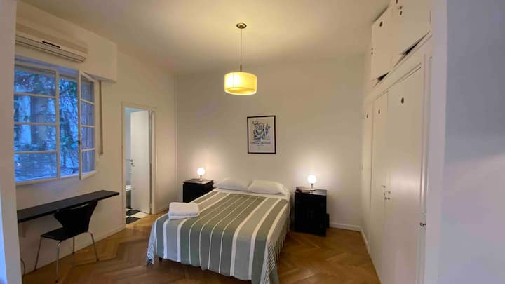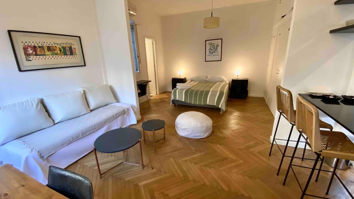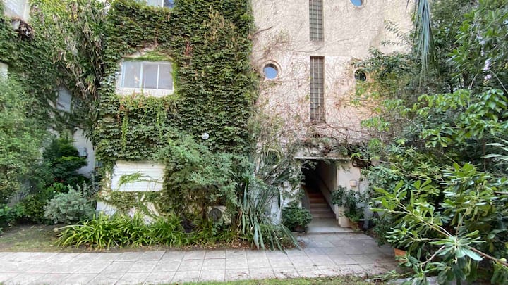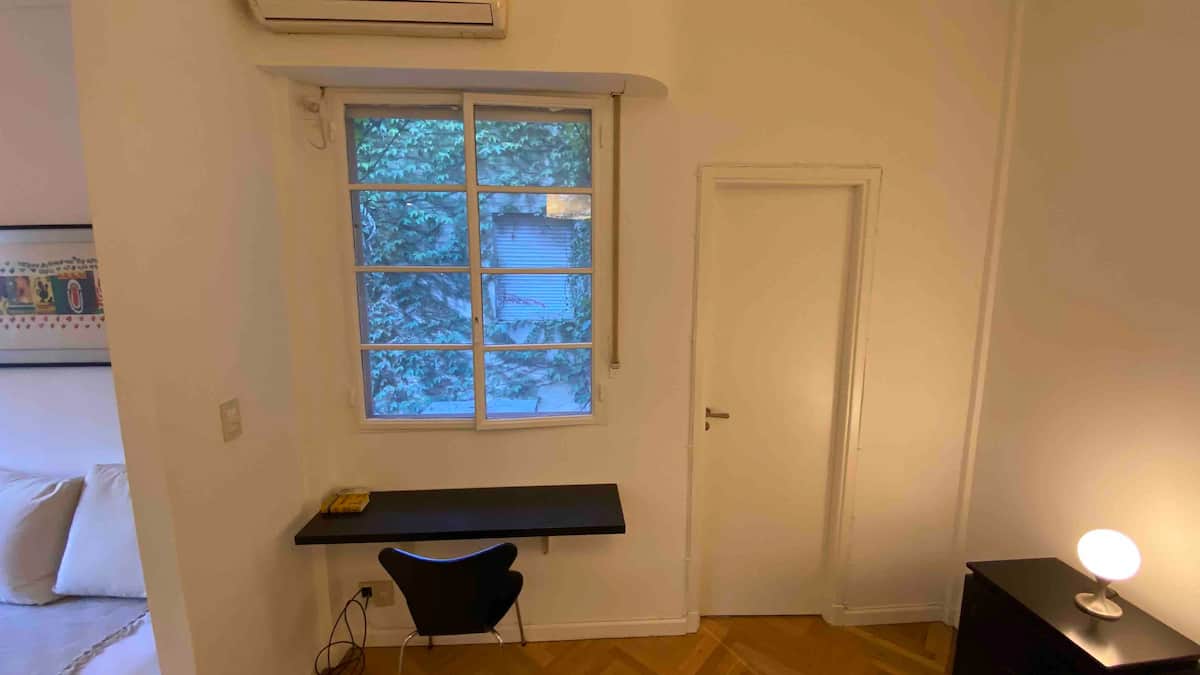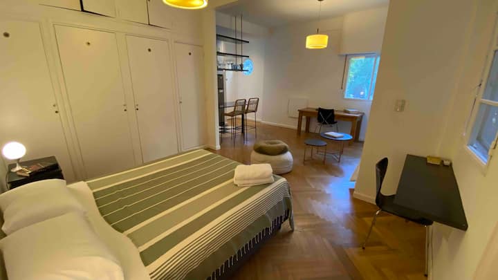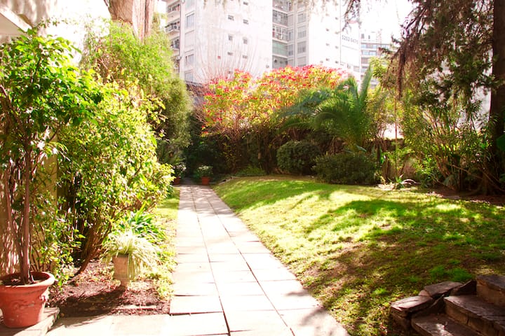 Loft mobiliado em Recoleta, em rua tranquila com árvores, com acesso pela lateral do jardim. Possui área de dormitório com cama queen, guarda-roupa com mesas de cabeceira e abajures, banheiro completo em suíte e ar-condicionado quente/frio. Área de estar com sofá conversível, TV a cabo em tela LCD de 32 polegadas e sistema de som; internet Wi-Fi de alta velocidade e telefone. Cozinha em plano aberto com geladeira com freezer, torradeira elétrica, cafeteira elétrica, micro-ondas e espremedor; máq