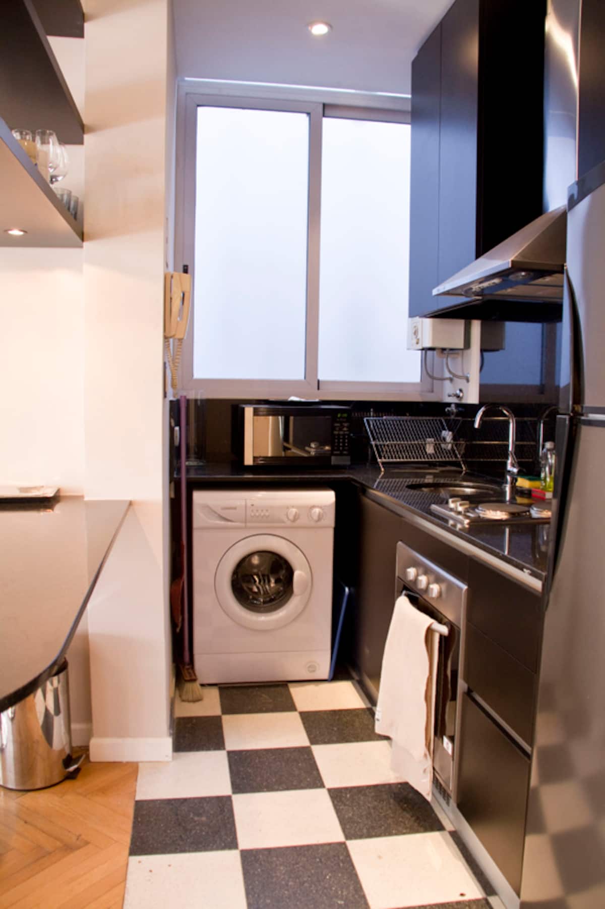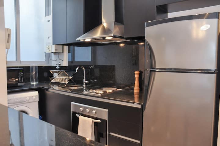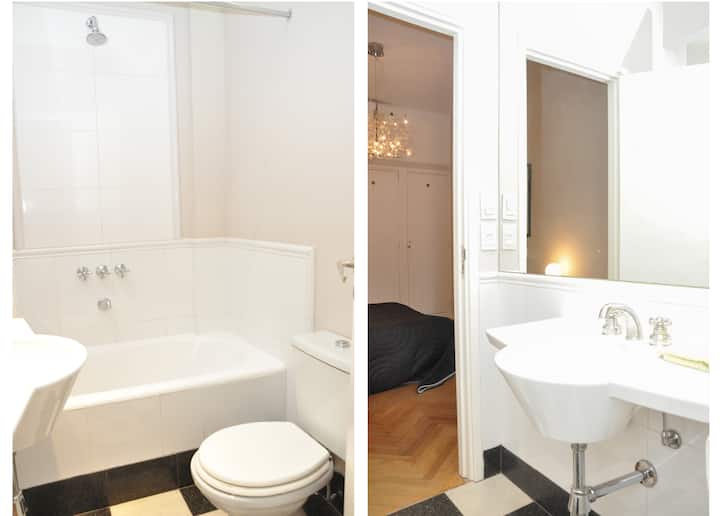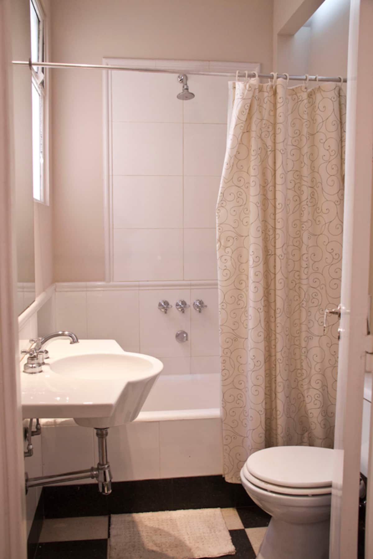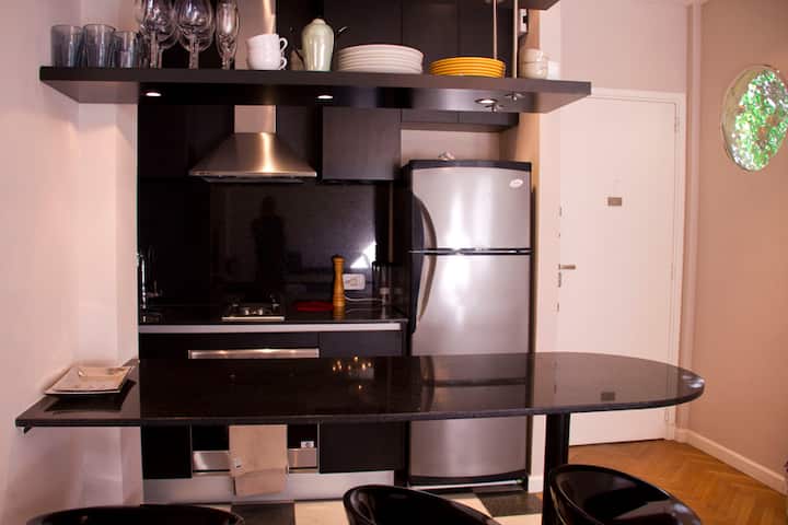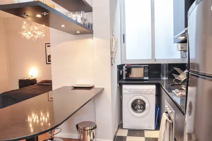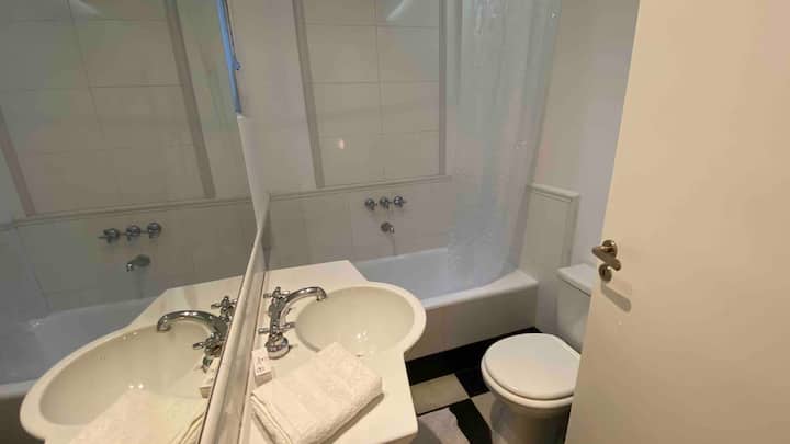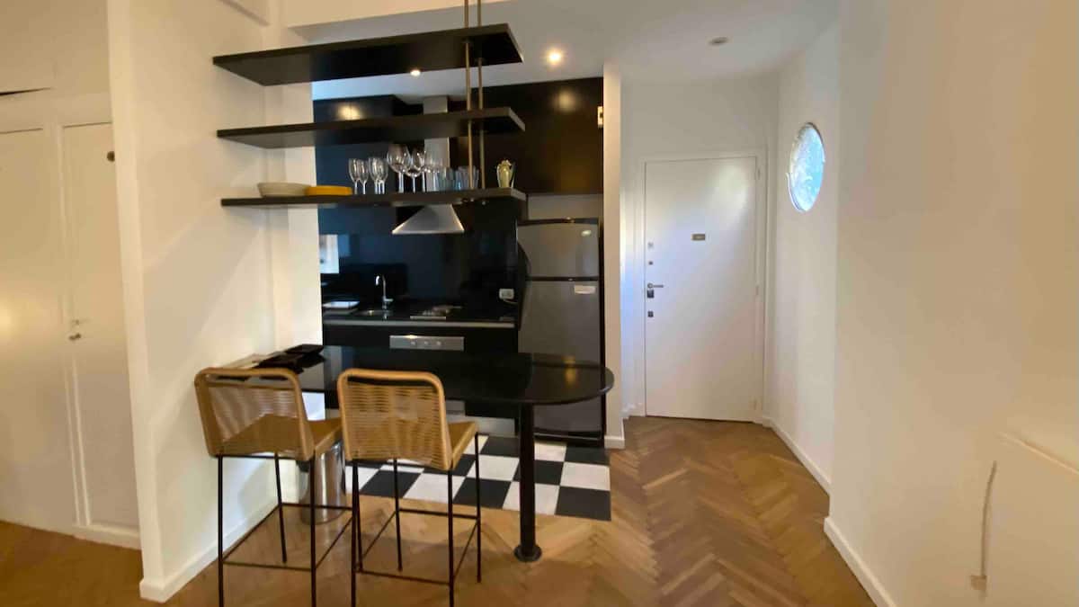 Loft mobiliado em Recoleta, em rua tranquila com árvores, com acesso pela lateral do jardim. Possui área de dormitório com cama queen, guarda-roupa com mesas de cabeceira e abajures, banheiro completo em suíte e ar-condicionado quente/frio. Área de estar com sofá conversível, TV a cabo em tela LCD de 32 polegadas e sistema de som; internet Wi-Fi de alta velocidade e telefone. Cozinha em plano aberto com geladeira com freezer, torradeira elétrica, cafeteira elétrica, micro-ondas e espremedor; máq