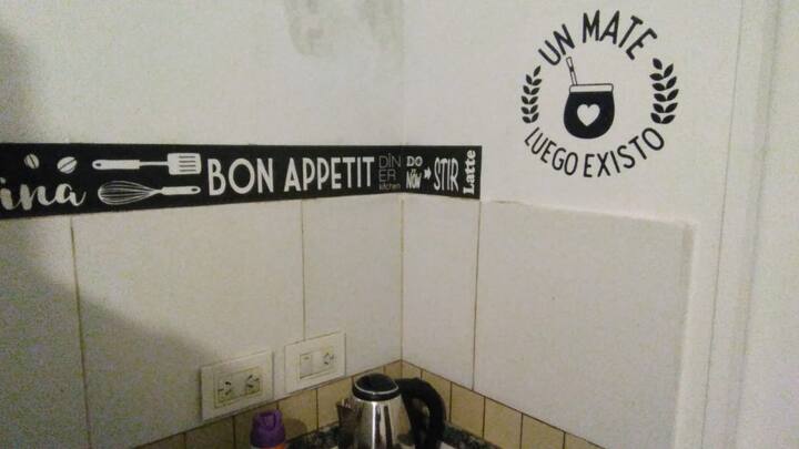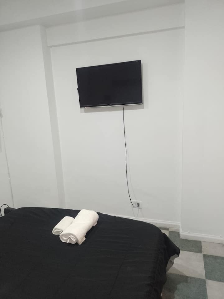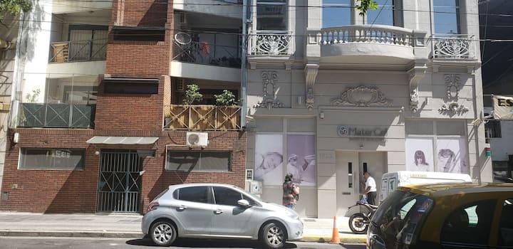 Apartamento de 2 ambientes no térreo, com entrada pela rua em Recoleta, a 2 quadras do Hospital Ricardo Gutiérrez e da Av. Córdoba e a 3 quadras da estação de metrô em Av. Santa Fe. O ambiente tem cama de casal, TV com internet e canais e Wi-Fi; inclui mesa e área de trabalho. A cozinha tem anafe, pava elétrica e micro-ondas, além de geladeira e utensílios básicos. Há banheiro completo com box de chuveiro. A hospedagem menciona check-in sem presença, com acesso por autoatendimento.