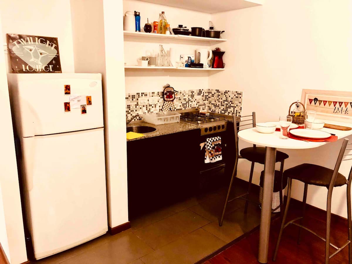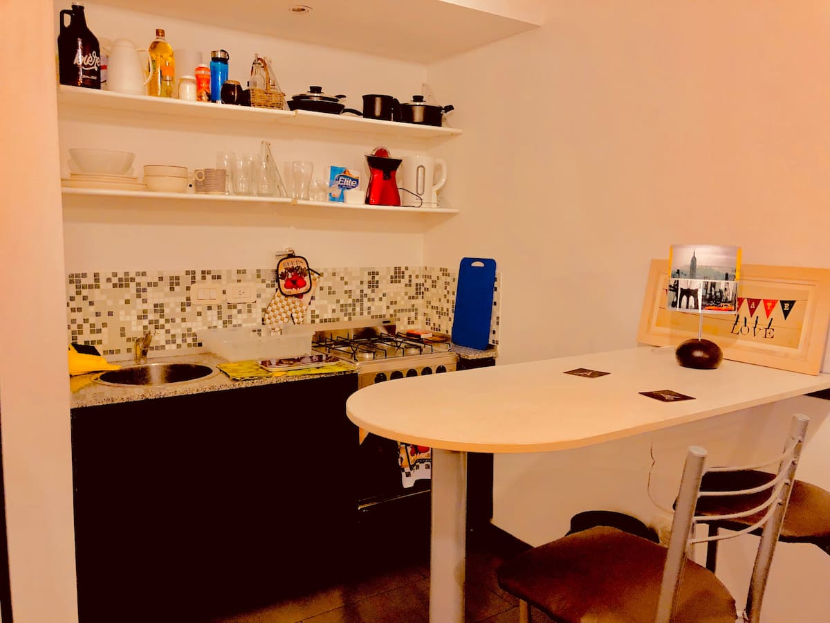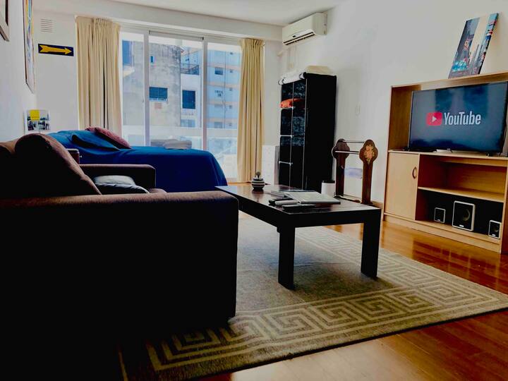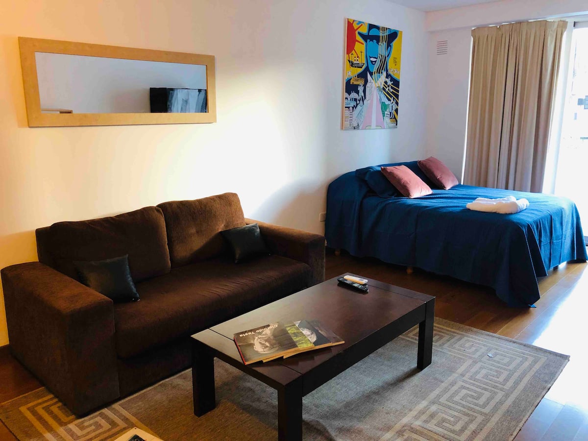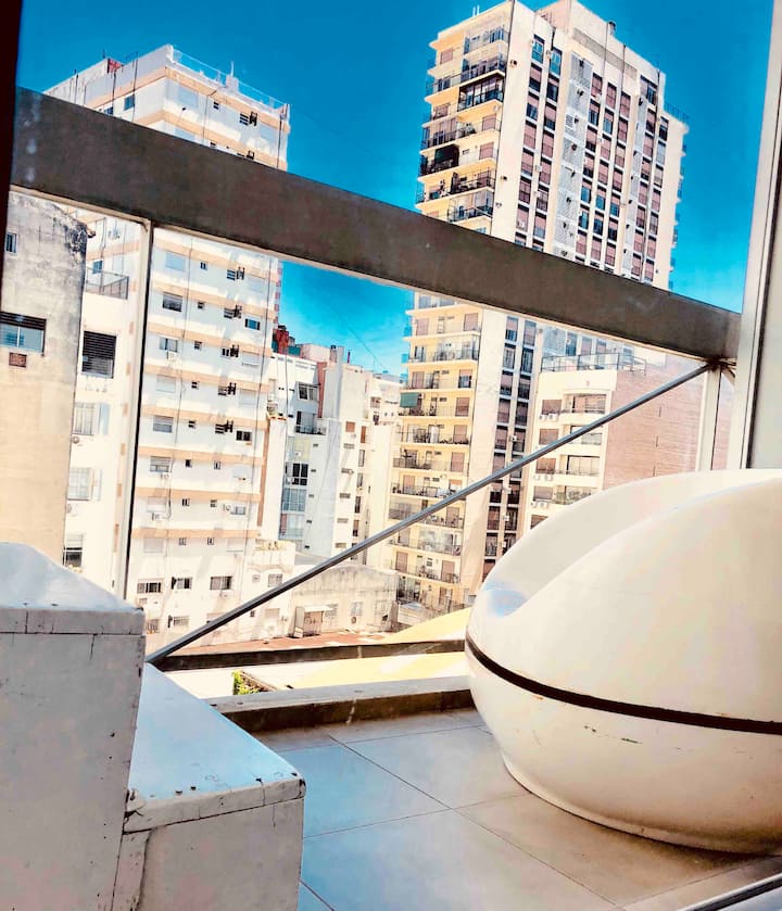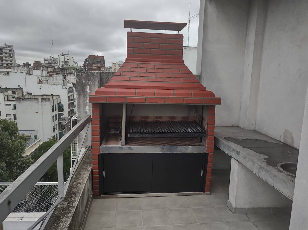 Kitnet mobiliada de 43 m² entre Palermo e Recoleta. Inclui cozinha completa, banheiro, cama queen, sofá e TV com TV a cabo e internet WiFi, além de Netflix e Flow. Há varanda privativa com vista aberta e área de churrasco no terraço do prédio com piscina; o prédio também tem lavanderia e solário.