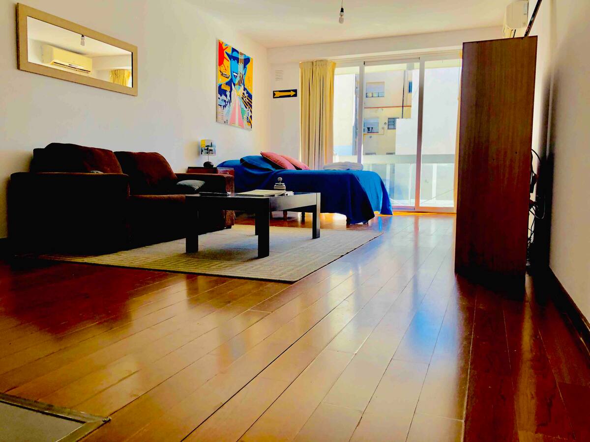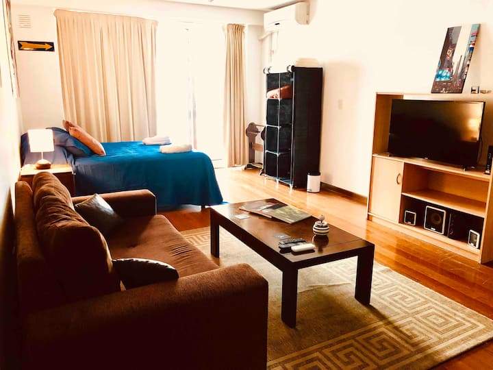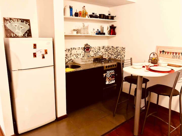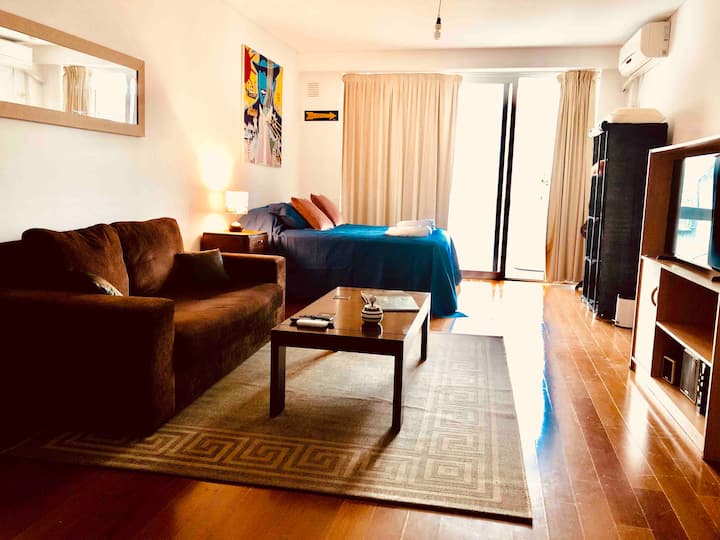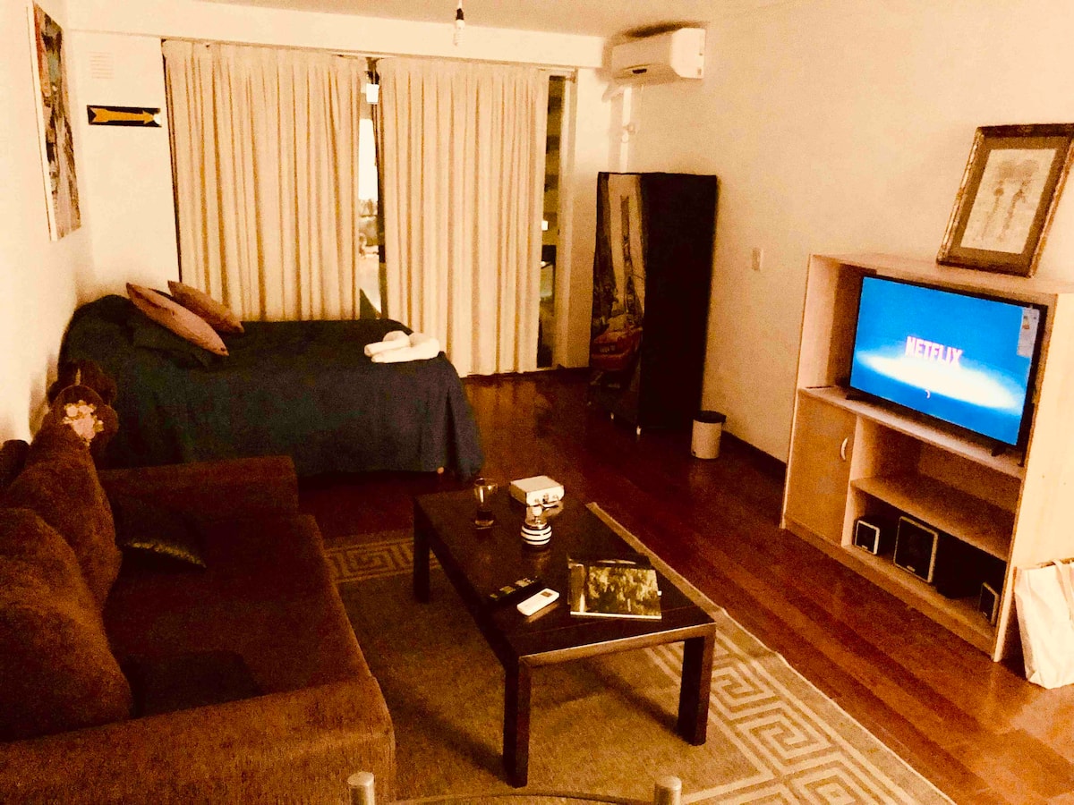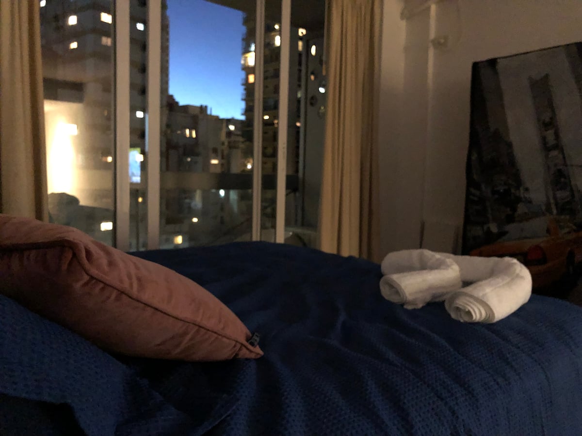 Kitnet mobiliada de 43 m² entre Palermo e Recoleta. Inclui cozinha completa, banheiro, cama queen, sofá e TV com TV a cabo e internet WiFi, além de Netflix e Flow. Há varanda privativa com vista aberta e área de churrasco no terraço do prédio com piscina; o prédio também tem lavanderia e solário.