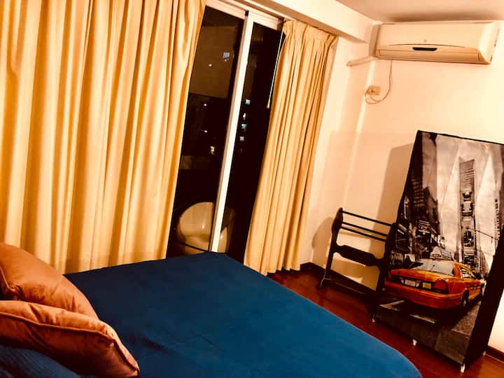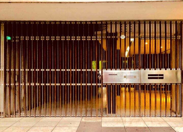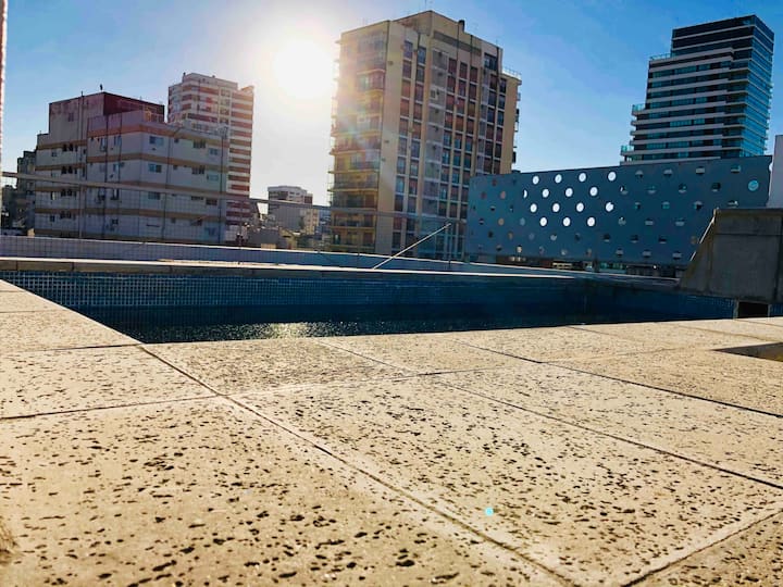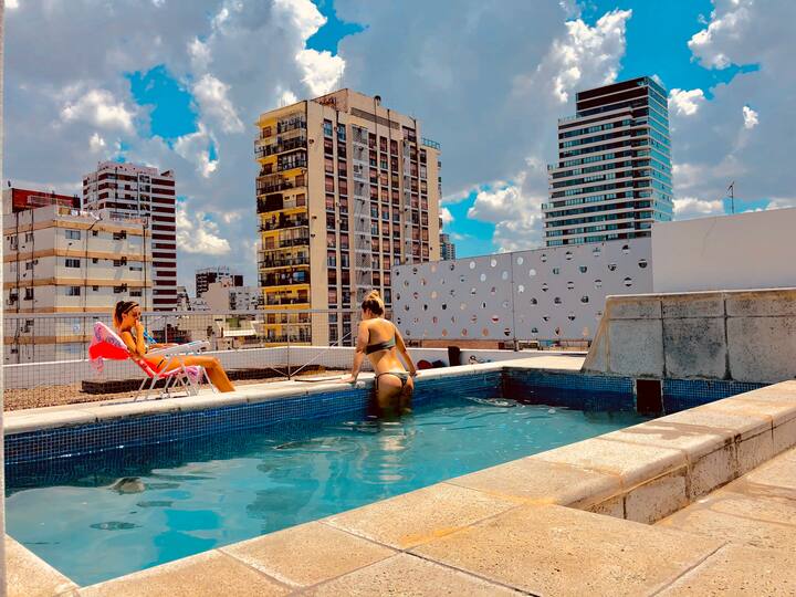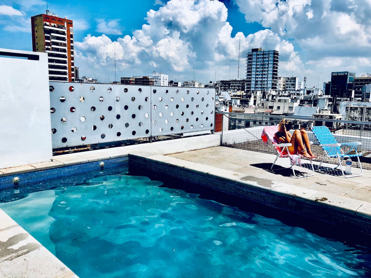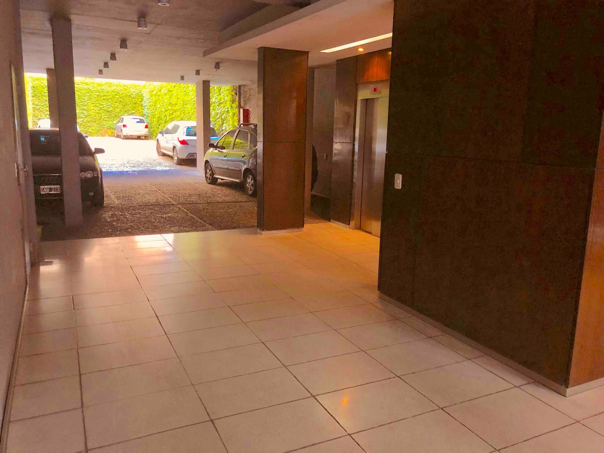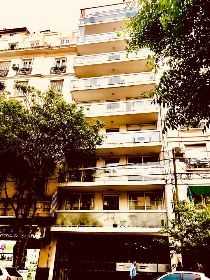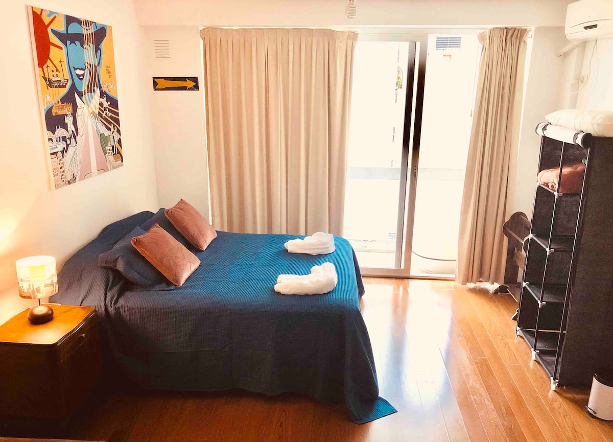 Kitnet mobiliada de 43 m² entre Palermo e Recoleta. Inclui cozinha completa, banheiro, cama queen, sofá e TV com TV a cabo e internet WiFi, além de Netflix e Flow. Há varanda privativa com vista aberta e área de churrasco no terraço do prédio com piscina; o prédio também tem lavanderia e solário.