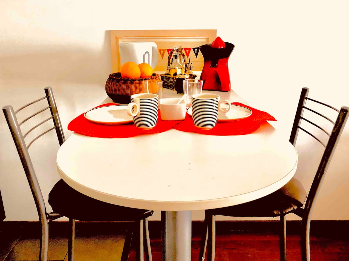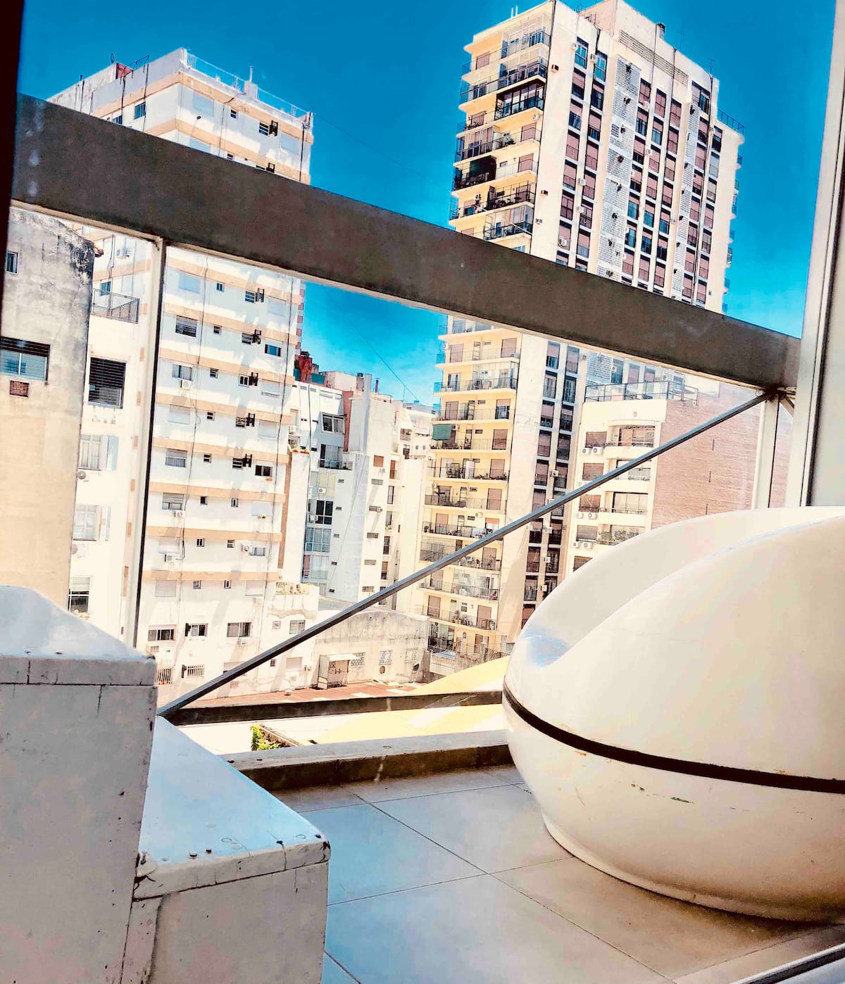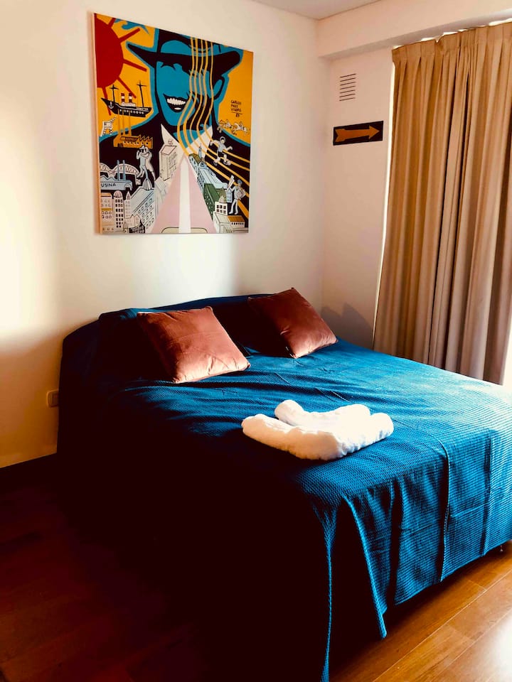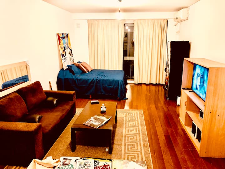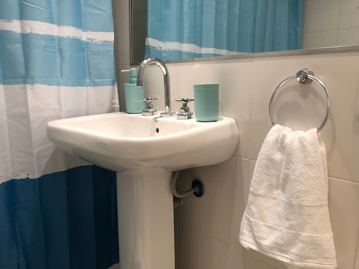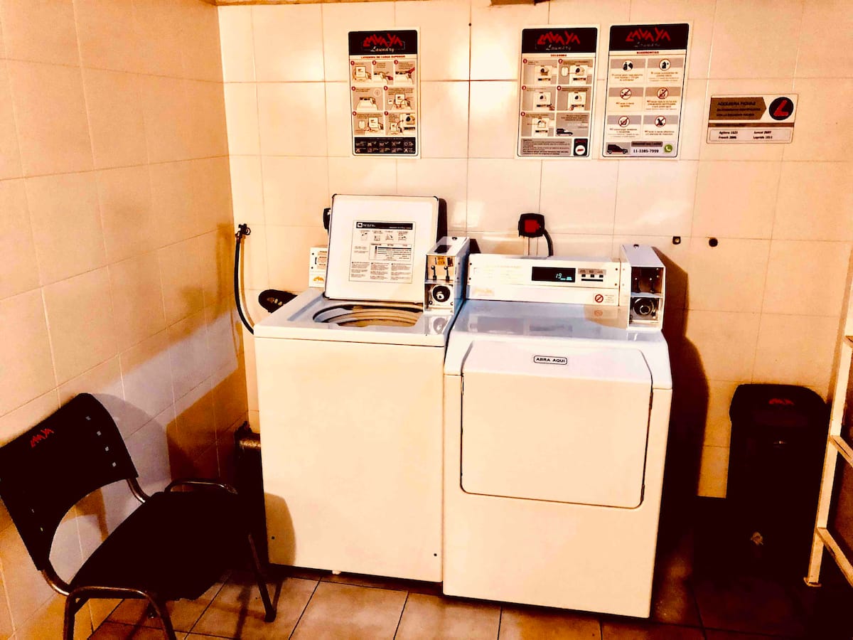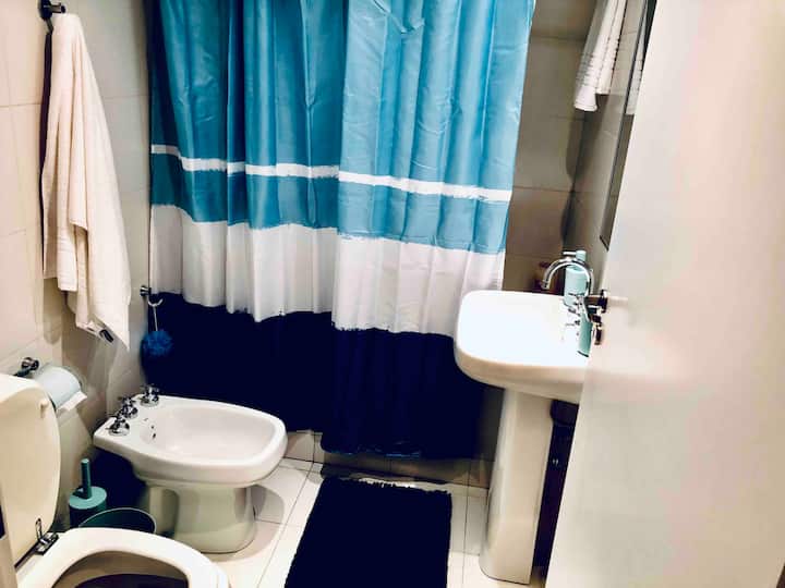 Kitnet mobiliada de 43 m² entre Palermo e Recoleta. Inclui cozinha completa, banheiro, cama queen, sofá e TV com TV a cabo e internet WiFi, além de Netflix e Flow. Há varanda privativa com vista aberta e área de churrasco no terraço do prédio com piscina; o prédio também tem lavanderia e solário.