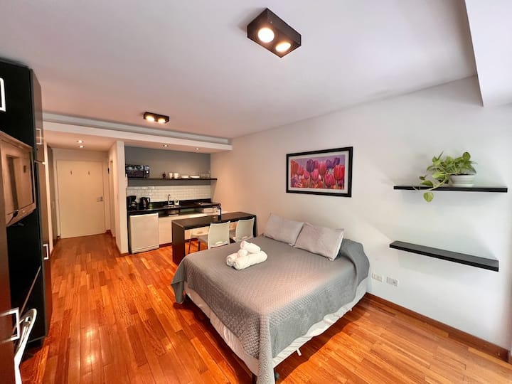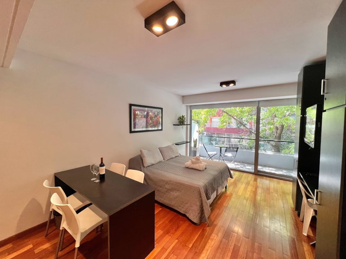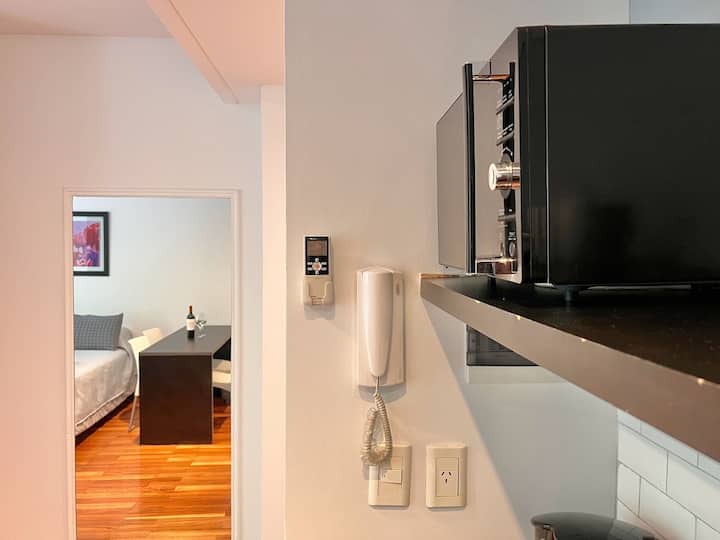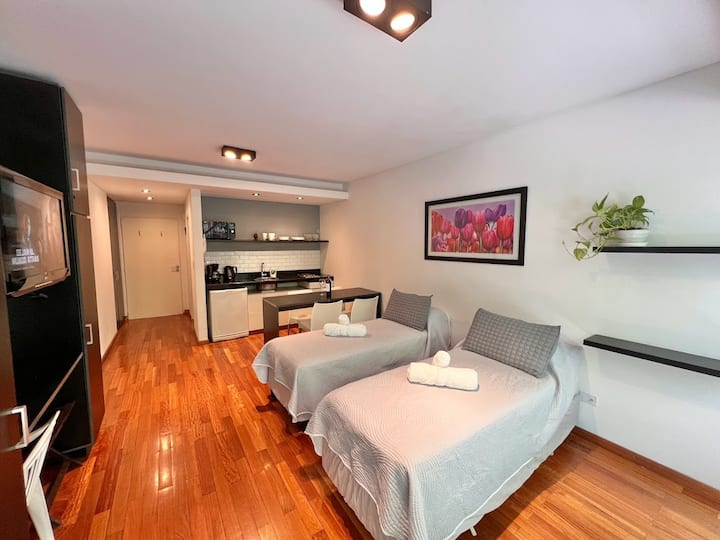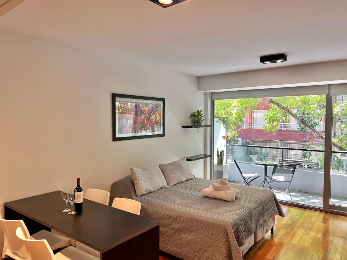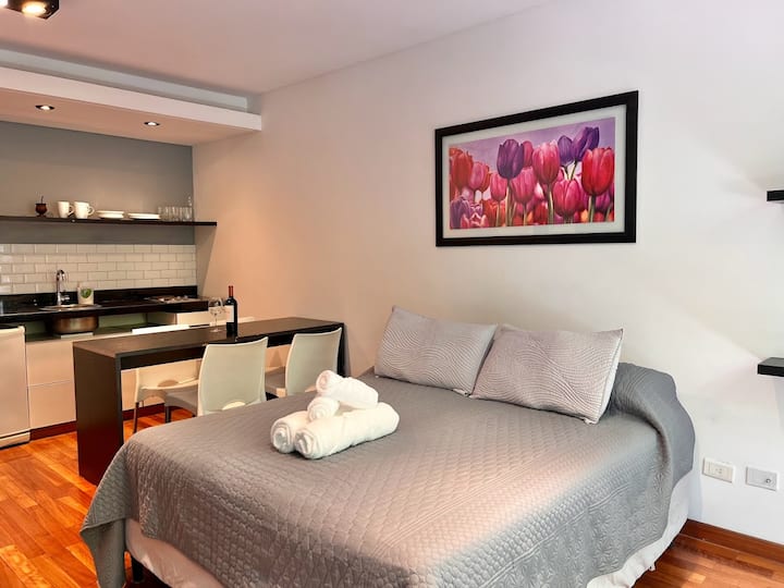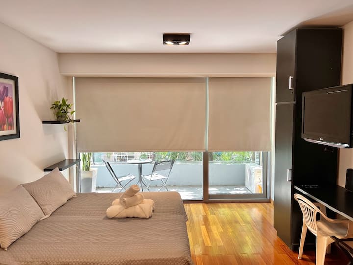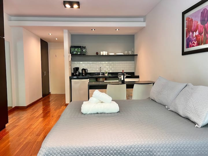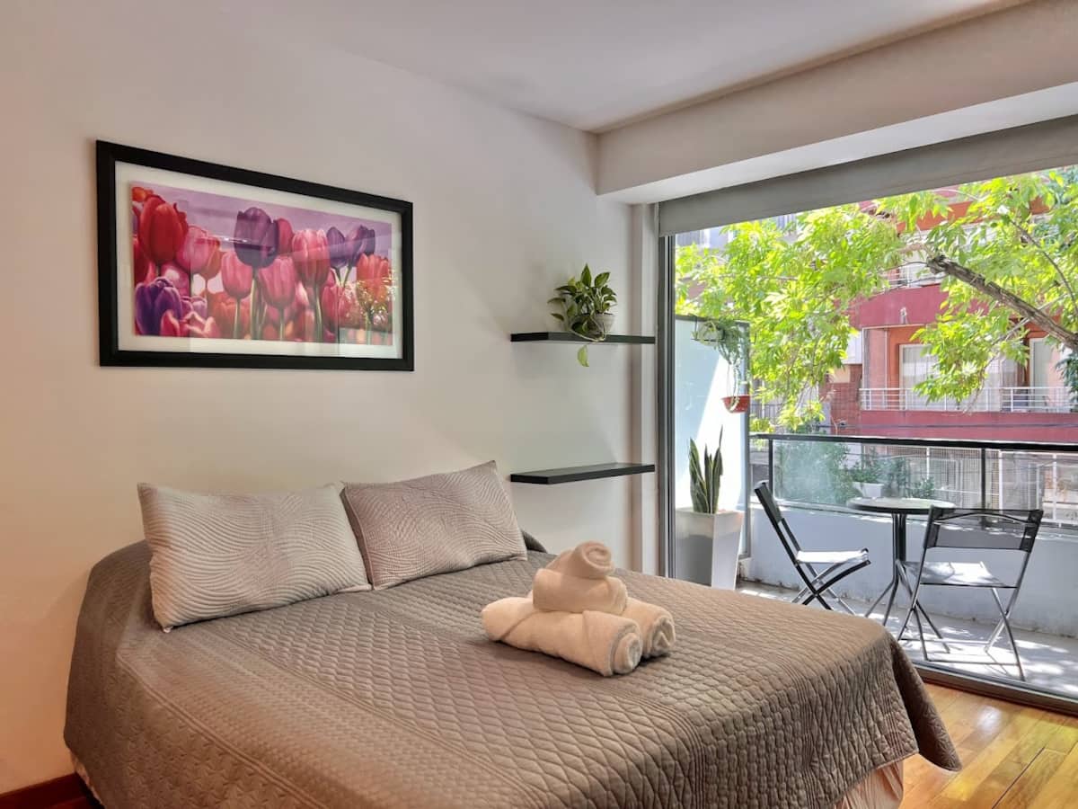 Studio (kitnet) em Recoleta, com varanda e voltado para a rua, em edifício moderno. Apartamento mobiliado e equipado, com cozinha completa, internet (wifi) e smart TV. Há área de lavanderia no prédio e setor de spa com sauna e piscina interna, com uso ao longo do ano.