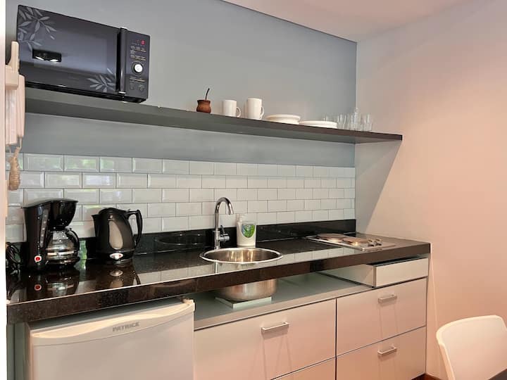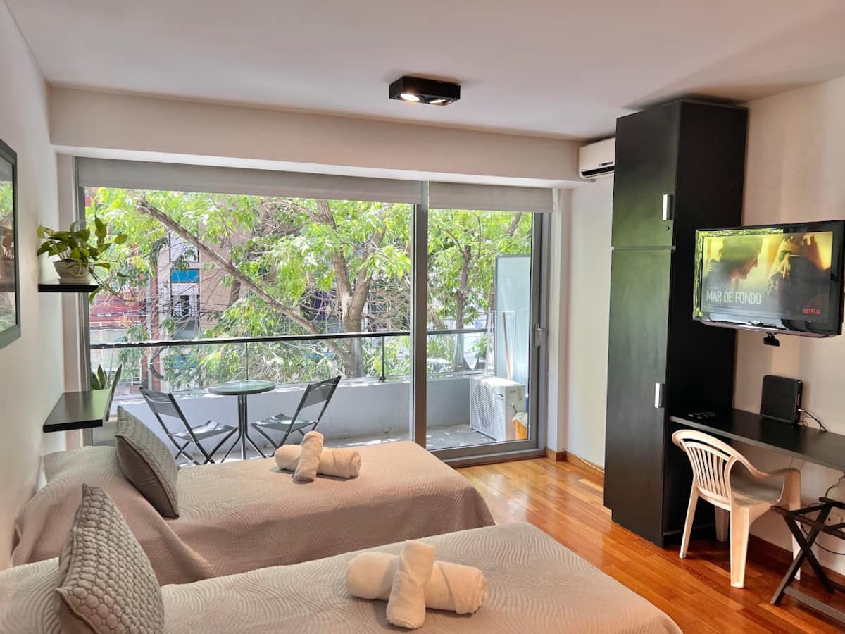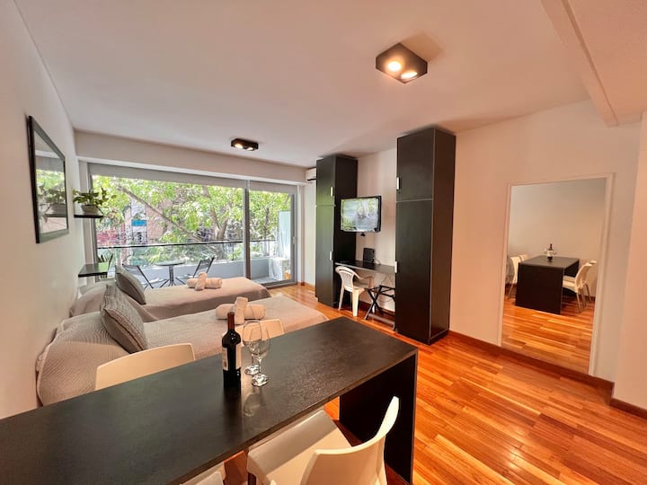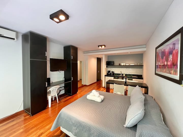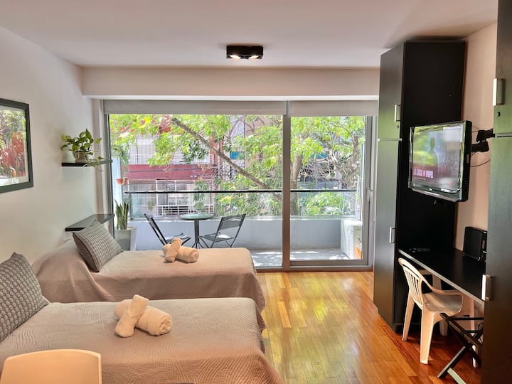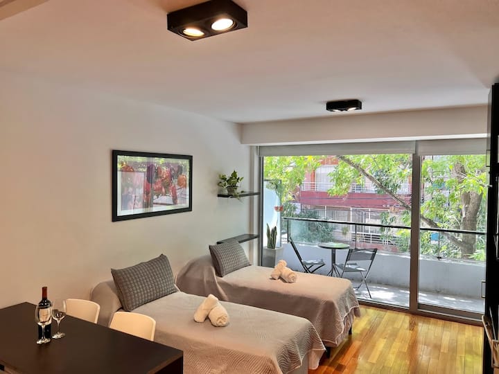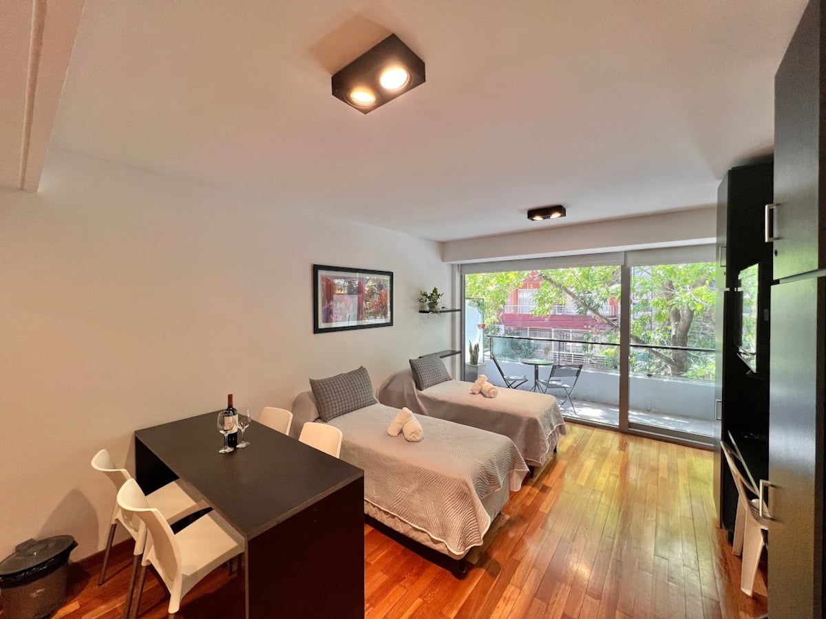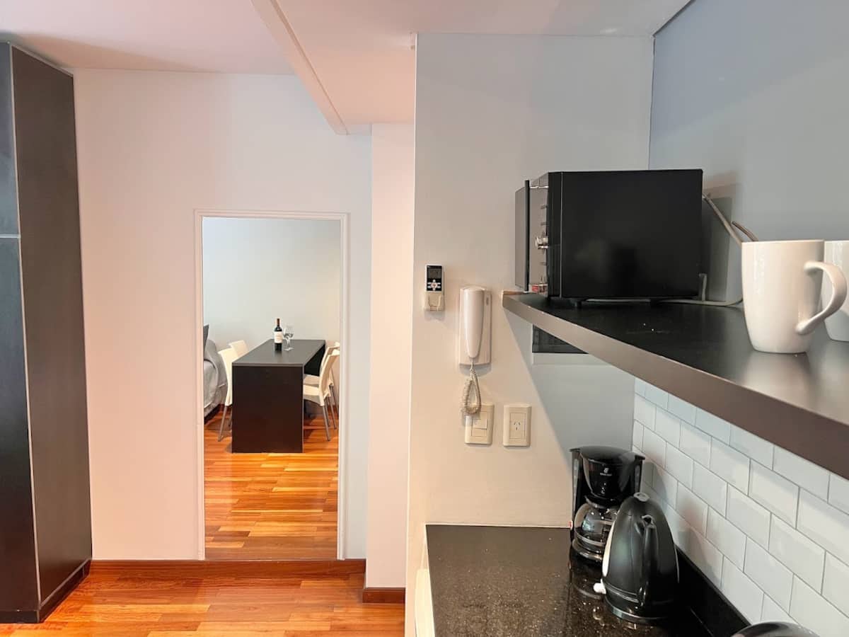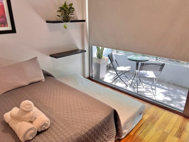 Studio (kitnet) em Recoleta, com varanda e voltado para a rua, em edifício moderno. Apartamento mobiliado e equipado, com cozinha completa, internet (wifi) e smart TV. Há área de lavanderia no prédio e setor de spa com sauna e piscina interna, com uso ao longo do ano.