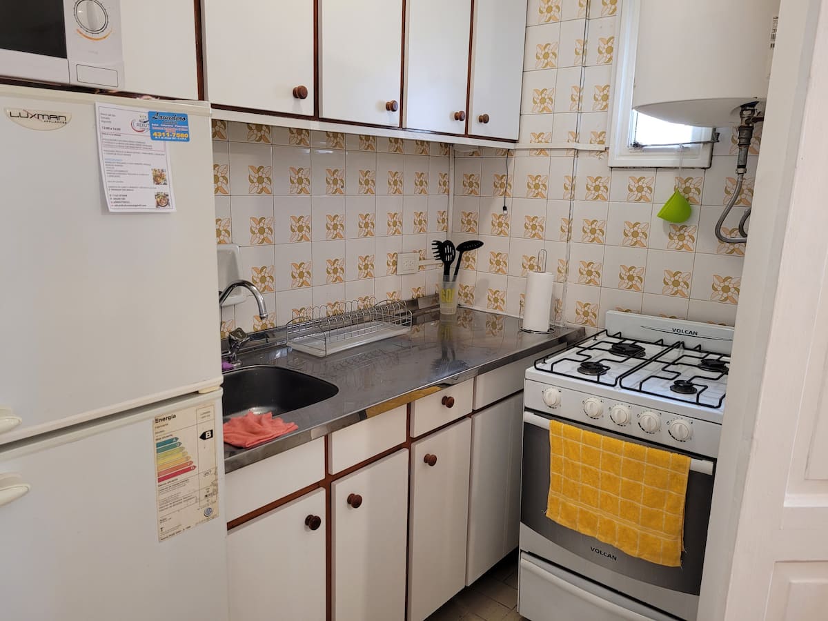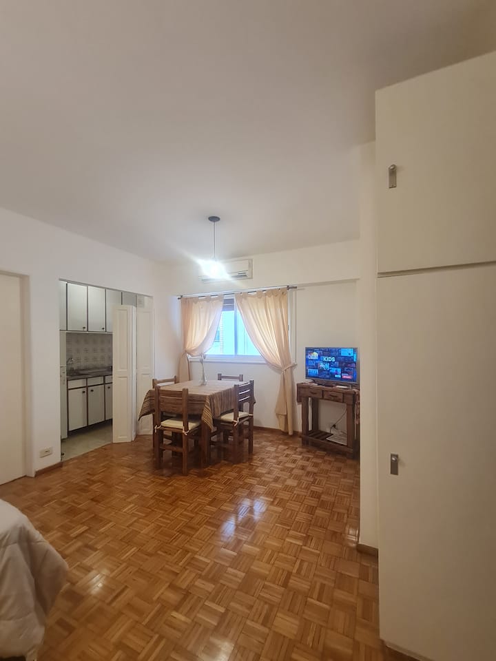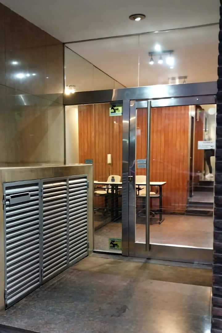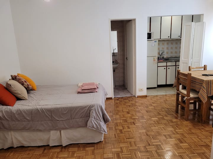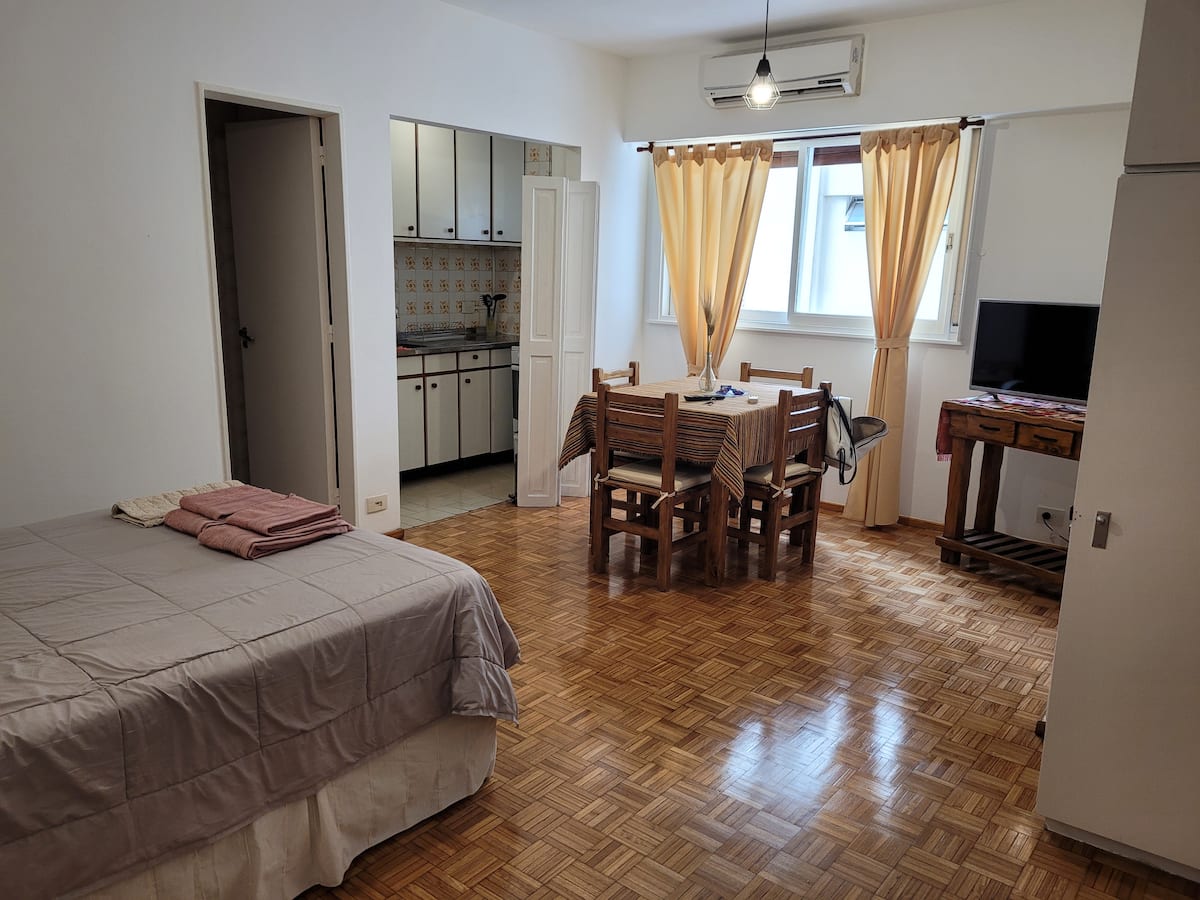 Kitnet mobiliada em Buenos Aires, no bairro Retiro. Fica a 1 quarteirão da Av. 9 de Julio e da Av. Santa Fe, com acesso a Teatro Colón e à Plaza San Martín, além do terminal de Retiro. O imóvel está totalmente equipado e inclui cozinha completa.