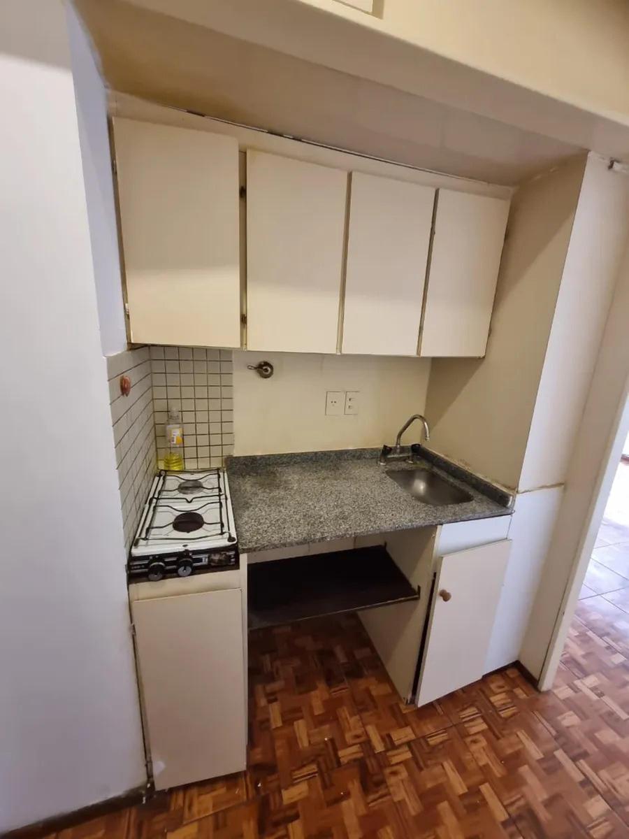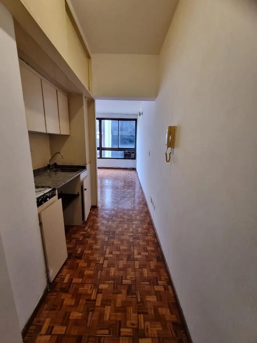 Kitnet para alugar no Retiro, Buenos Aires, em edifício acessado por elevador. Fica no andar alto, de frente para a rua, com orientação ao norte. Possui cozinha elétrica com armários superiores e inferiores, espaço principal com nichos embutidos para armazenamento e 1 banheiro completo. Superfície total aproximada de 26 m² cobertos.