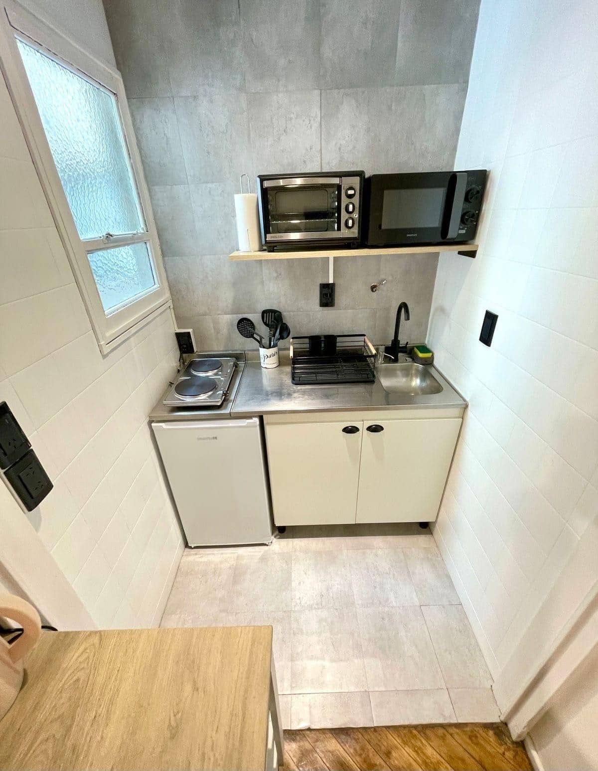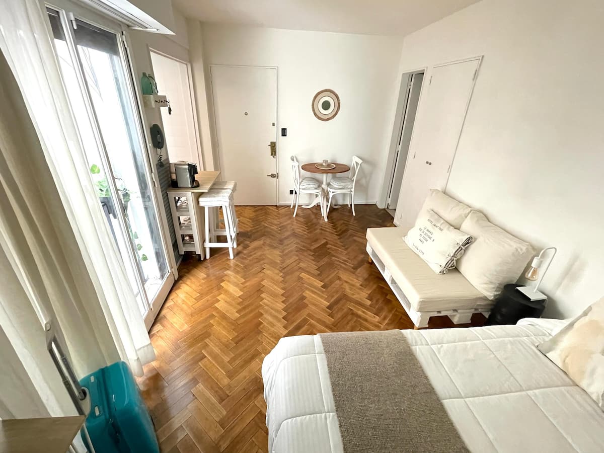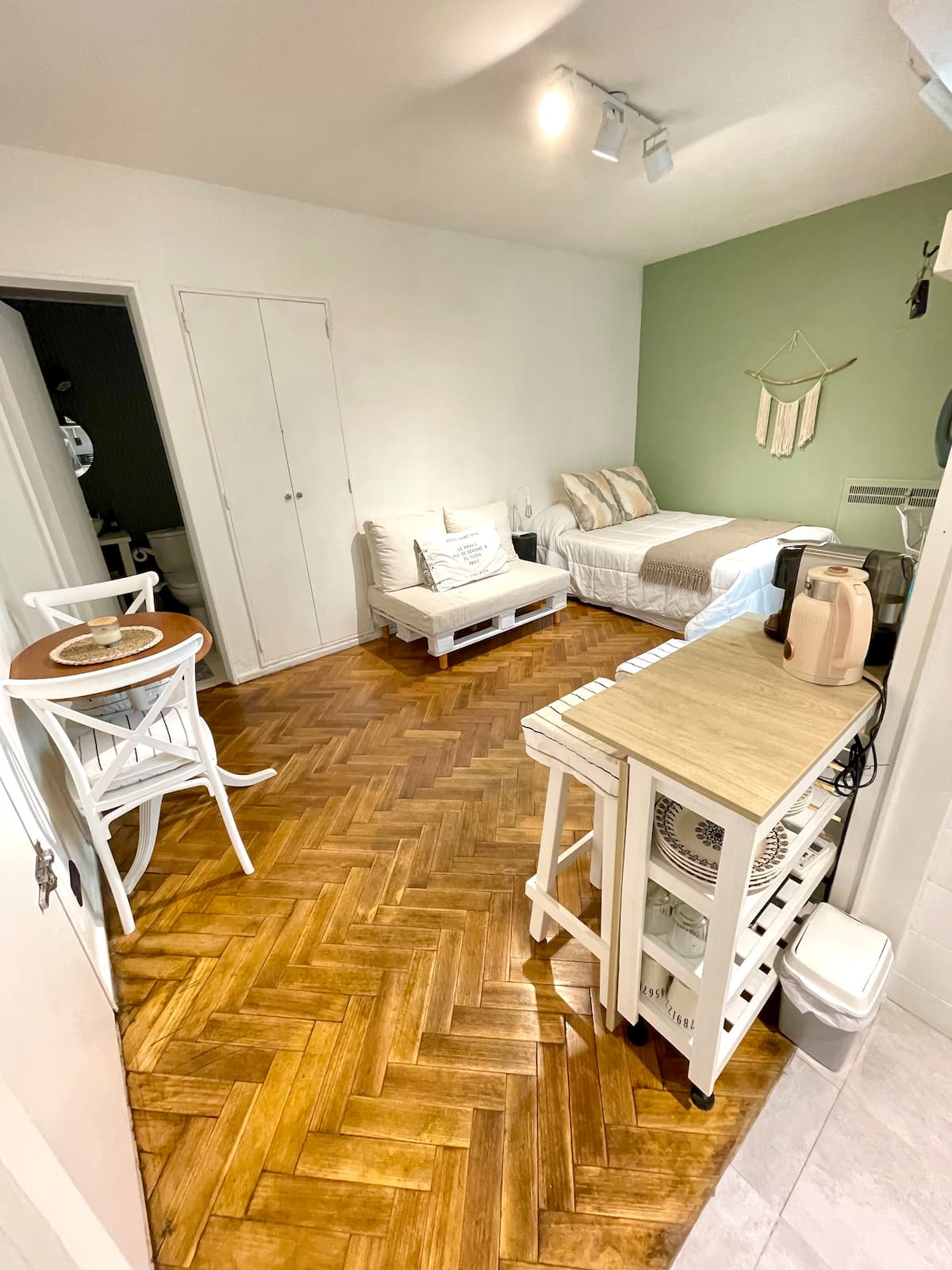 Kitnet em Recoleta, no distrito de Arenales. Unidade reformada com cozinha integrada totalmente equipada, área principal com piso de parquet e banheiro. Não tem varanda tradicional; há varanda francesa voltada para o miolo de quadra. Há boa incidência de luz natural principalmente no período da tarde.