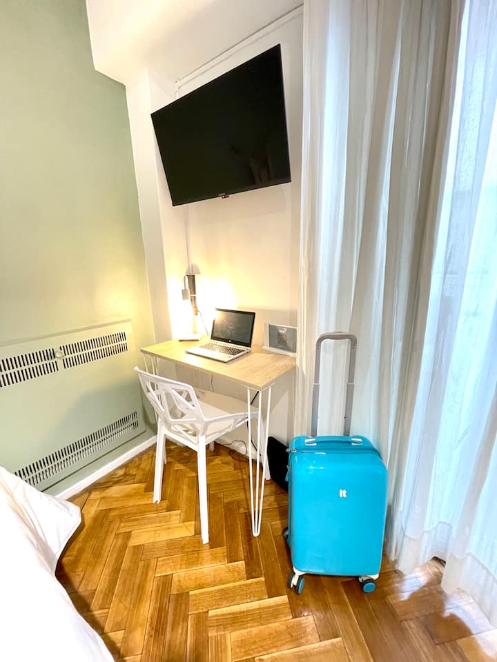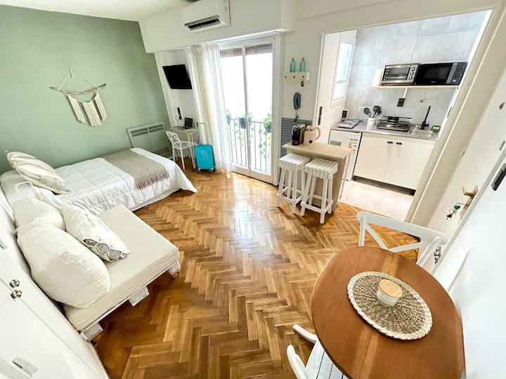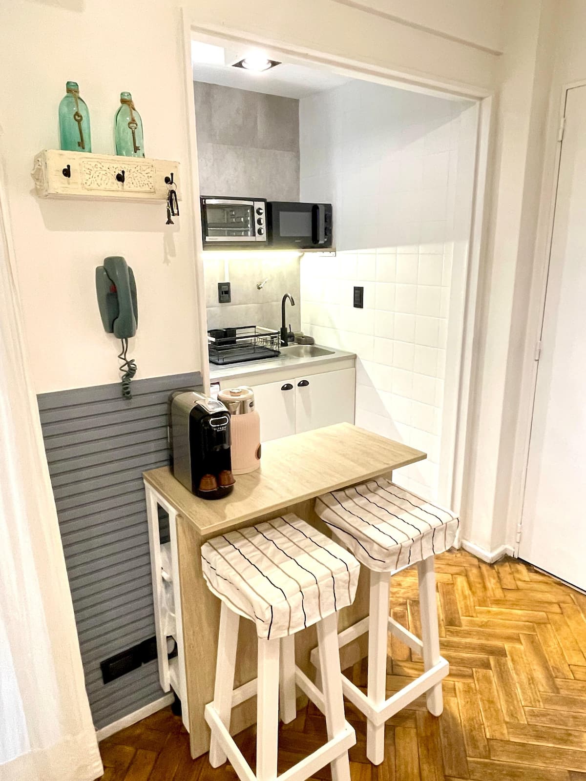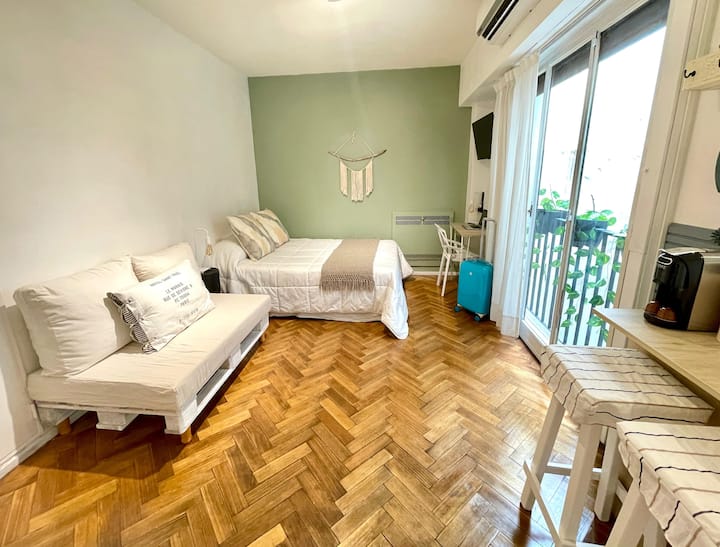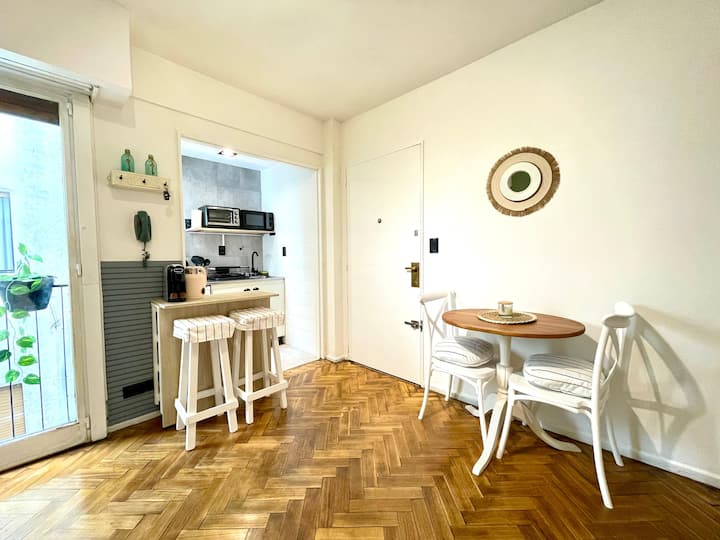 Kitnet em Recoleta, no distrito de Arenales. Unidade reformada com cozinha integrada totalmente equipada, área principal com piso de parquet e banheiro. Não tem varanda tradicional; há varanda francesa voltada para o miolo de quadra. Há boa incidência de luz natural principalmente no período da tarde.