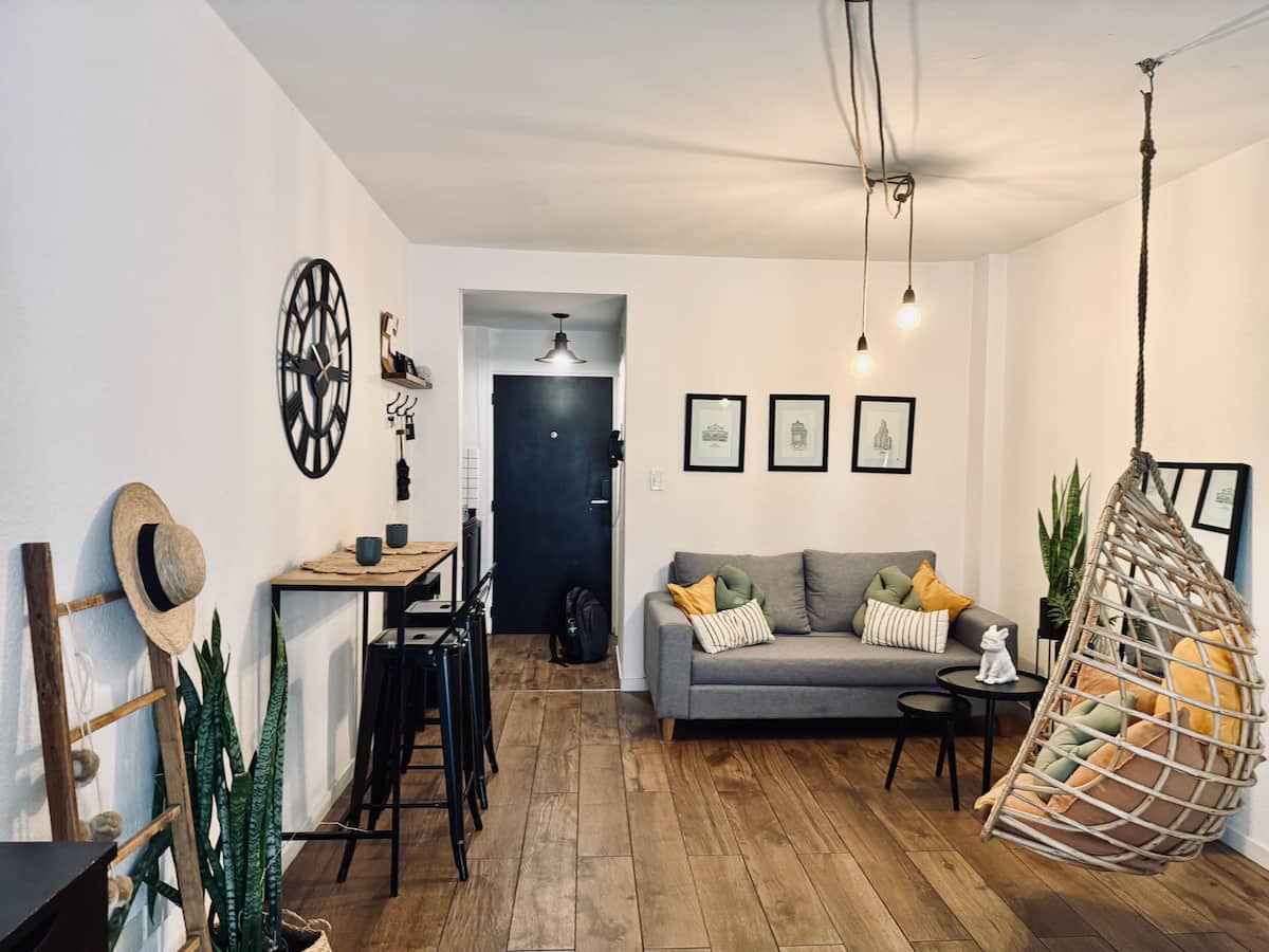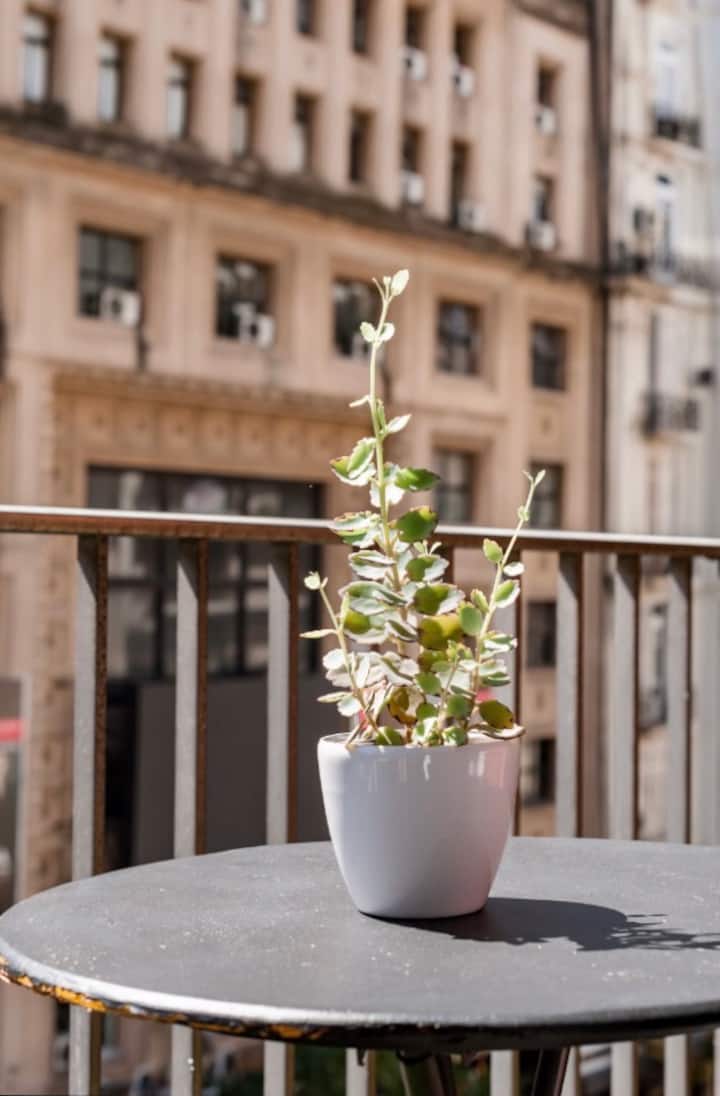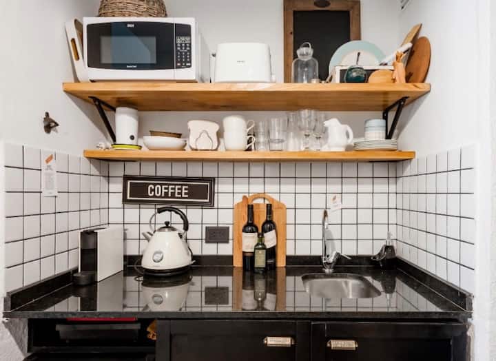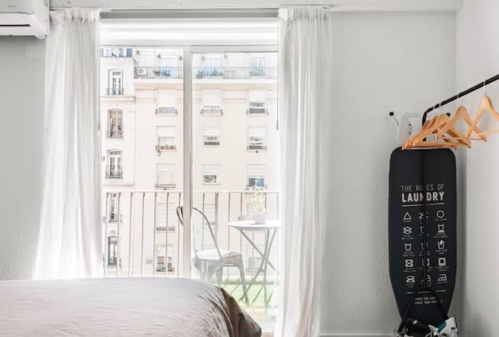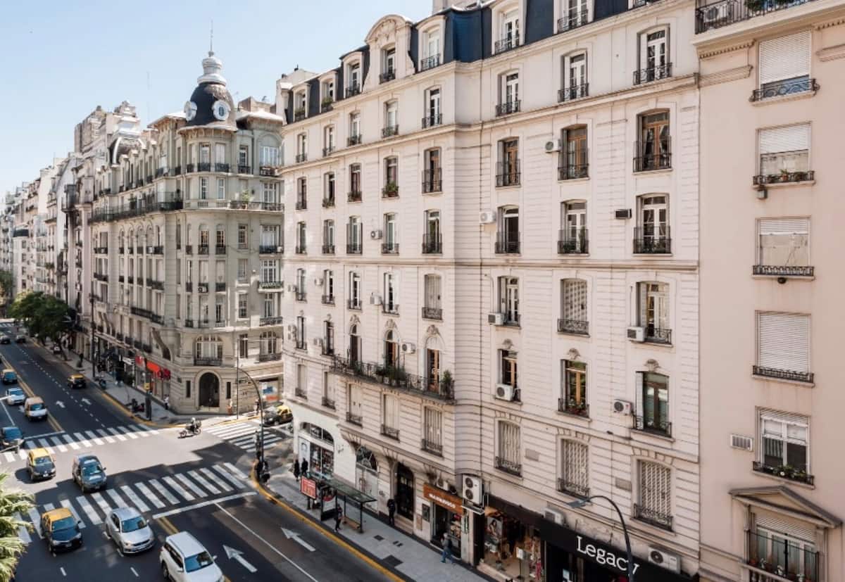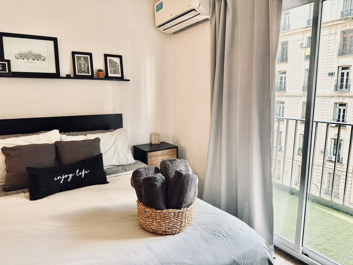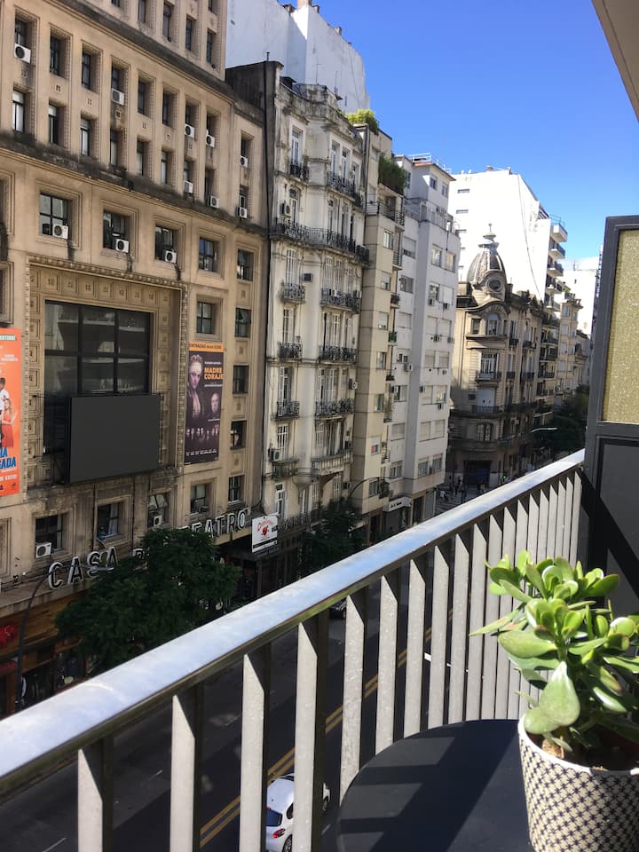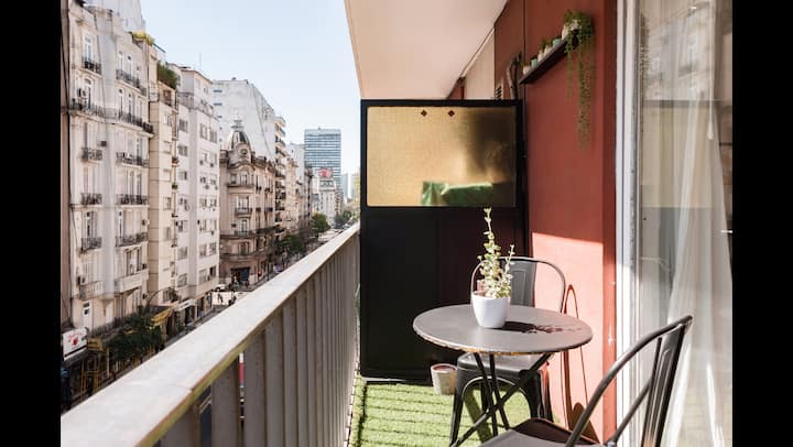 Kitnet de 32 m² em galeria da 5ª Avenida, em Av. Santa Fé, em Retiro, com vista para Casa del Teatro e varanda. Cozinha compacta com minibar, fogão, chaleira elétrica, máquina de café Nespresso e micro-ondas. Banheiro com box de chuveiro e dispenser (shampoo, condicionador e sabonete), pia e vaso sanitário. Varanda com mesa e cadeiras.