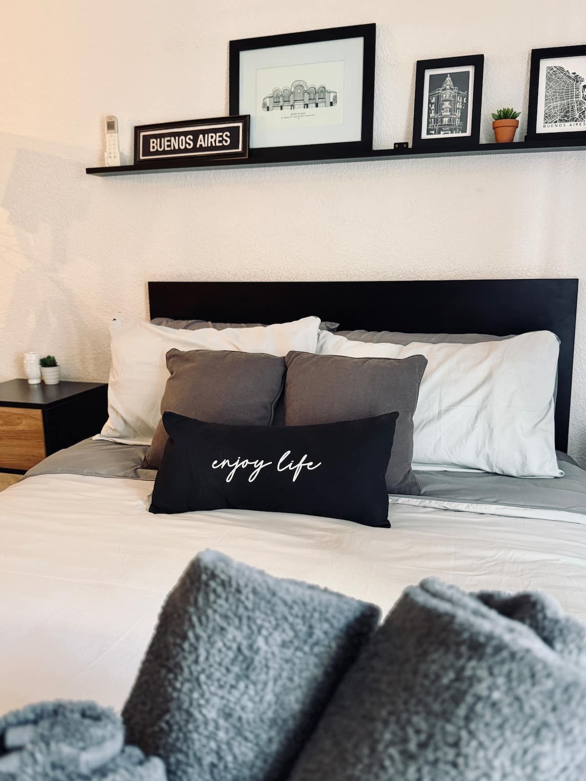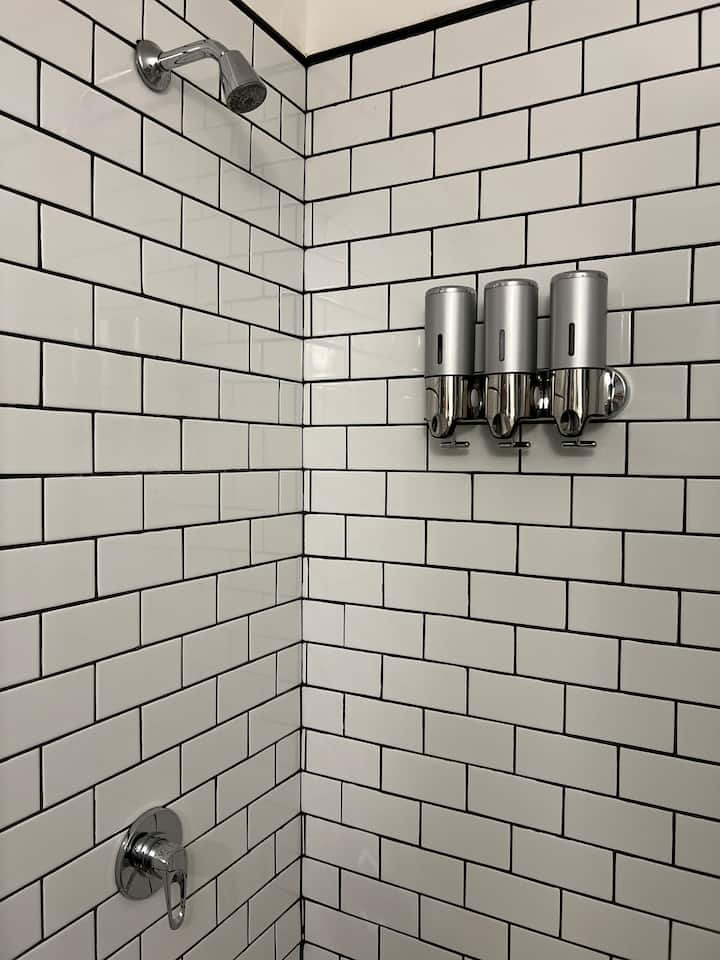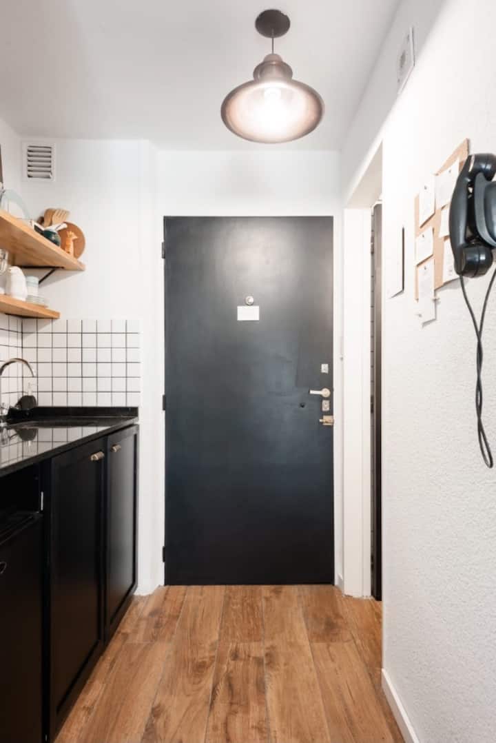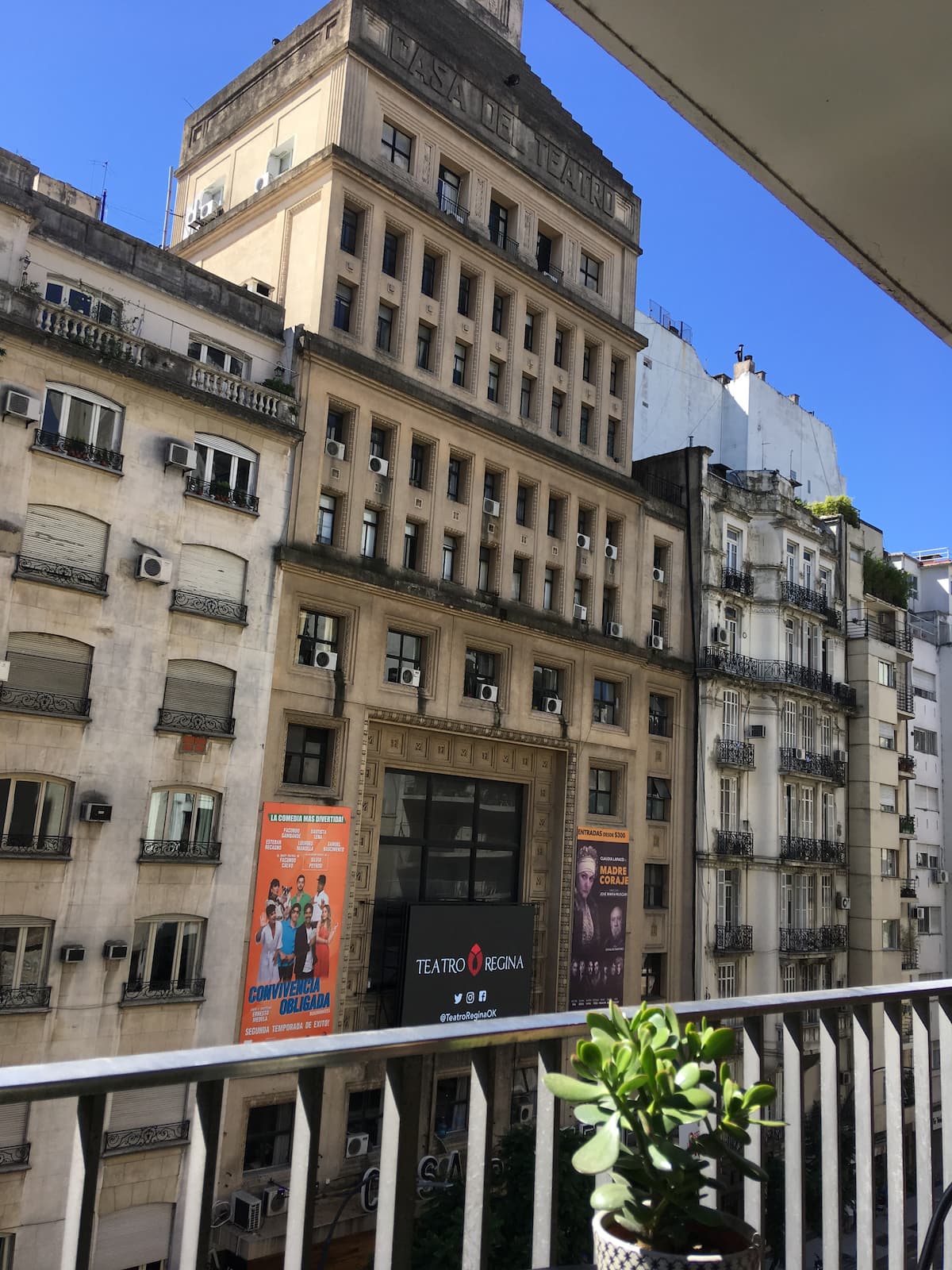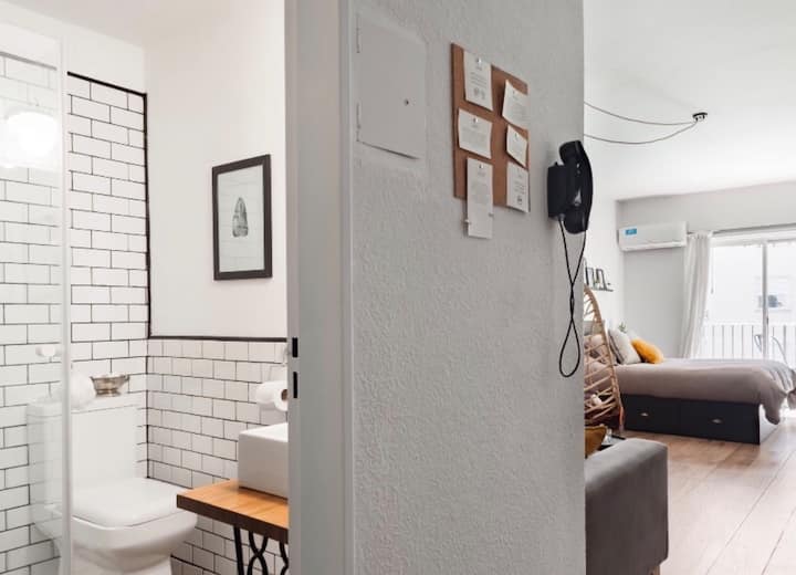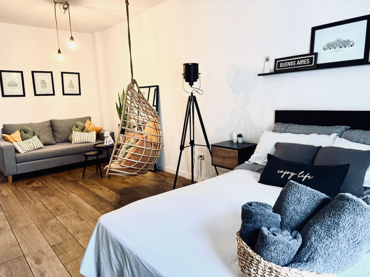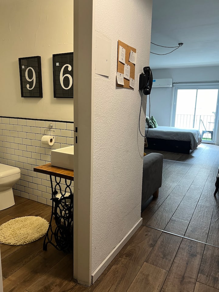 Kitnet de 32 m² em galeria da 5ª Avenida, em Av. Santa Fé, em Retiro, com vista para Casa del Teatro e varanda. Cozinha compacta com minibar, fogão, chaleira elétrica, máquina de café Nespresso e micro-ondas. Banheiro com box de chuveiro e dispenser (shampoo, condicionador e sabonete), pia e vaso sanitário. Varanda com mesa e cadeiras.