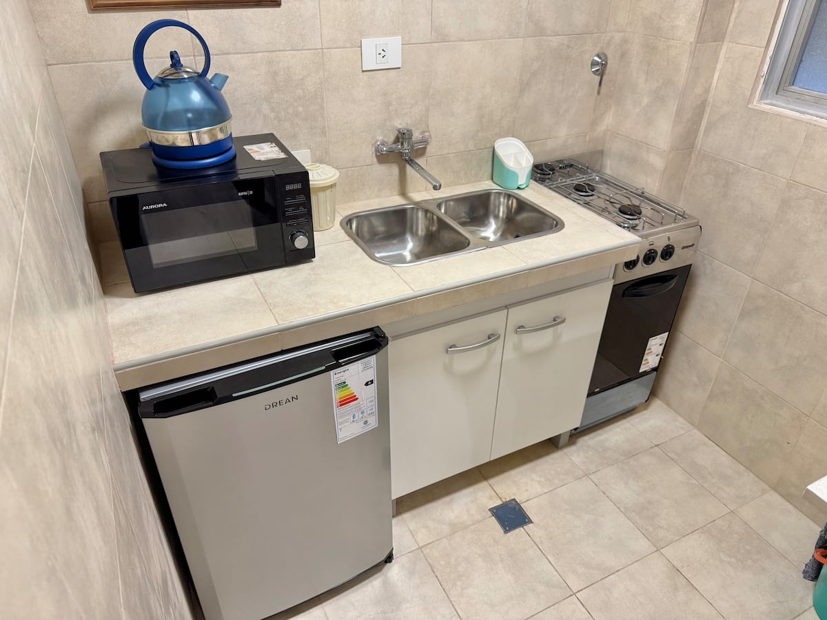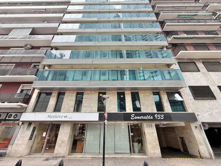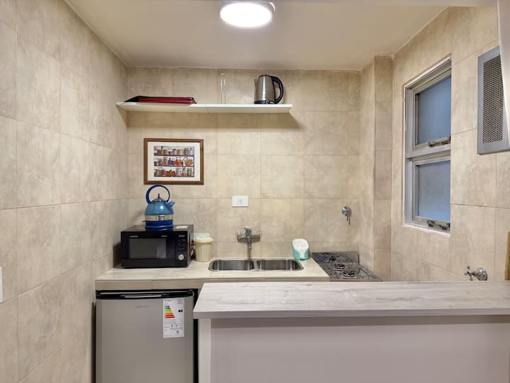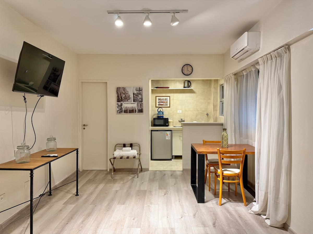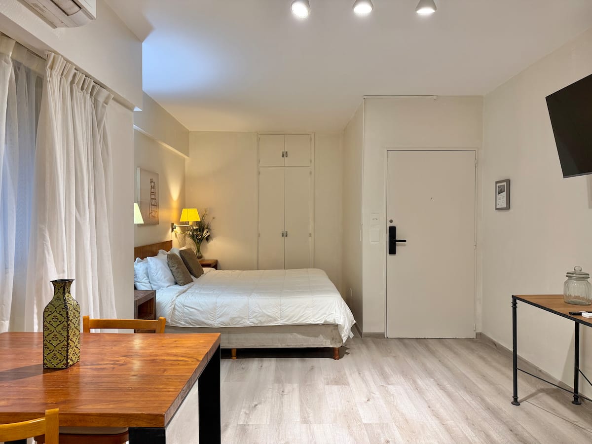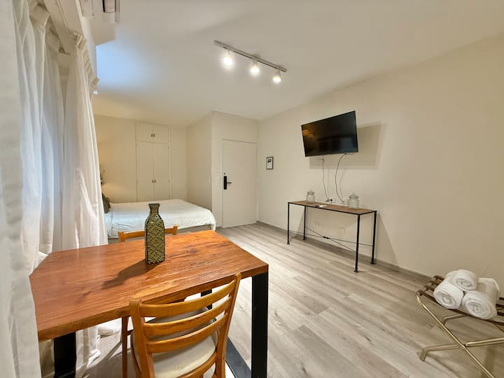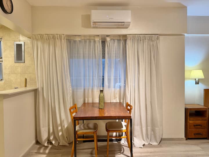 Apartamento tipo studio em Retiro, em Buenos Aires. O imóvel integra sala e área de jantar com cozinha equipada, com geladeira, forno e micro-ondas. A unidade tem ar-condicionado quente e frio, Wi-Fi de alta velocidade, TV smart e fechadura eletrônica na entrada. O banheiro foi reformado e conta com box com chuveiro, bidê e itens de higiene.