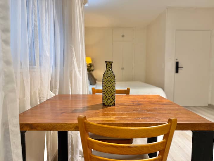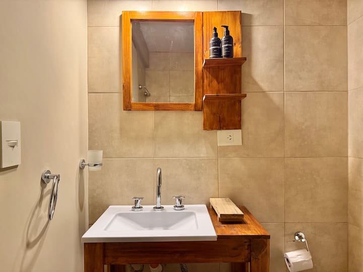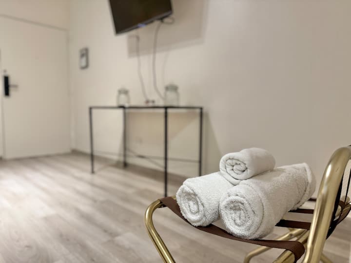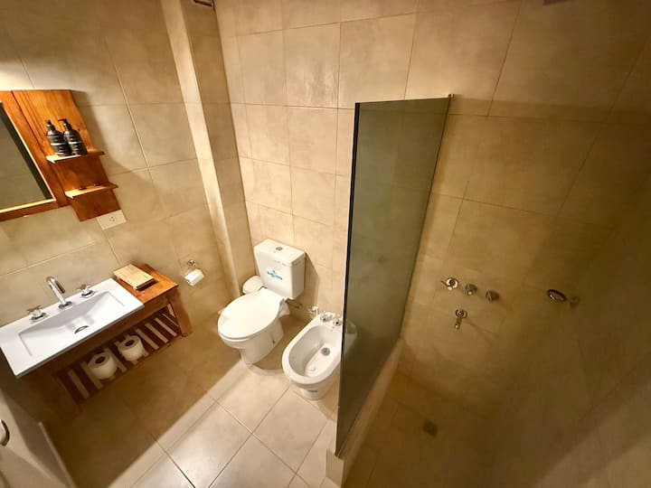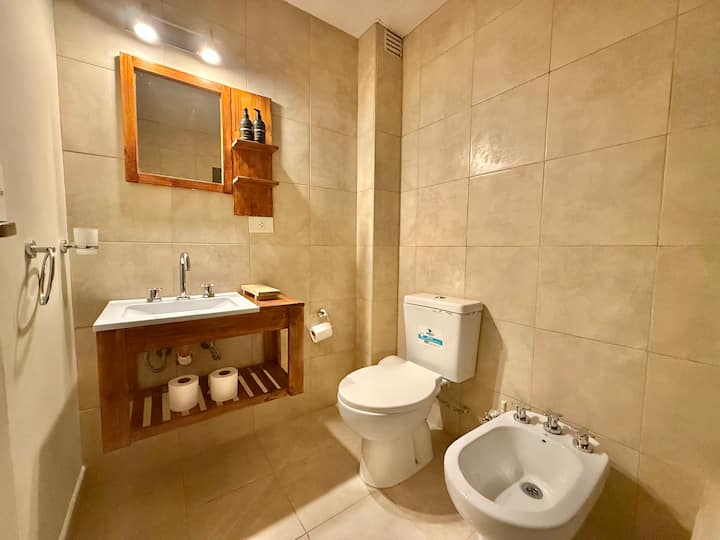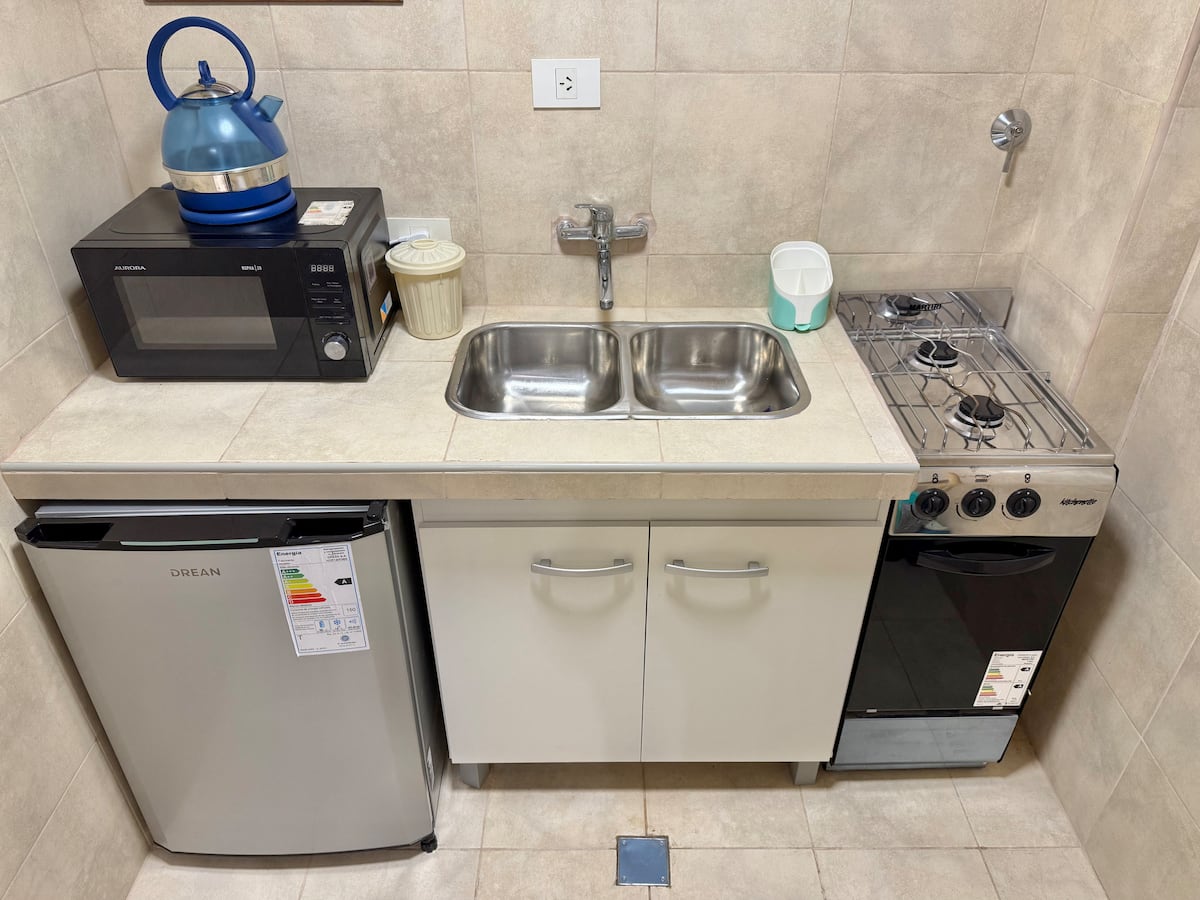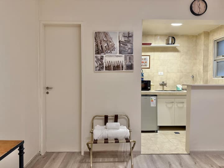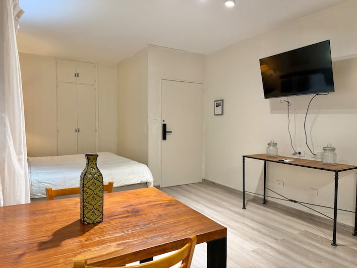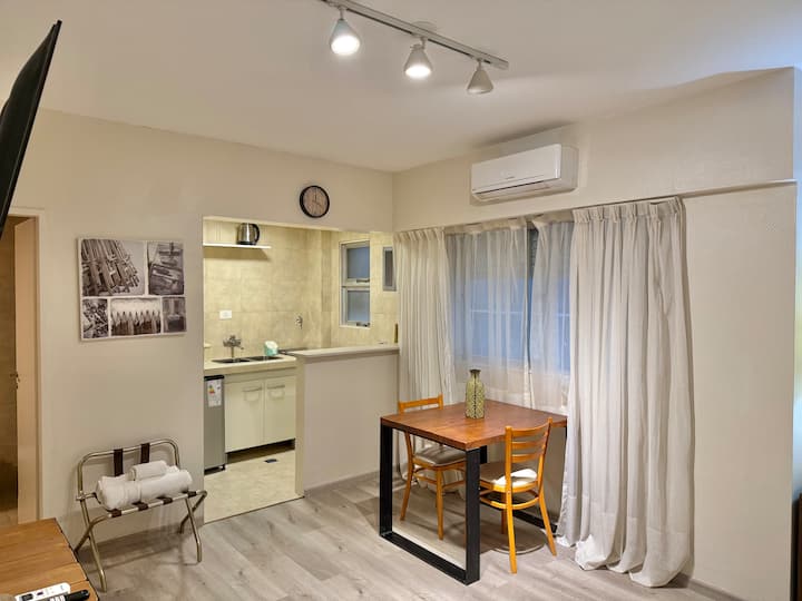 Apartamento tipo studio em Retiro, em Buenos Aires. O imóvel integra sala e área de jantar com cozinha equipada, com geladeira, forno e micro-ondas. A unidade tem ar-condicionado quente e frio, Wi-Fi de alta velocidade, TV smart e fechadura eletrônica na entrada. O banheiro foi reformado e conta com box com chuveiro, bidê e itens de higiene.