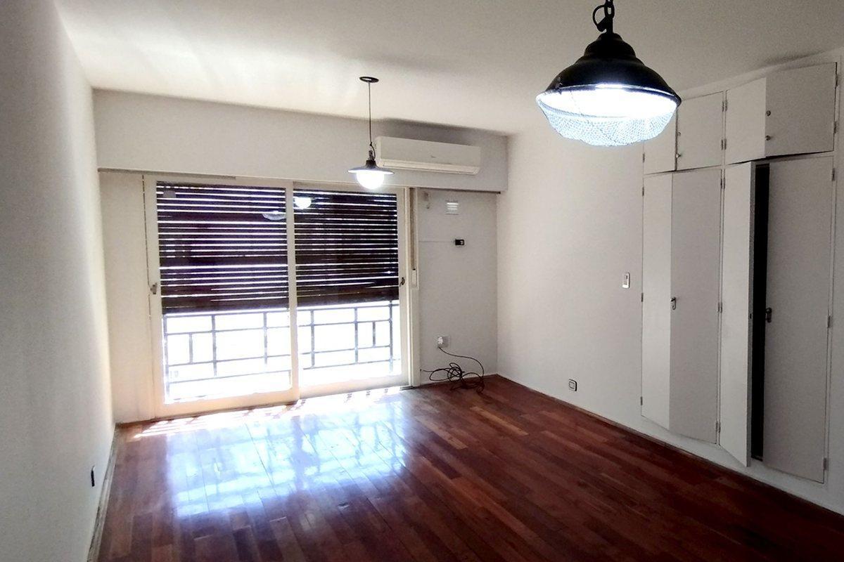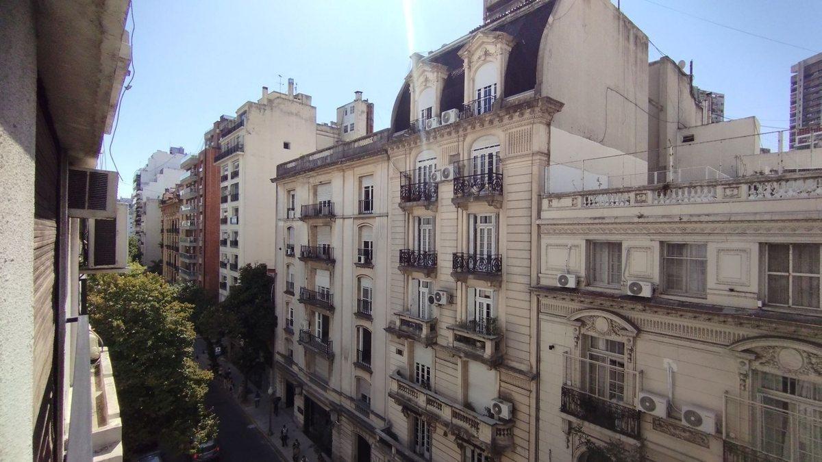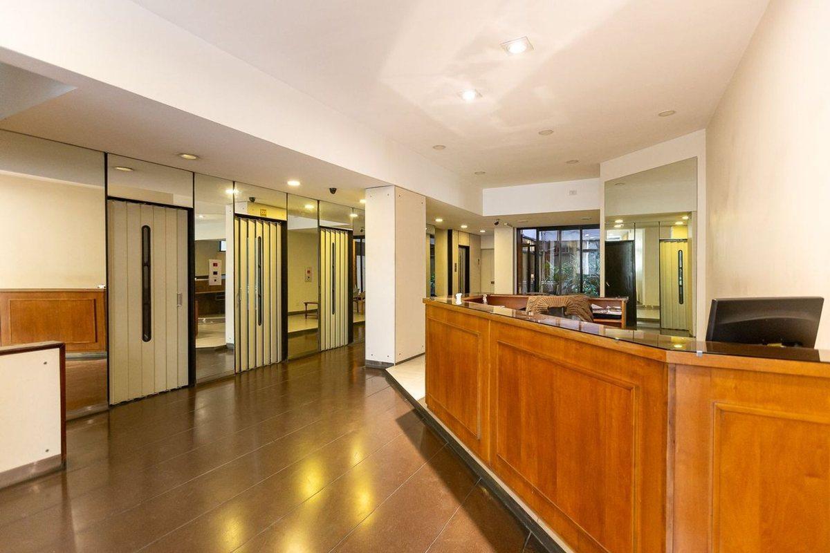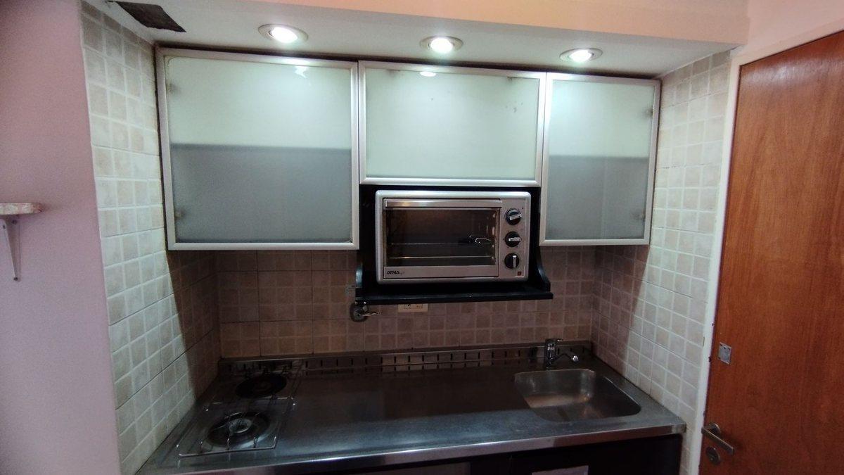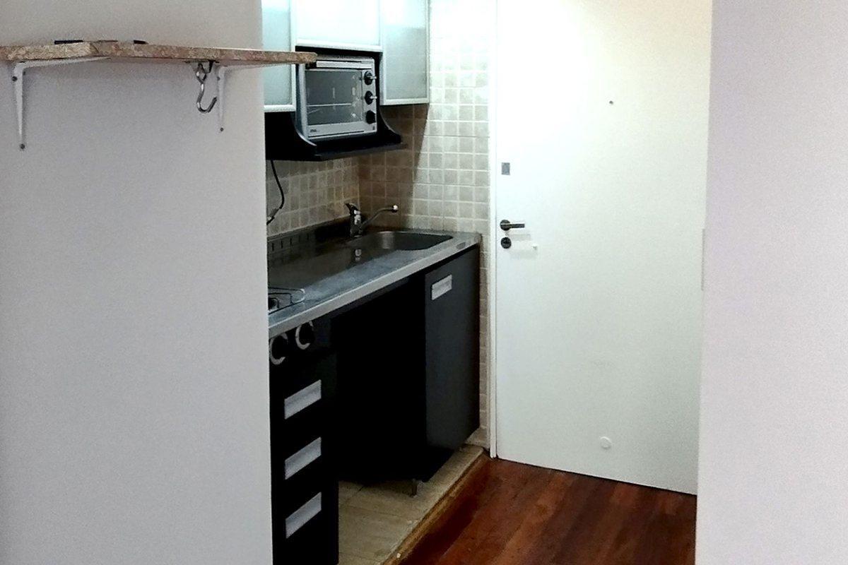 Kitnet para alugar com 29 m² no 5º andar, voltada para o norte. O apartamento fica na rua Juncal, entre Suipacha e Esmeralda, com janela tipo varanda francesa, piso de parquet, cozinha integrada (kitchenette) e banheiro completo com acessórios. Conta com ar-condicionado frio-calor, armário embutido e espelho de corpo inteiro, entregue recém-pintado. O prédio tem 3 elevadores, zelador com residência e serviços de eletricidade, água e gás. Apto para uso profissional; não são aceitos animais. Exige