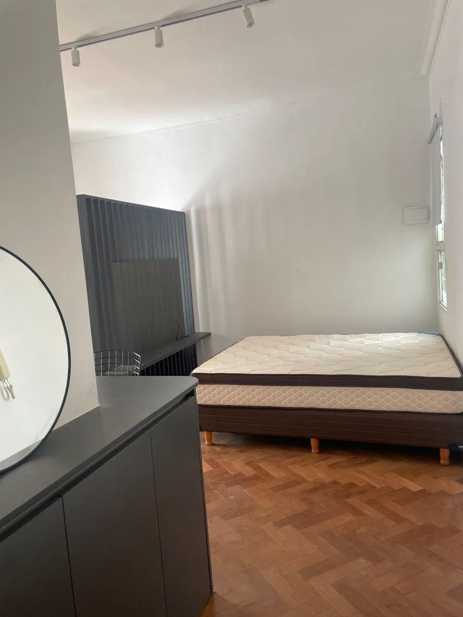 Kitnet de 1 dormitório, mobiliada e equipada, com 38,7 m² totais e varanda de 5,20 m². Fica em andar alto, de frente para a rua. Cozinha integrada ao living, 1 banheiro completo com banheira e bidê. Imóvel recém-reformado, com serviço de portaria em prédio de estilo francês com elevador e 7 andares.
