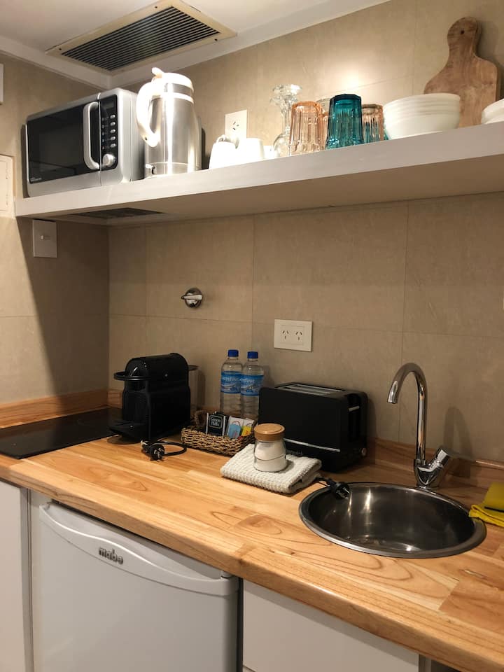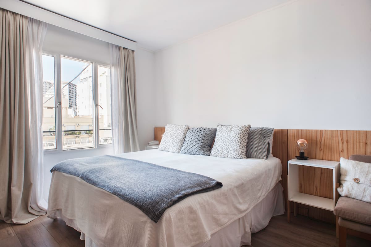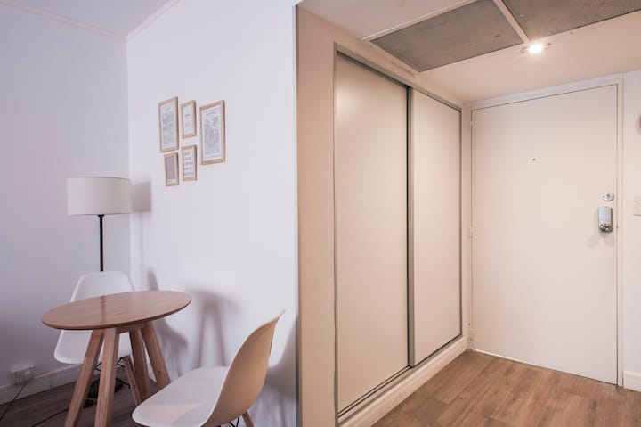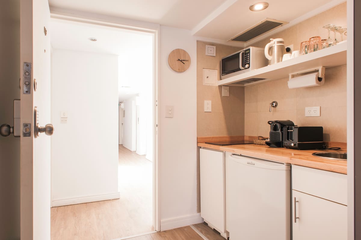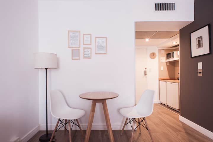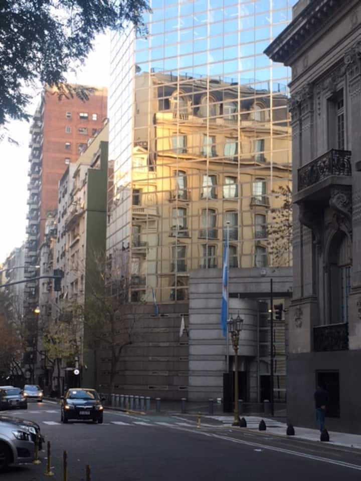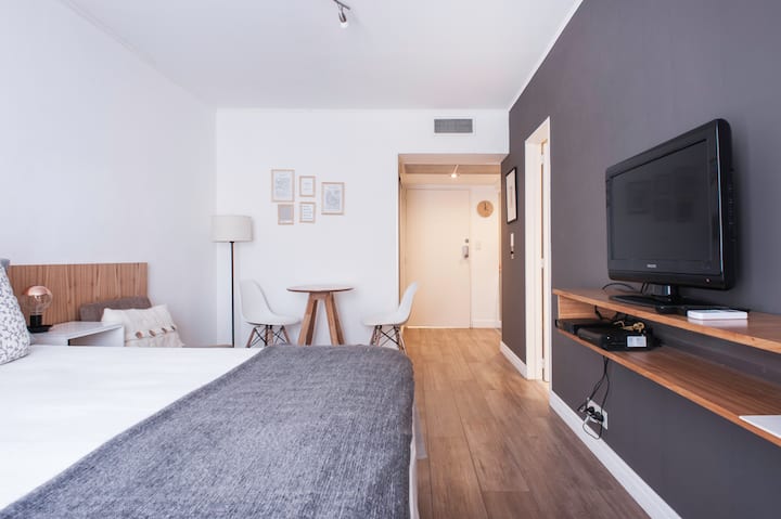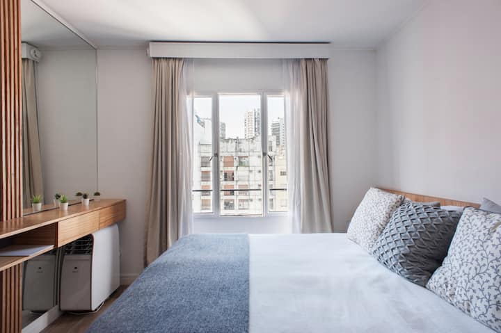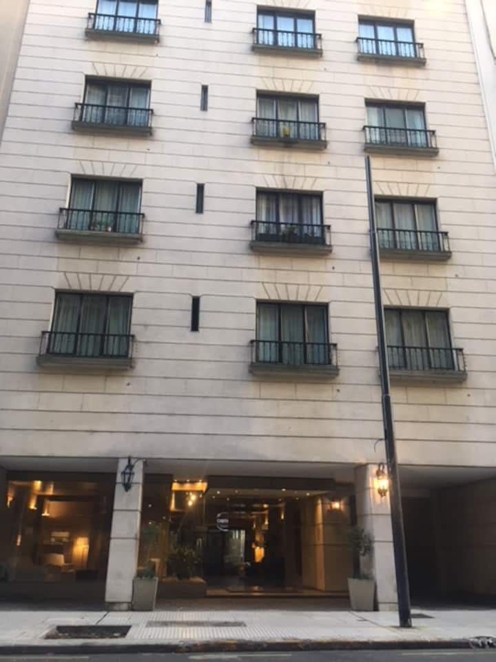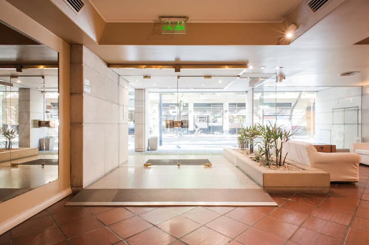 Studio em Buenos Aires, em Retiro, com 24h de segurança. Fica a poucos passos da Plaza San Martin e a cerca de 5 minutos a pé da Estação Central de Trem e Ônibus de Retiro, da Florida Peatonal e da estação de metrô. O apartamento tem kitchenette com máquina de café Nespresso, torradeira, micro-ondas e chaleira elétrica; cama king-size, TV LED de 32" com canais a cabo, além de cofre eletrônico e fechadura com código. O edifício oferece academia, espaço de co-working com Wi-Fi gratuito e pátio; no
