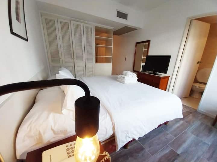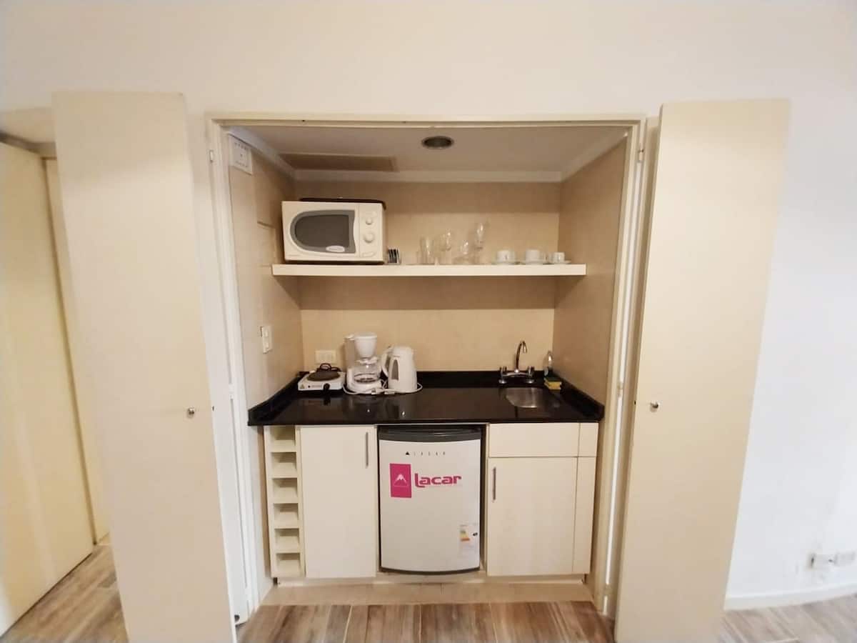 Apartamento tipo studio no 6º andar, de frente para a rua, com vista para a Av./Arenales 855, no bairro Retiro. Imóvel totalmente mobiliado, com piso em porcelanato, banheiro completo, cozinha compacta para preparo de refeições (com geladeira e micro-ondas) e ar-condicionado, além de aquecimento central. O prédio oferece área comum, academia, sala de usos múltiplos (SUM) e lavanderia de uso exclusivo dos moradores do imóvel alugado. Inclui cama queen, área de estar com sofá-cama, secador de cabe