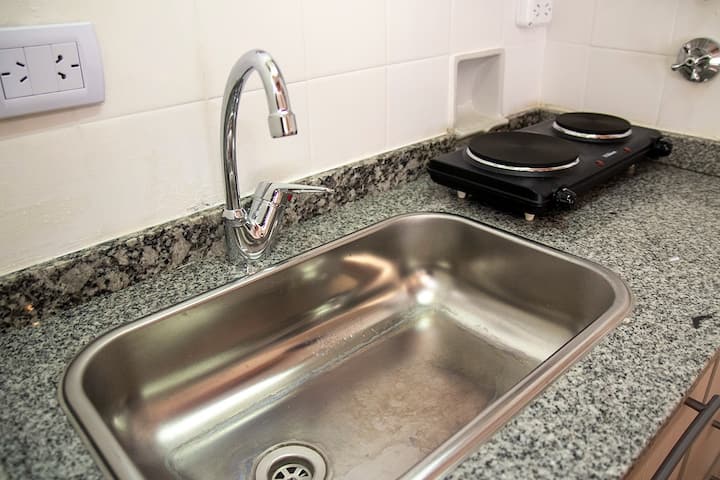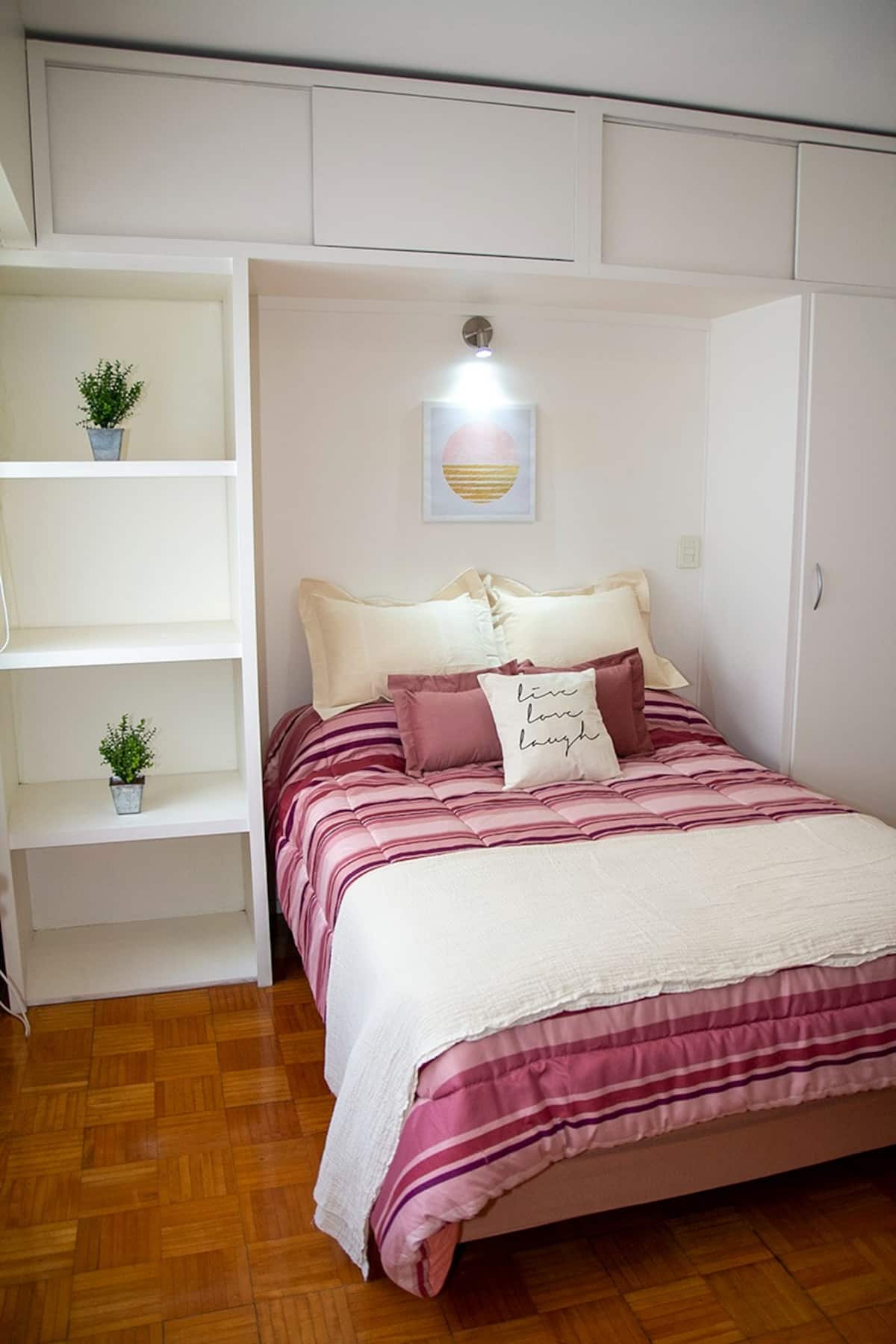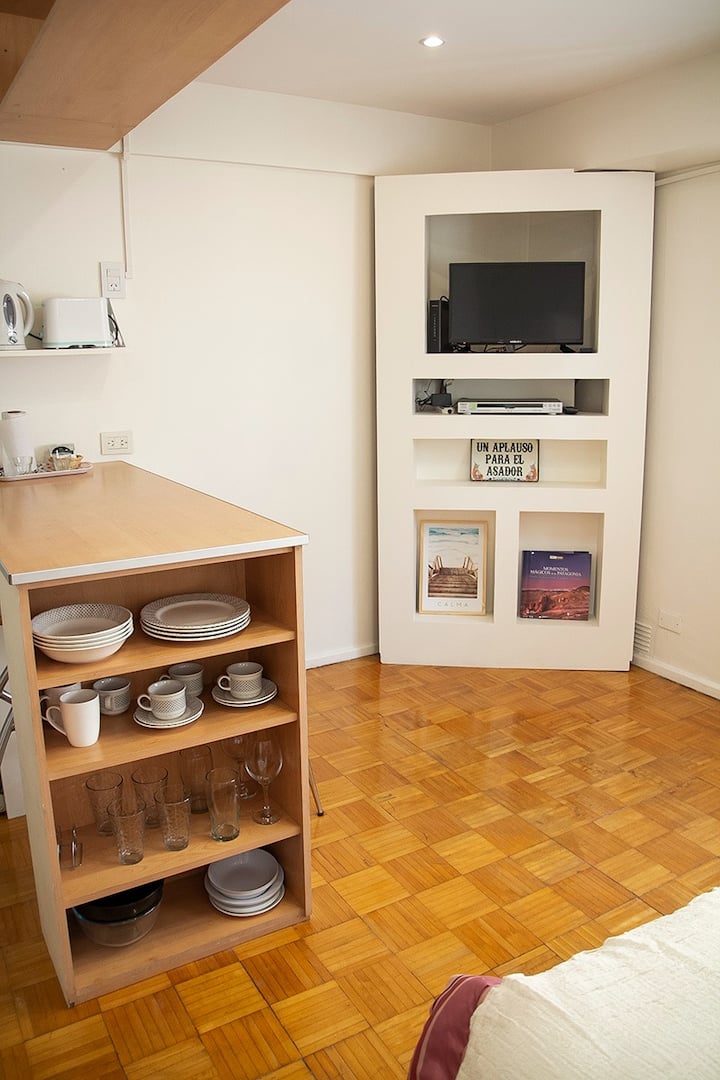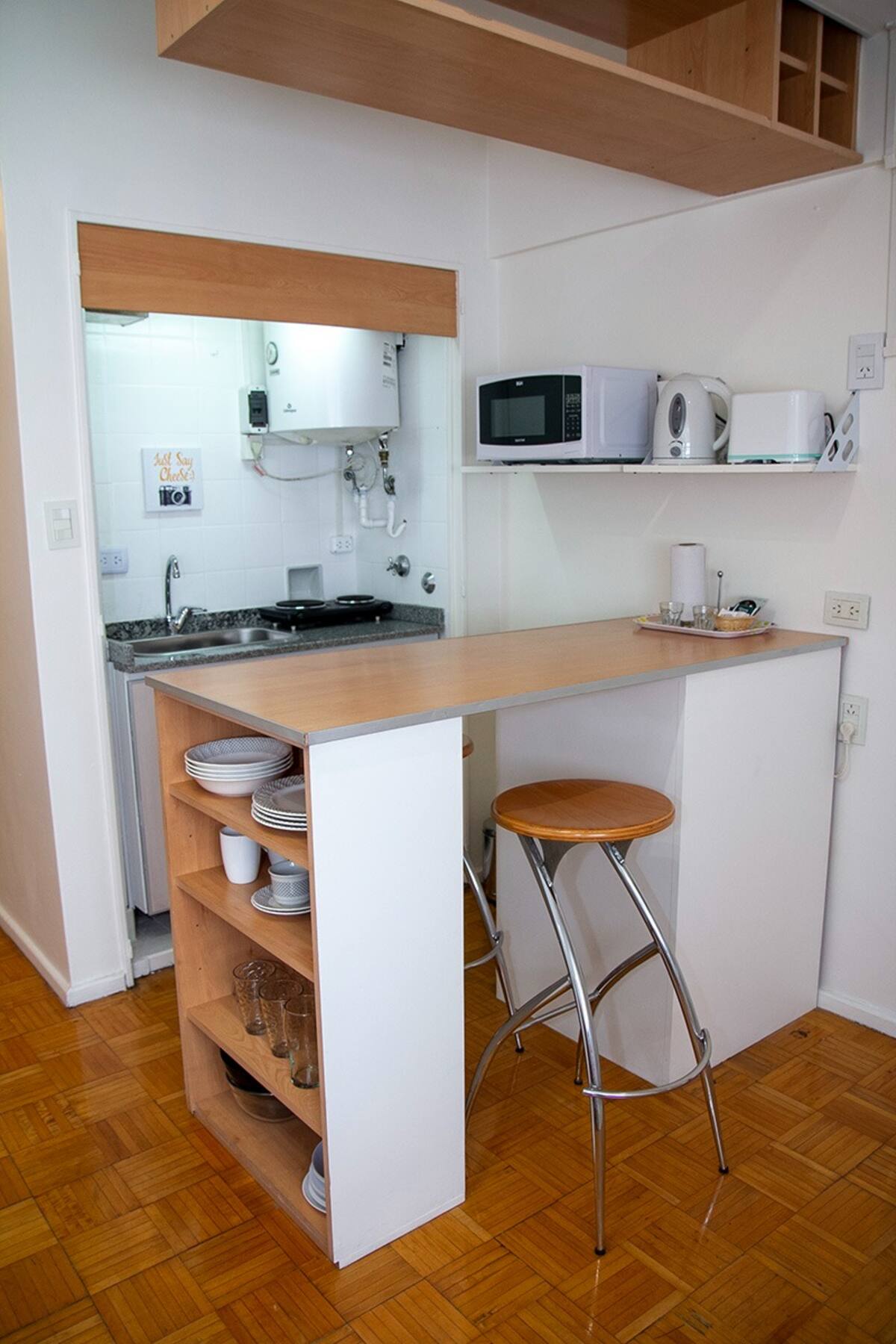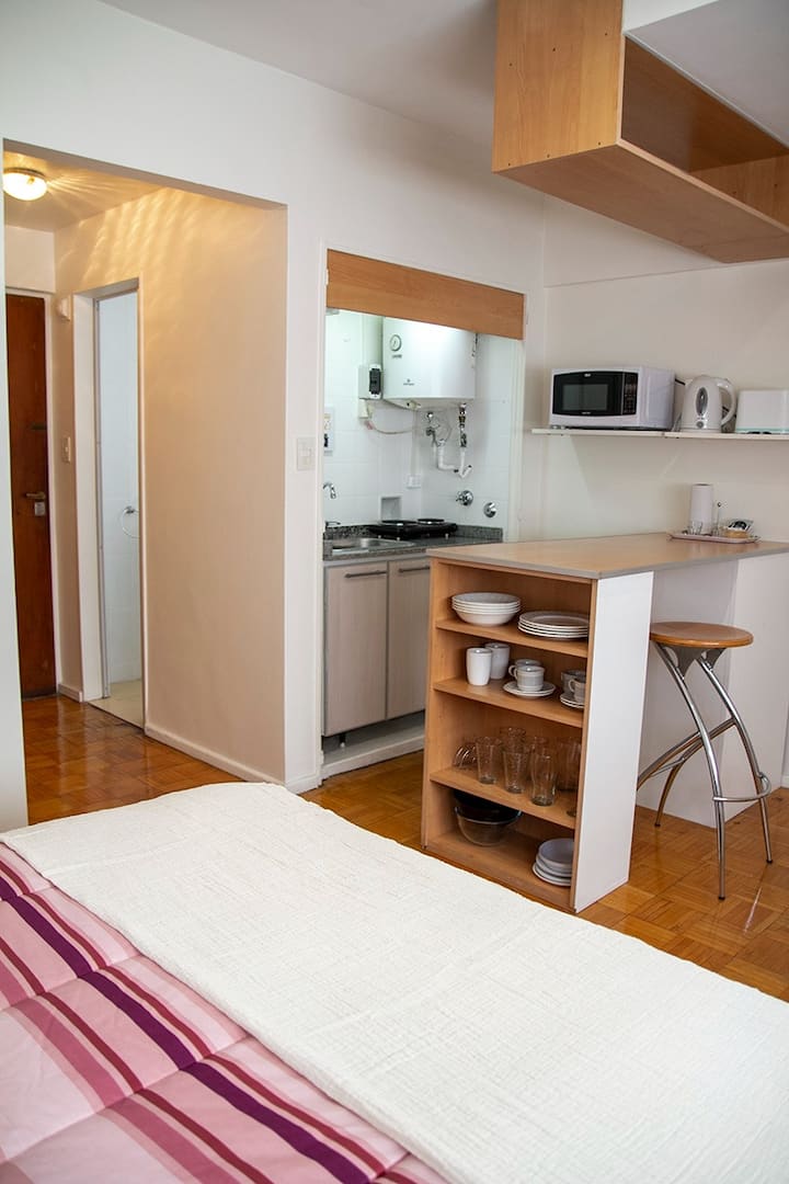 Kitnet em prédio antigo em Retiro, com vista para cúpulas francesas. Fica a poucos metros do Obelisco, do Teatro Colón, da Plaza San Martín, da Calle Florida e das Galerías Pacífico. A cerca de 250 metros há uma estação de metrô e, a 50 metros, linhas de ônibus para outras áreas de Buenos Aires.
